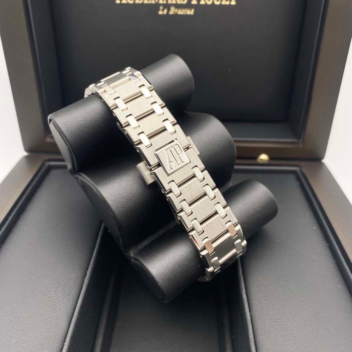 Smoked blue dial with “Petite Tapisserie” pattern, white gold applied hour-markers and Royal Oak hands with luminescent coating.