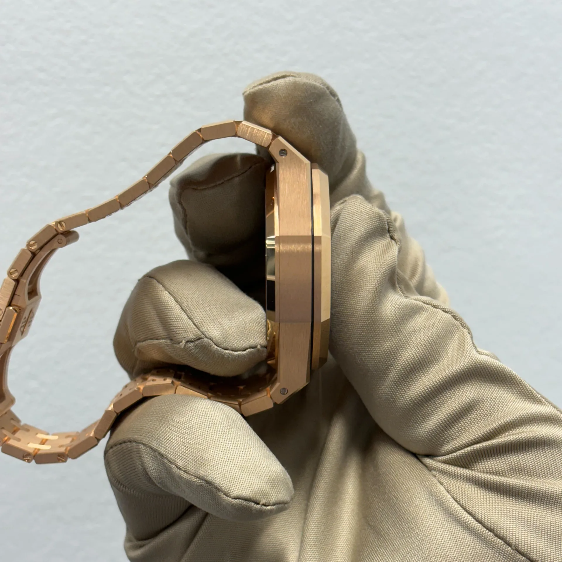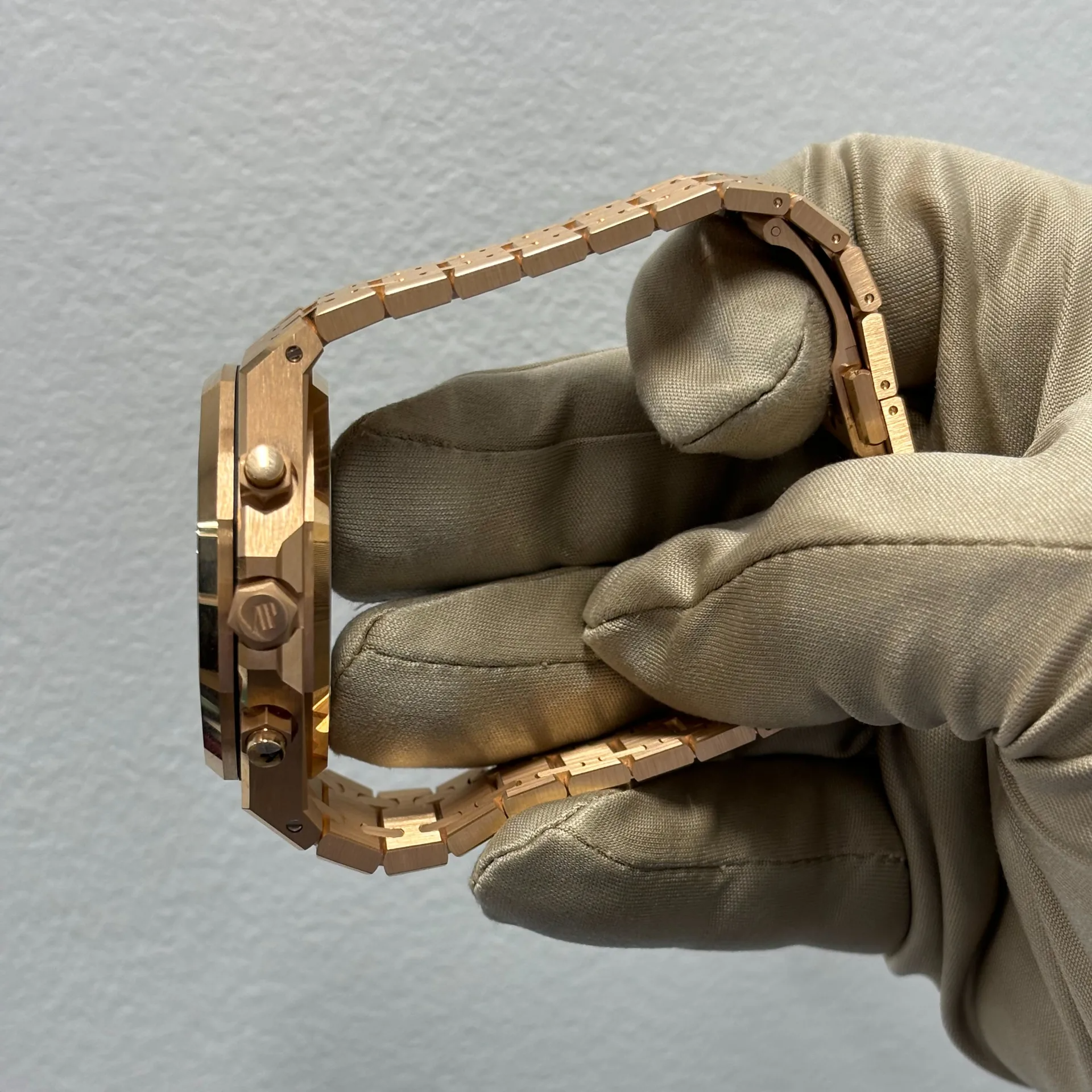 “Bleu nuit nuage 50” dial with “Grande Tapisserie” pattern, “Bleu nuit nuage 50” counters, pink gold applied hour-markers and Royal Oak hands with luminescent coating.