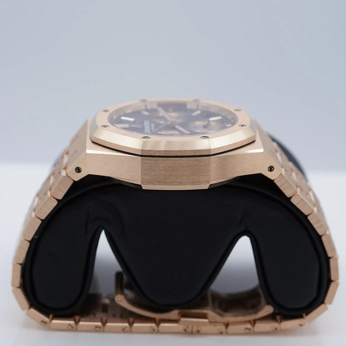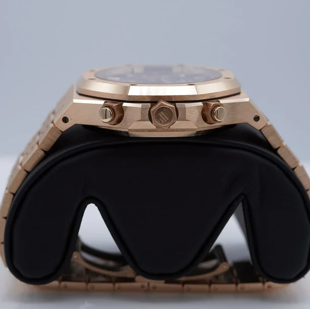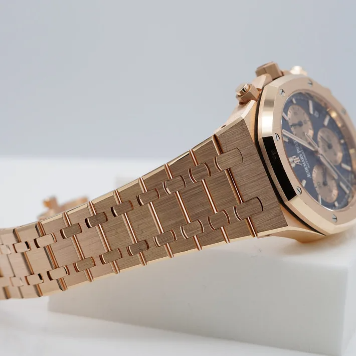 Blue dial with “Grande Tapisserie” pattern, pink gold-toned counters, pink gold applied hour-markers and Royal Oak hands with luminescent coating