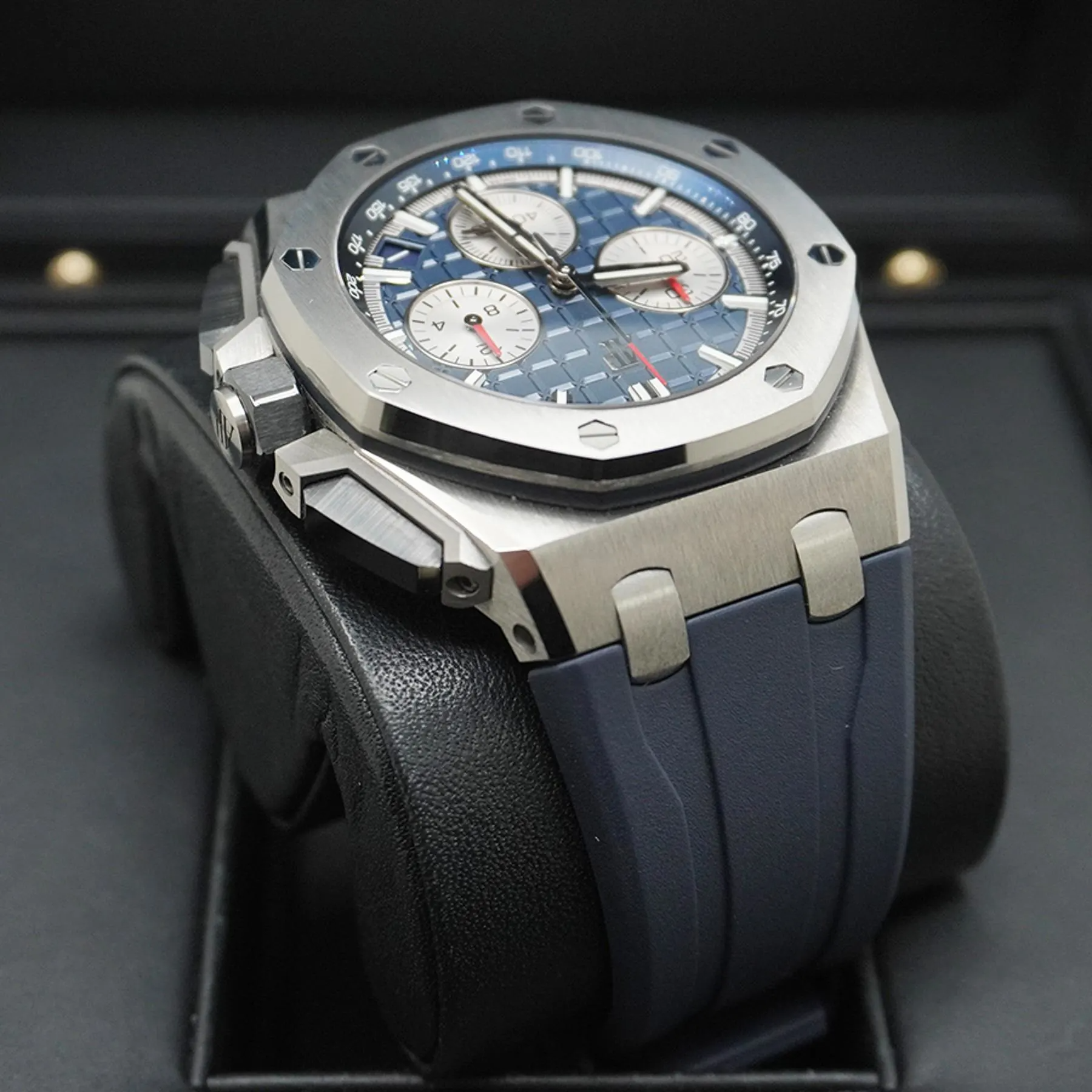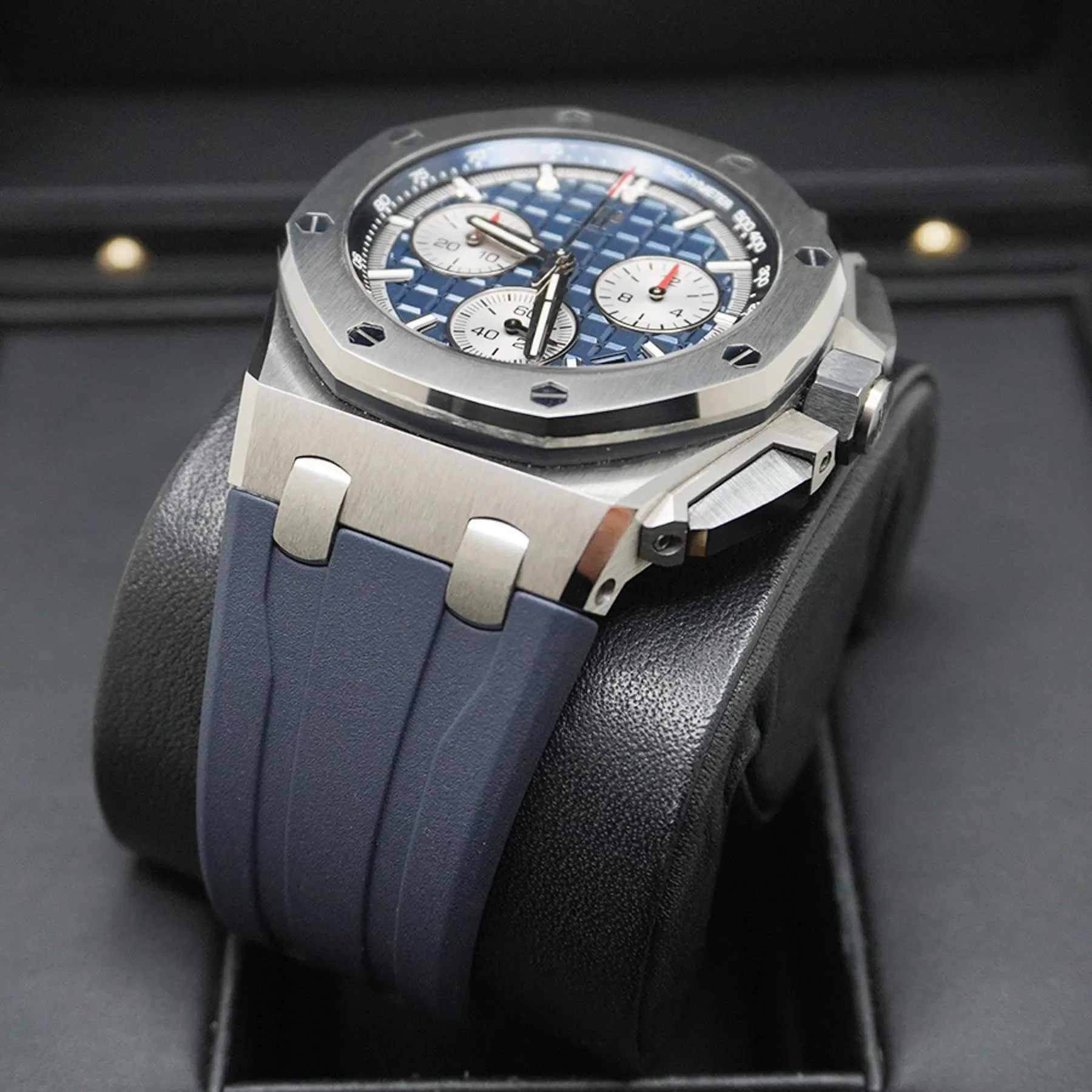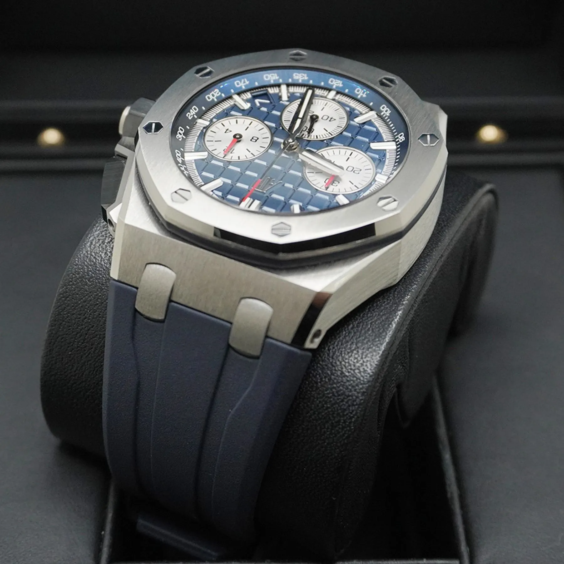 Blue dial with “Méga Tapisserie” pattern, rhodium-toned counters and external zone, white gold applied hour-markers and Royal Oak hands with luminescent coating, blue inner bezel