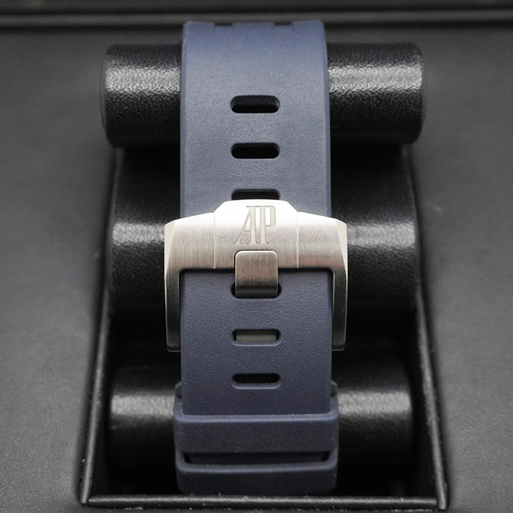 Blue rubber strap with titanium pin buckle and interchangeable strap system. Additional black rubber strap