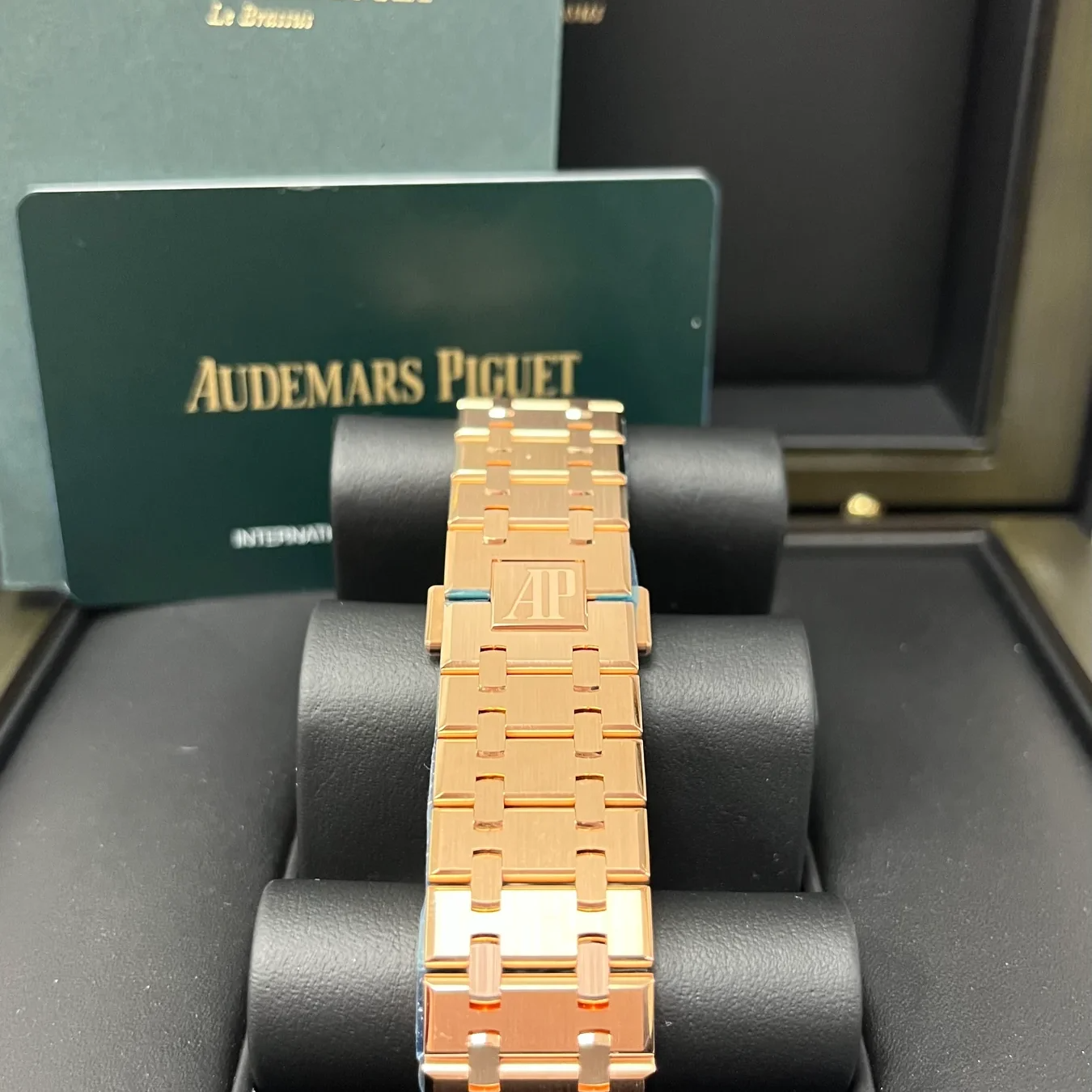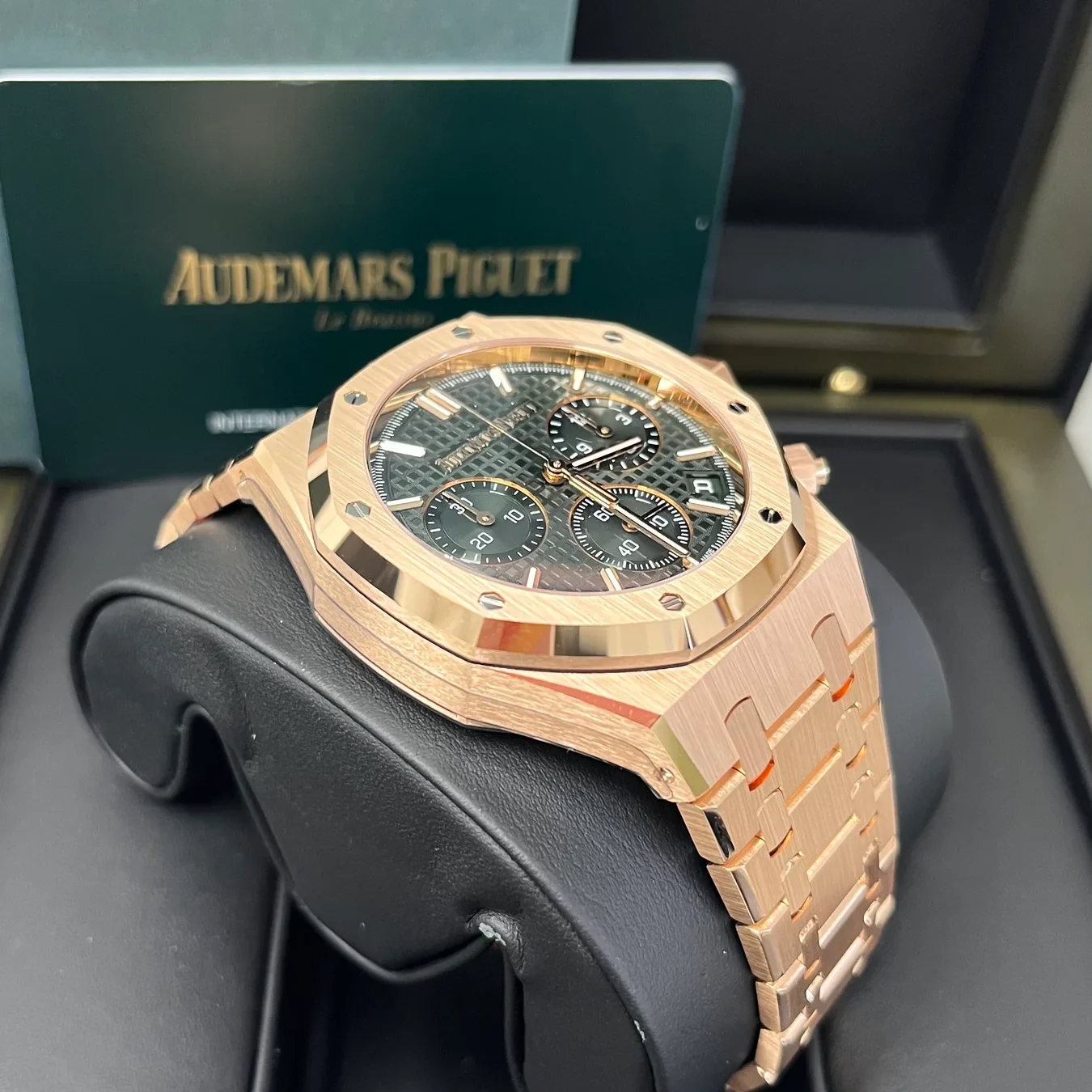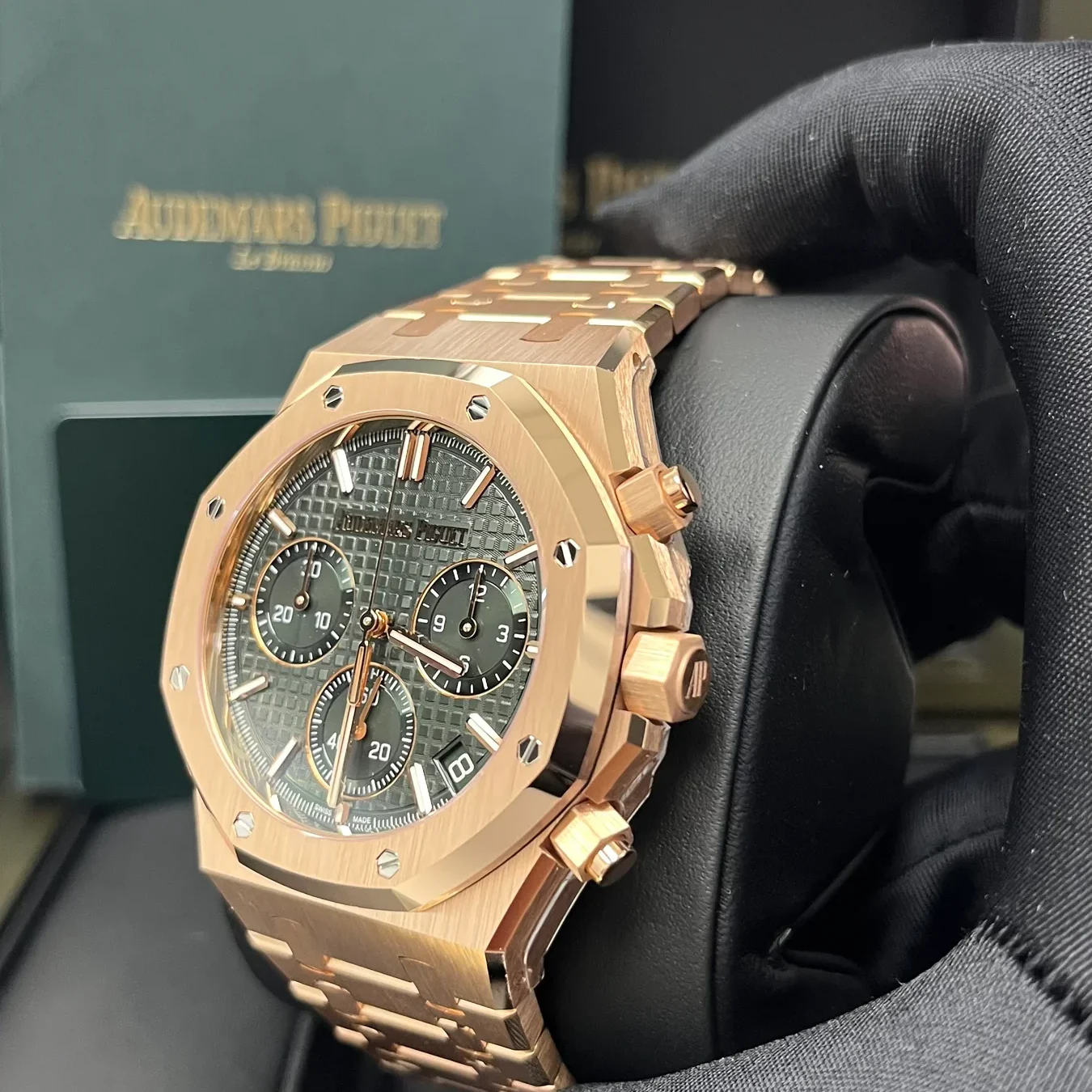 Khaki green dial with “Grande Tapisserie” pattern, khaki green counters, pink gold applied hour-markers and Royal Oak hands with luminescent coating.