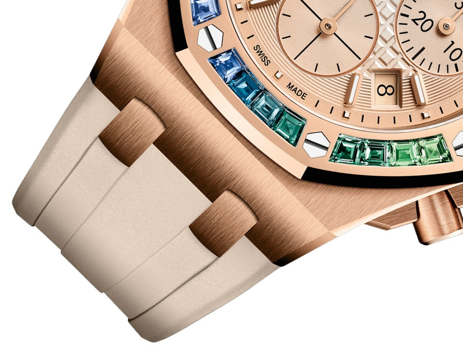 Unworn Audthtemars Pigthtuet Royal Oak Offshore SELFWINDING CHRONOGRAPH 26236OR.YY.D085CA.01. 37 mm, Smoked pink gold-toned dial with “Lady Tapisserie” pattern, pink gold-toned counters, pink gold applied hour-markers and Royal Oak hands with luminescent coating, 18-carat pink gold case, glareproofed sapphire crystal, bezel set with baguette-cut “rainbow-coloured” sapphires, 18-carat pink gold pushpieces and screw-locked crown, 2385 calibre, Selfwinding movement, 40 h power reserve, 37 jewels,  Beige rubber strap with AP folding clasp. Water resistant to 50 m.