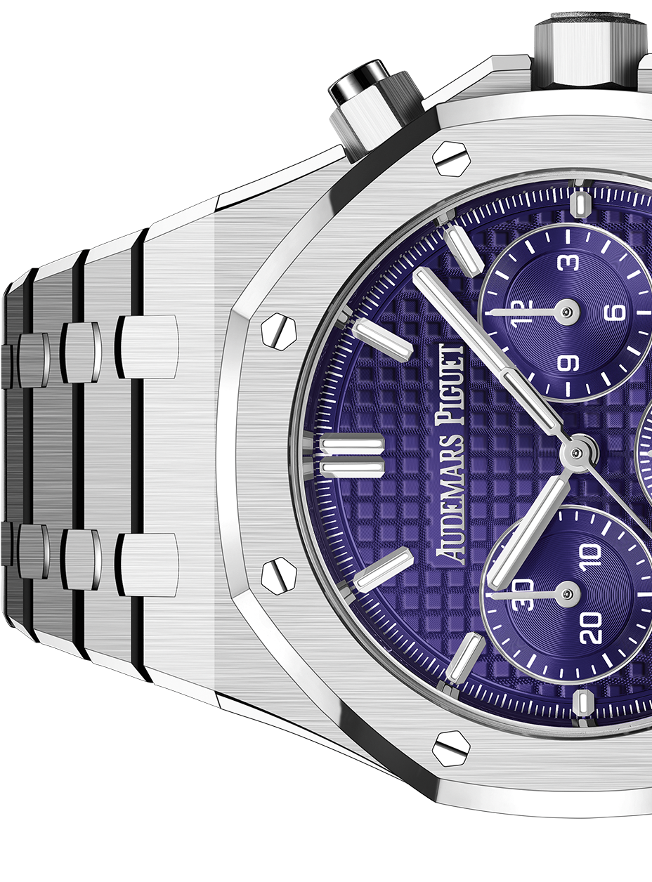 Purple dial with “Grande Tapisserie” pattern, purple counters, white gold applied hour-markers and Royal Oak hands with luminescent coating.