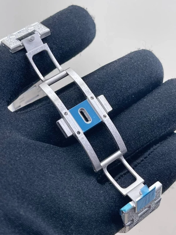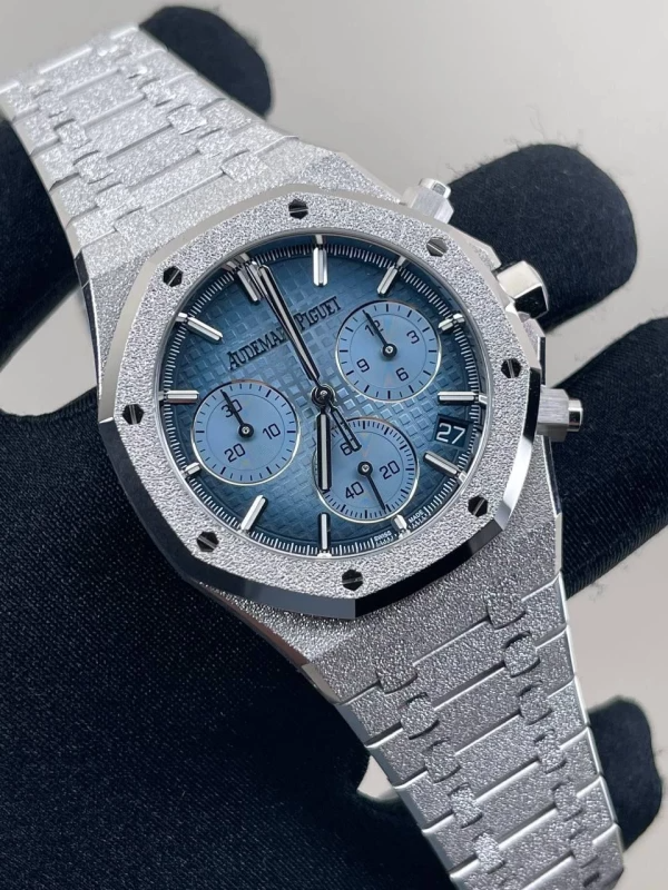 Smoked blue dial with “Grande Tapisserie” pattern, light blue counters, white gold applied hour-markers and Royal Oak hands with luminescent coating.