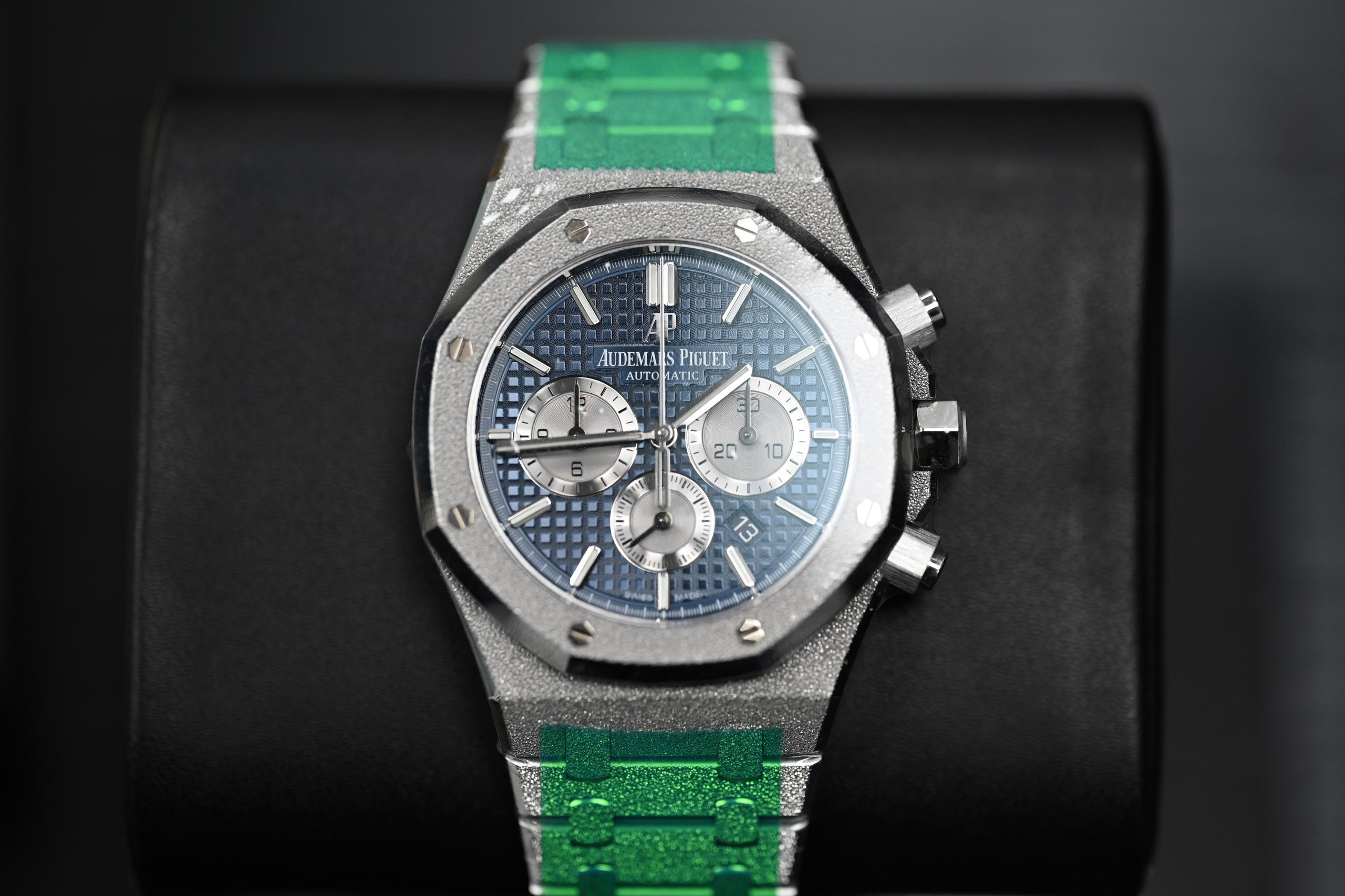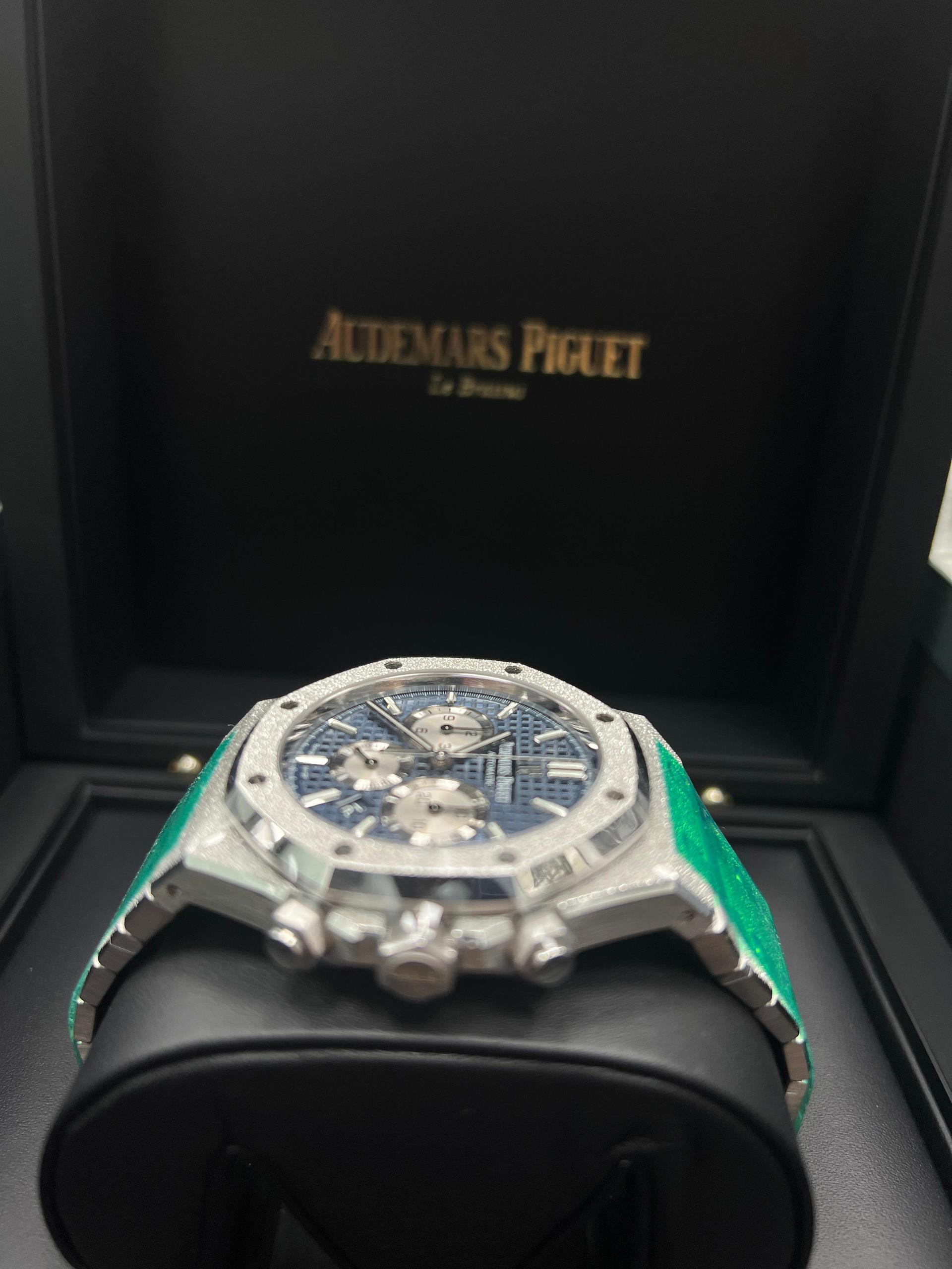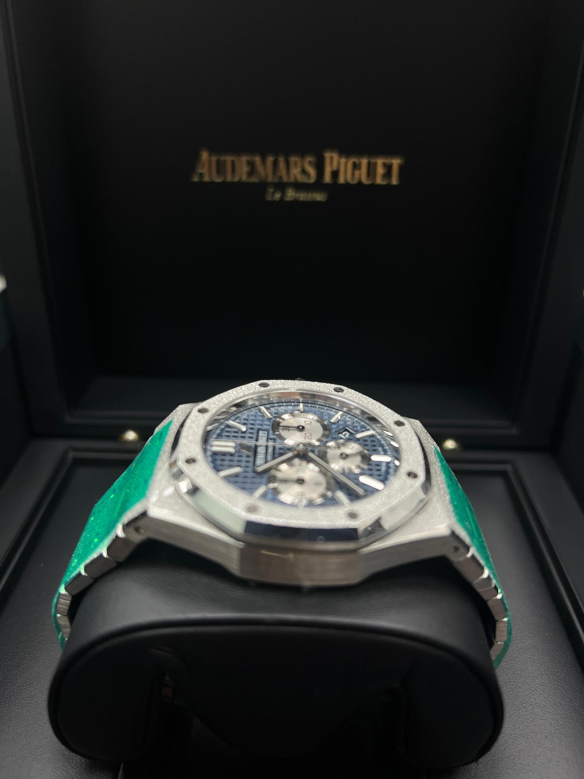 Blue dial with “Grande Tapisserie” pattern, rhodium-toned counters, white gold applied hour-markers and Royal Oak hands with luminescent coating.