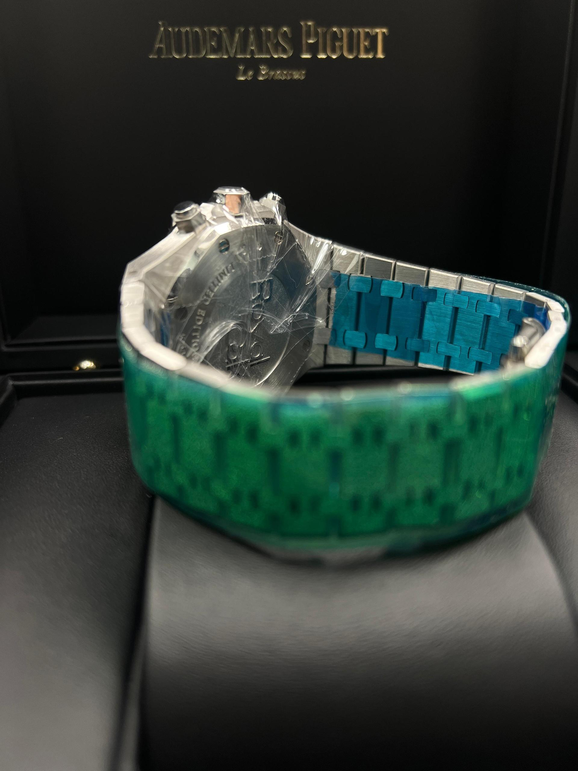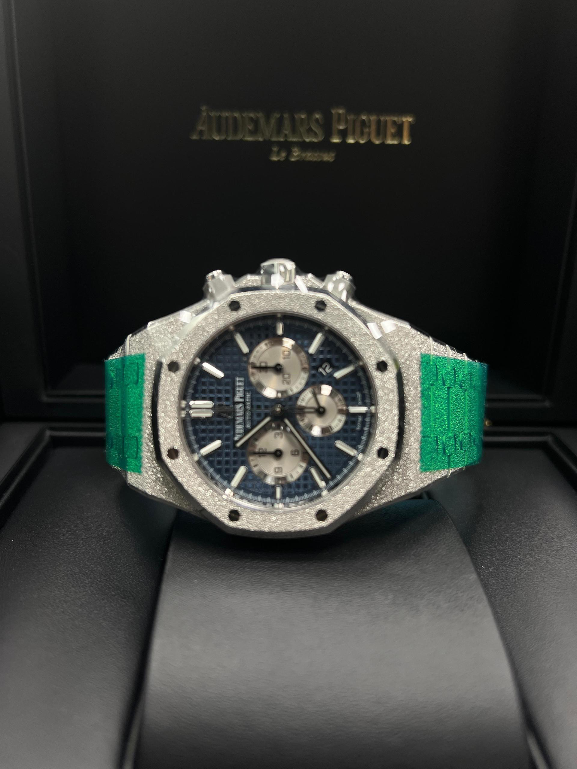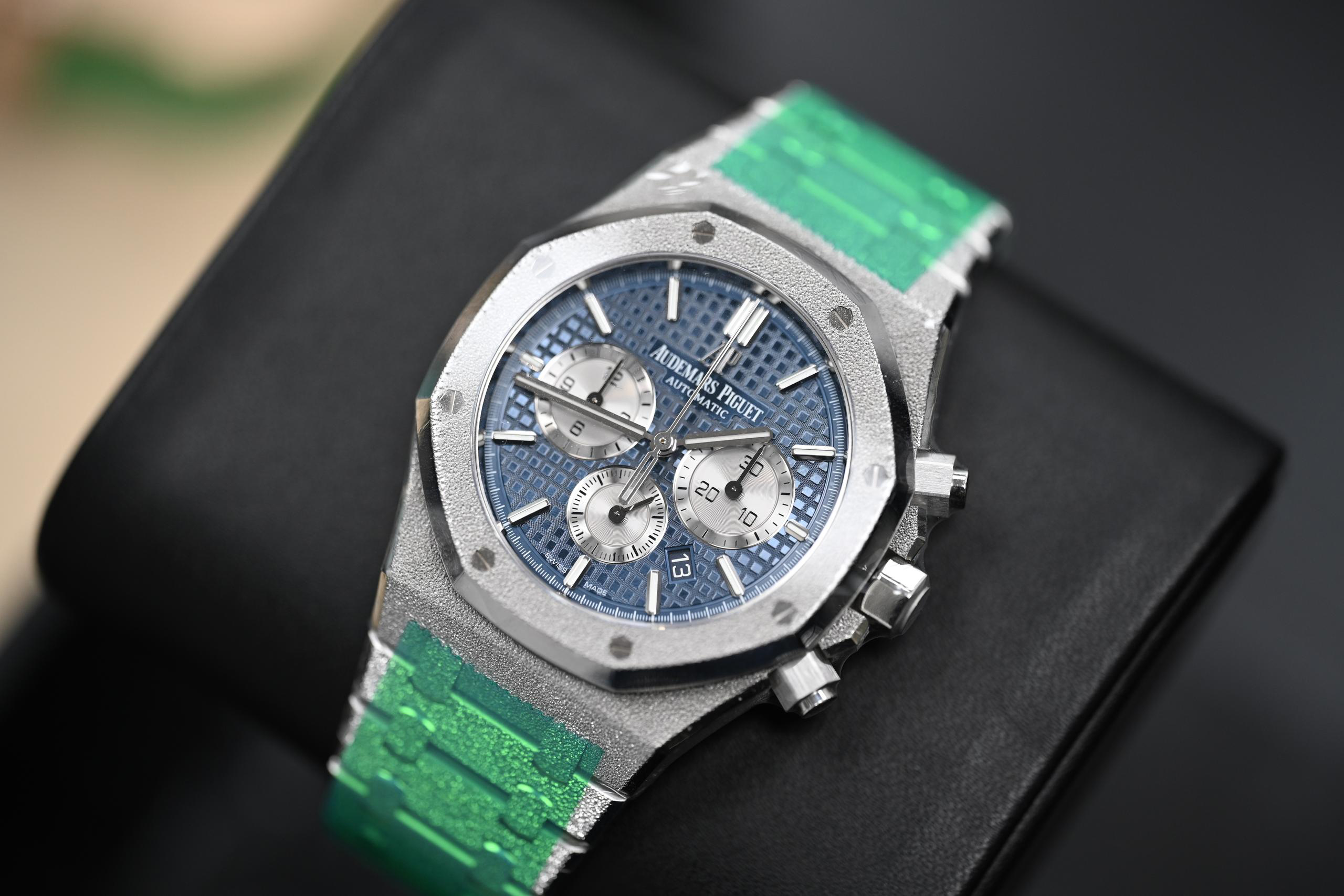 Blue dial with “Grande Tapisserie” pattern, rhodium-toned counters, white gold applied hour-markers and Royal Oak hands with luminescent coating.
