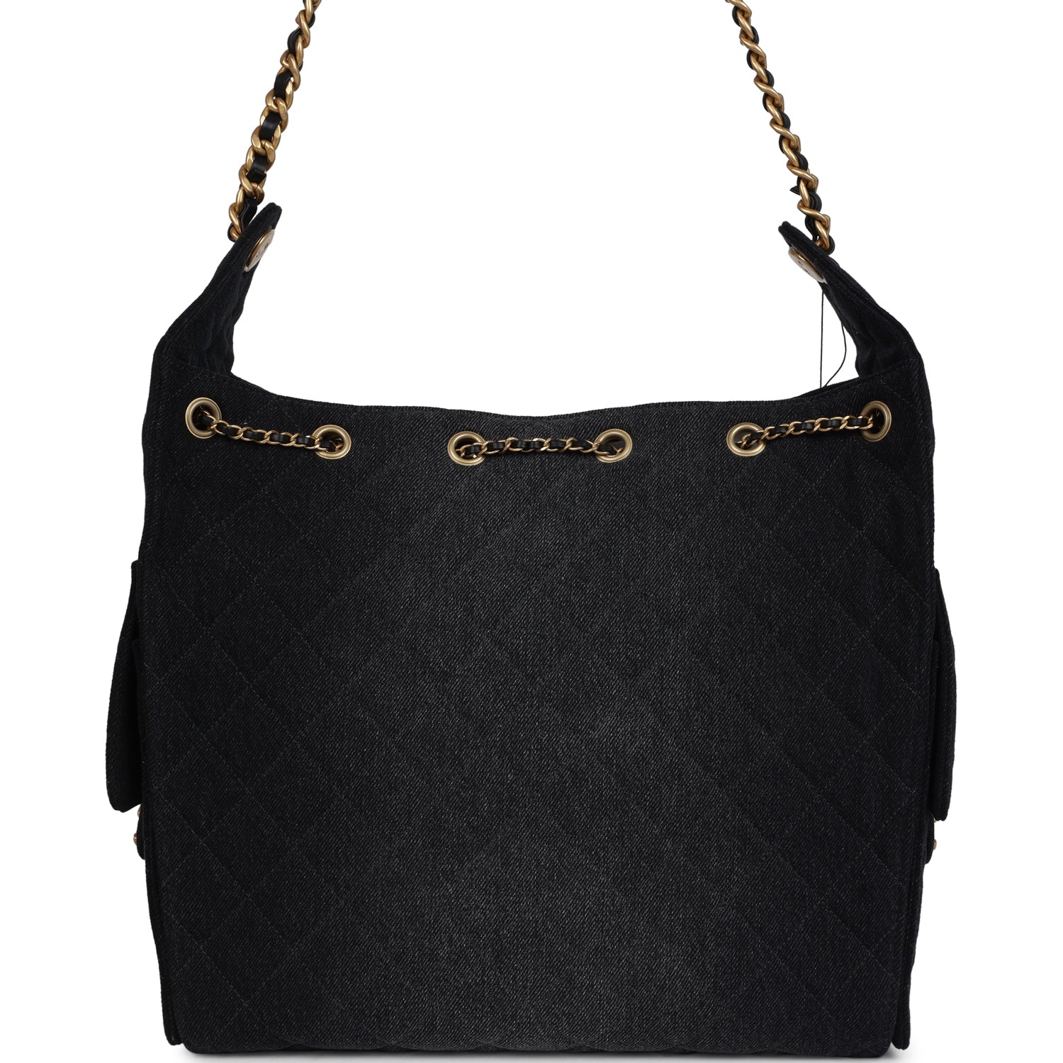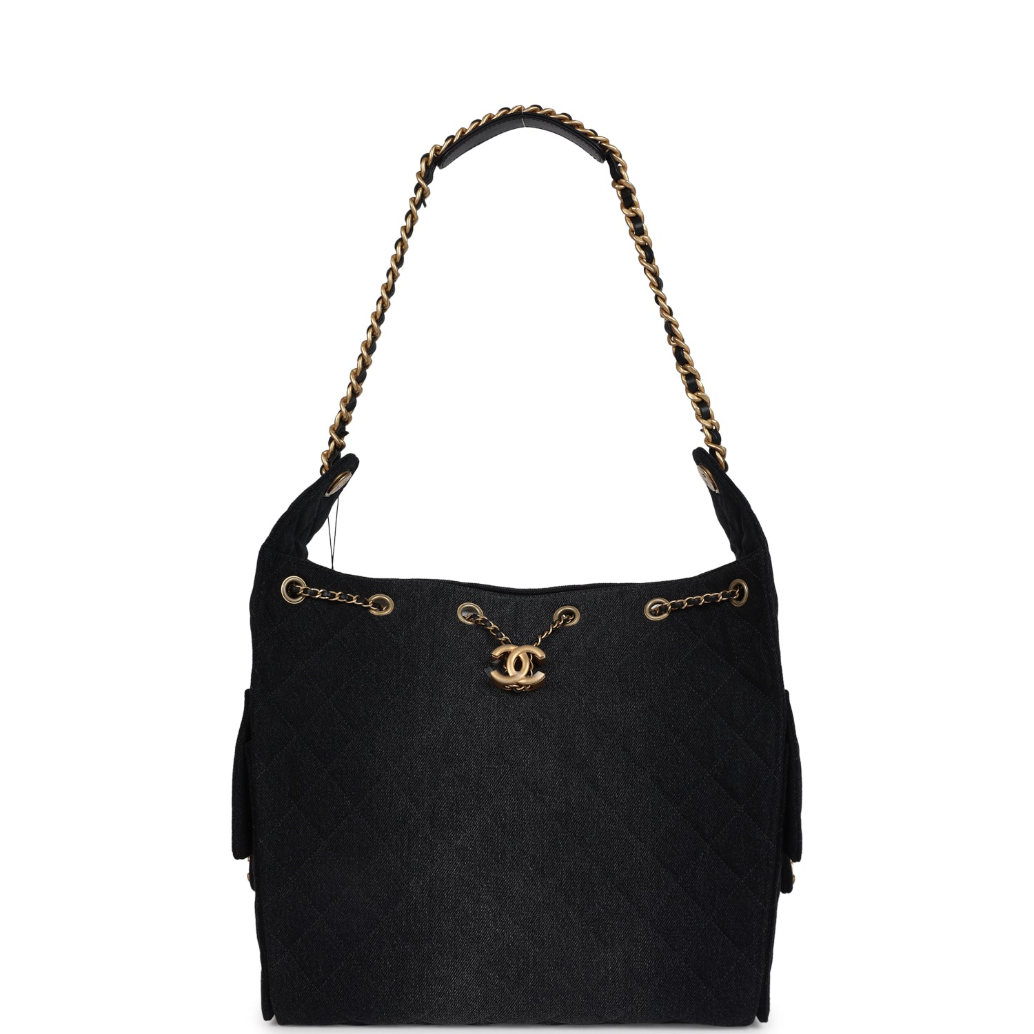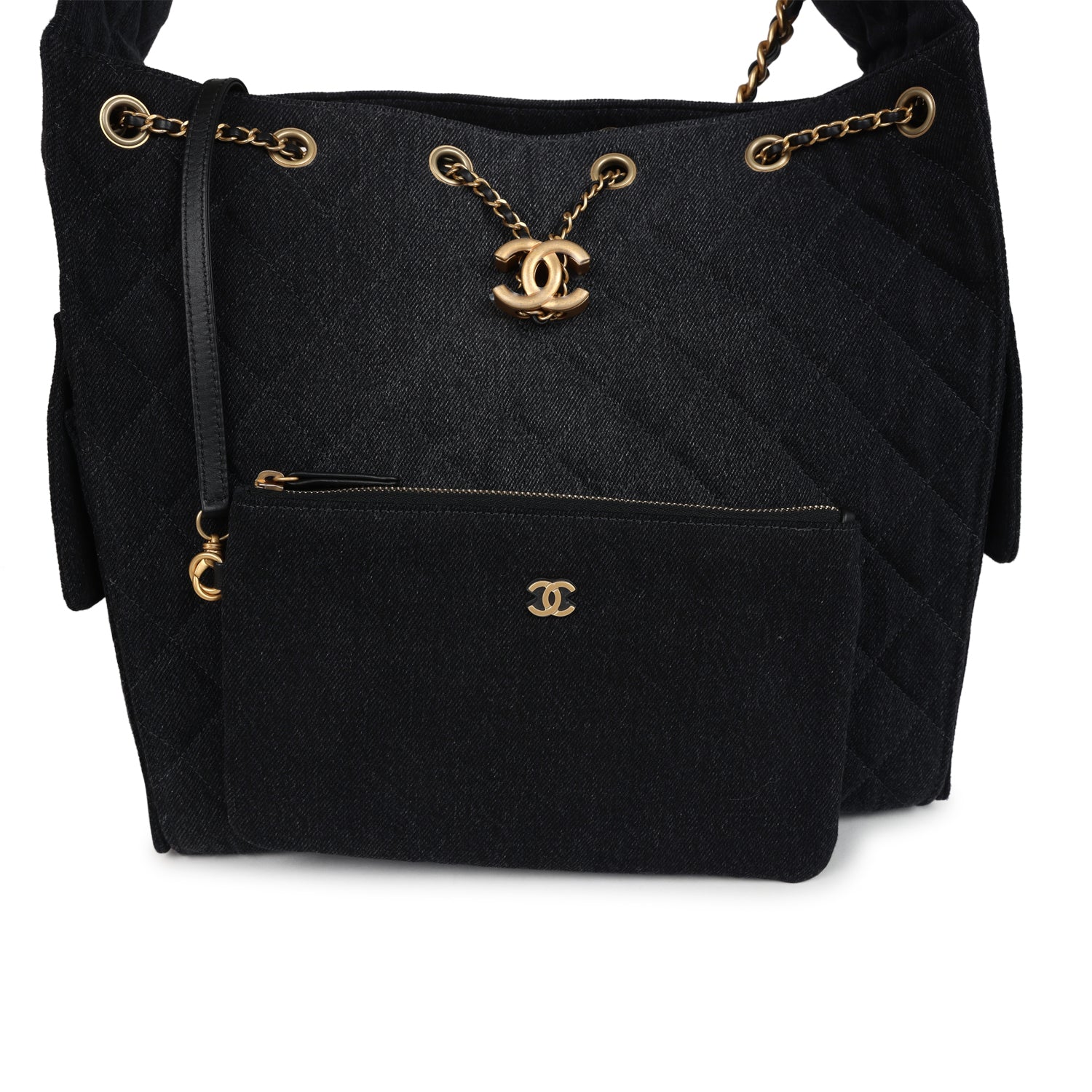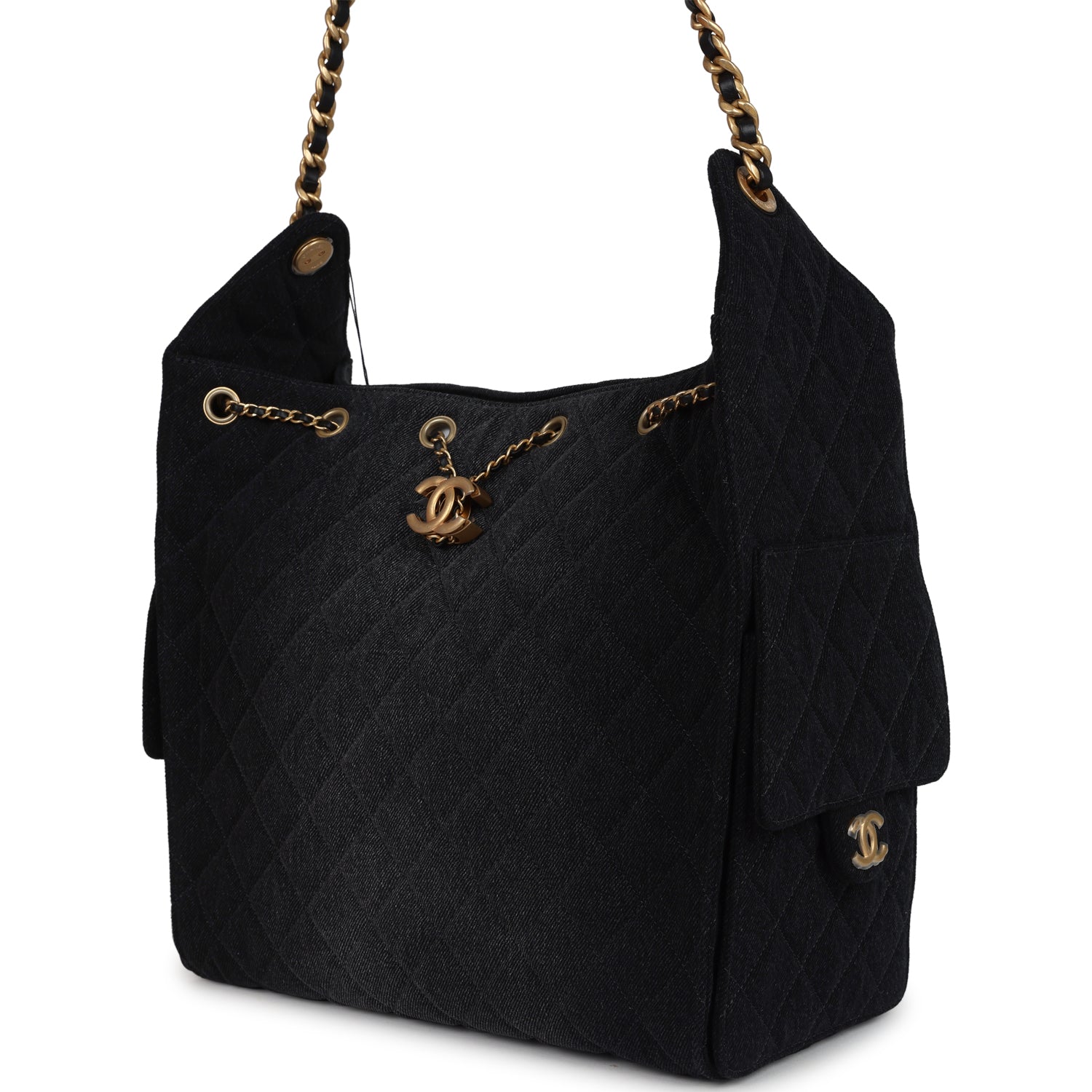 This Chanel Medium 25 Hobo Bag is in black washed denim fabric with antique gold hardware, features signature diamond quilt, two exterior side pockets, drawstring closure, a removable pouch, and a single interwoven antique gold and Black leather shoulder strap.
