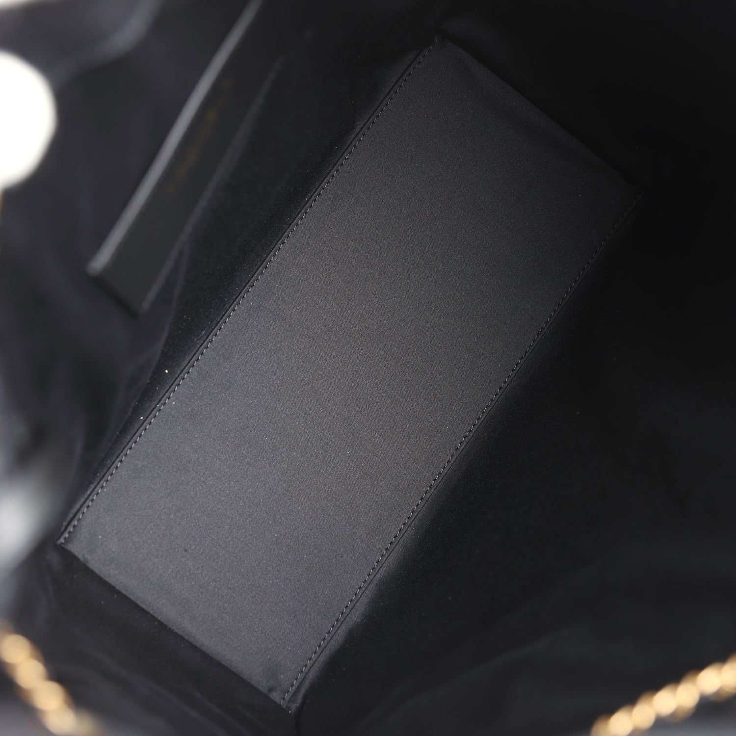The interior is lined in black grossgrain fabric and has three small slit pockets; one on the rear wall and one slit pocket on each interior side.