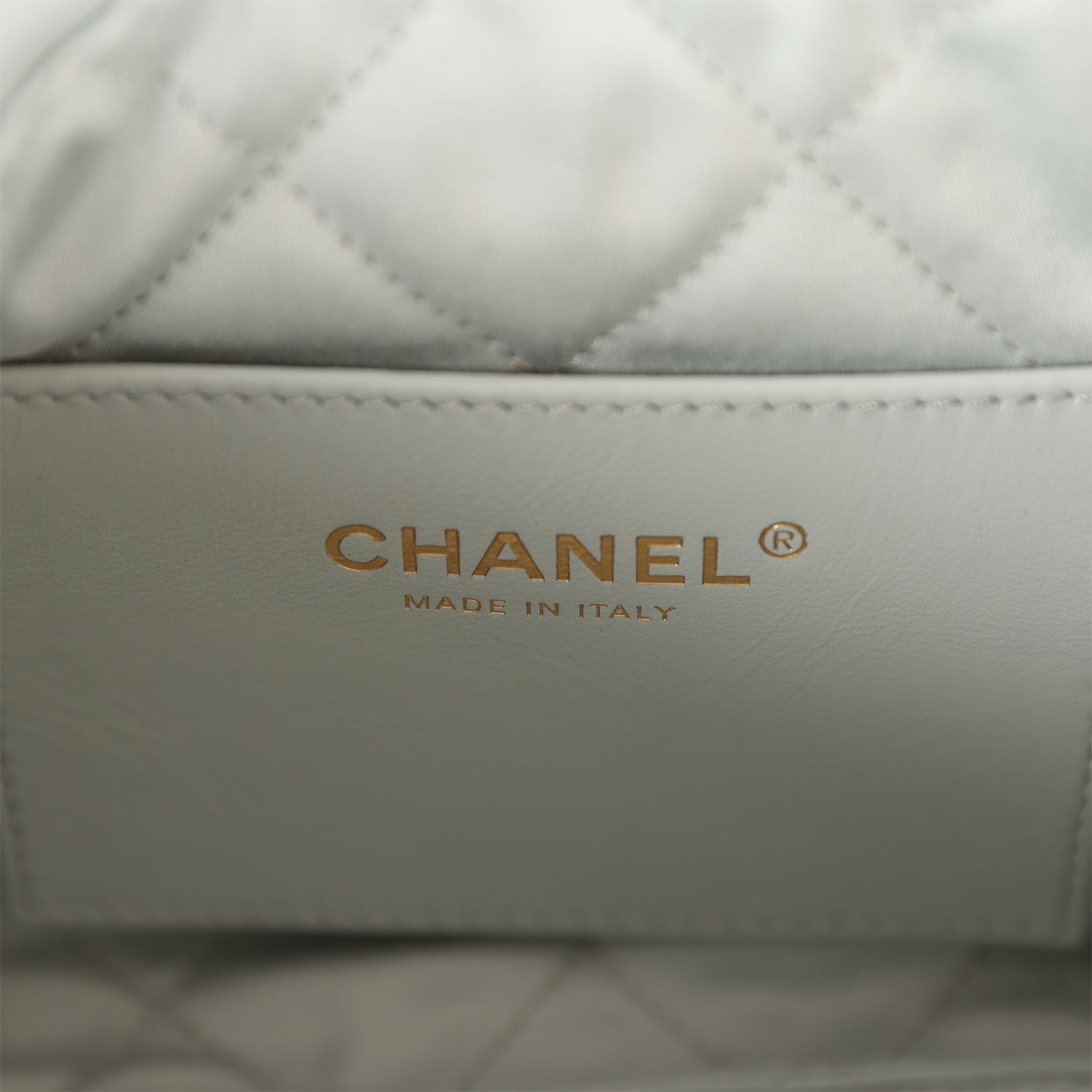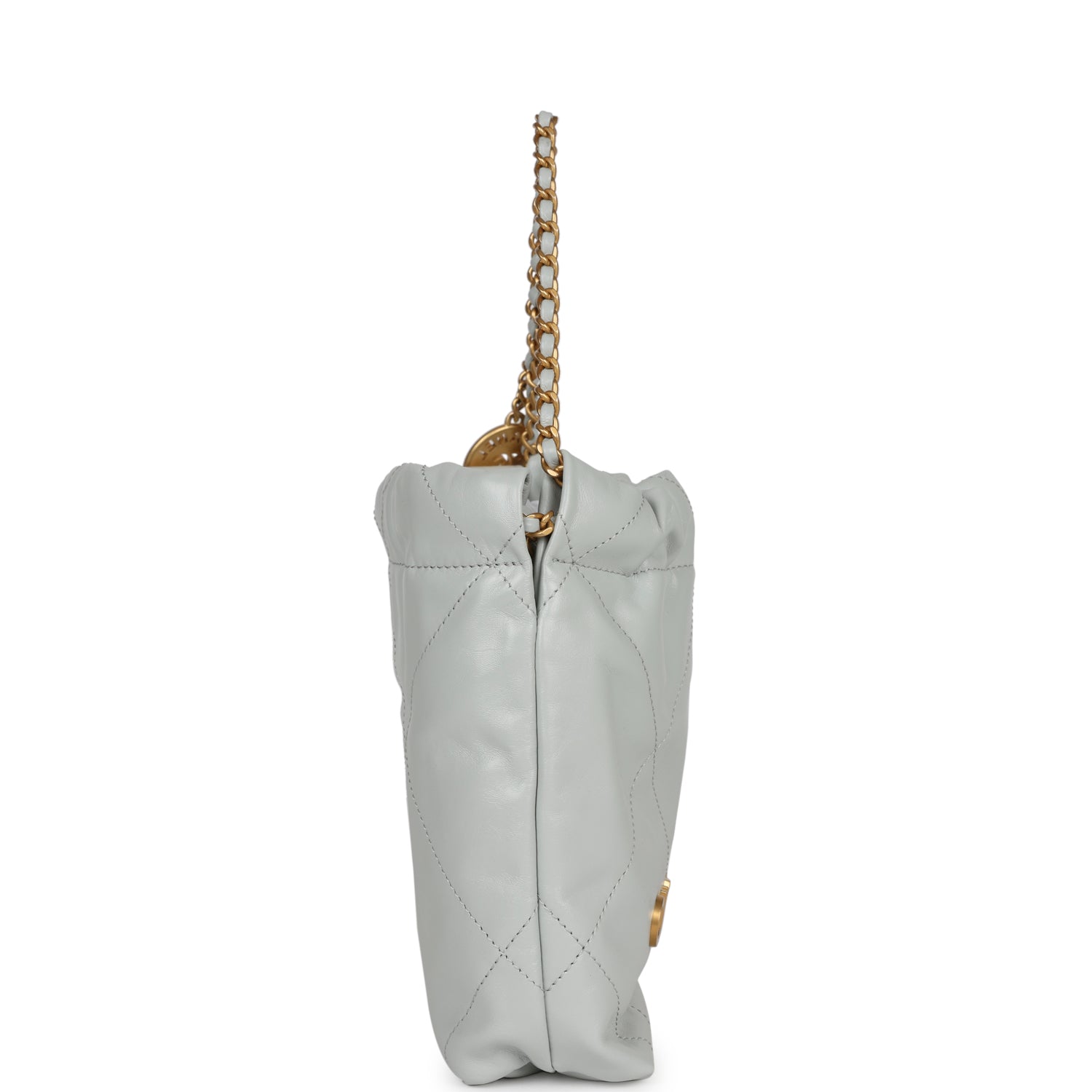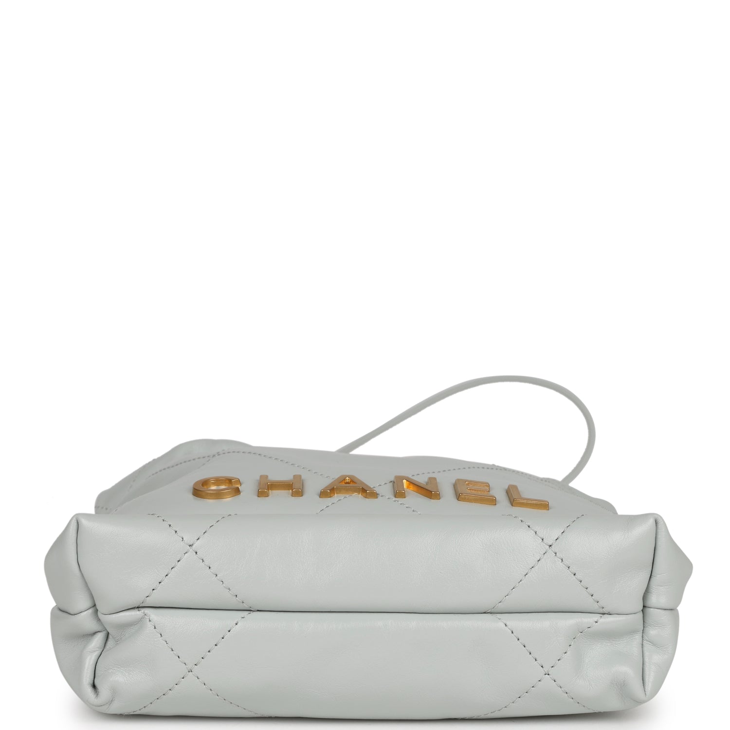 This Mini 22?hobo bag in light Blue calfskin with gold tone hardware, signature diamond quilting, CHANEL on the front in?gold metal, and a long?gold tone and?light blue leather interwoven chain.