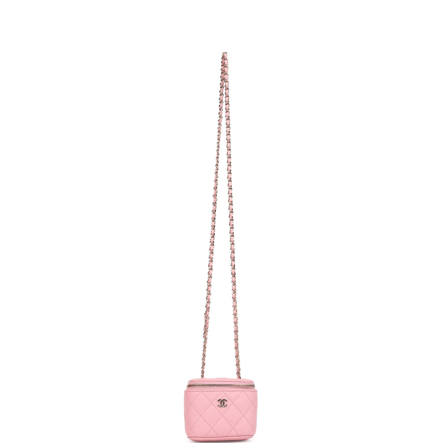 This Chanel Mini Square Vanity Case crossbody bag is in pink caviar leather with light gold hardware, featuring square shape crossbody bag, signature diamond quilt, signature CC logo on front, zip around top closure and a single Interwoven light gold tone chainlink and pink leather shoulder/crossbody strap.