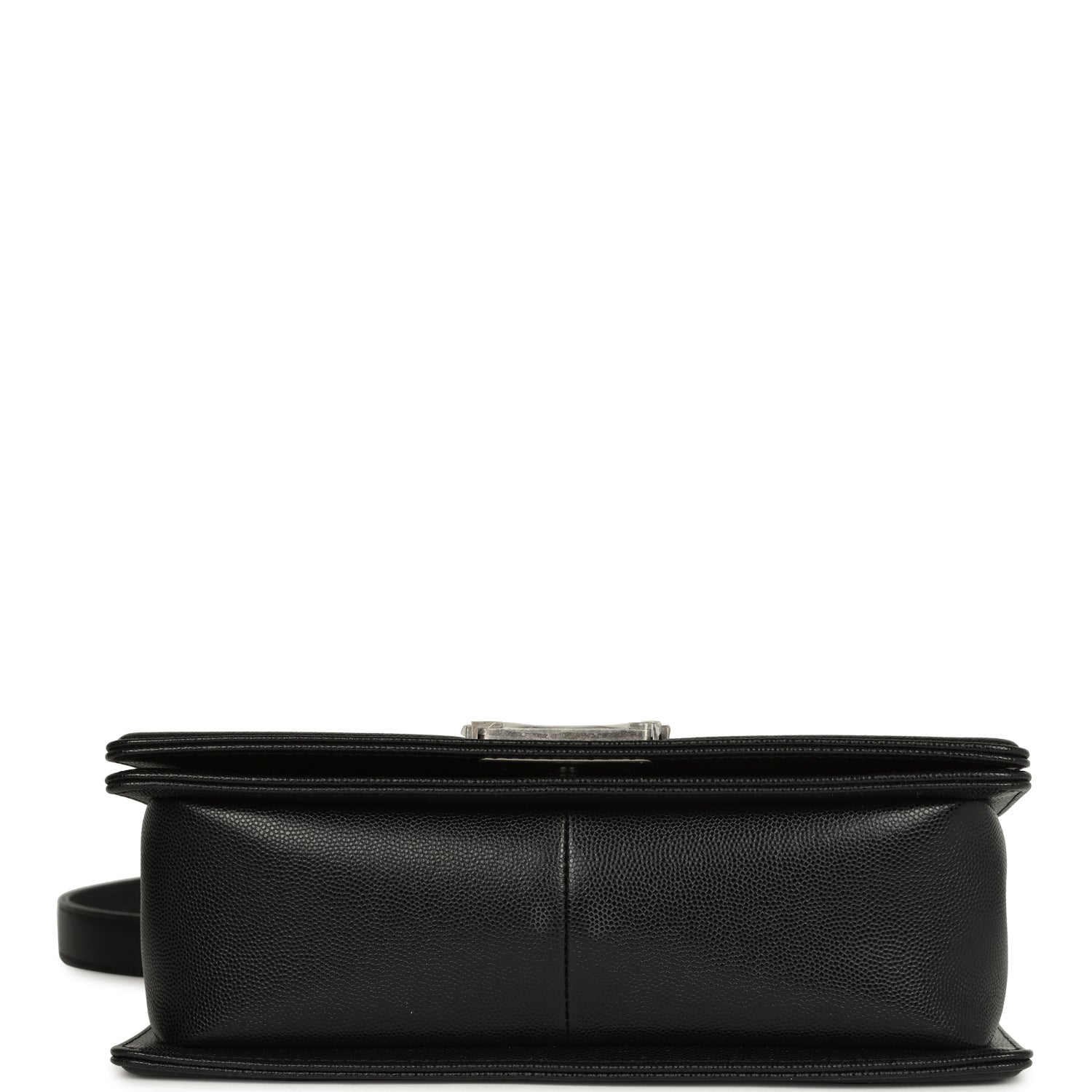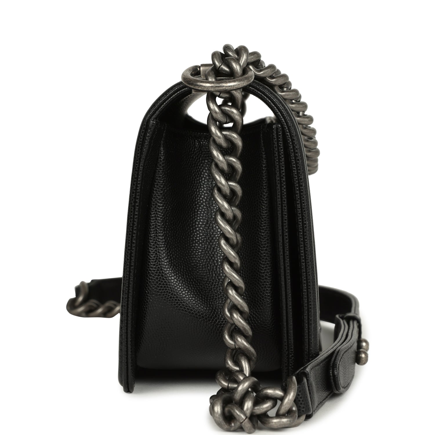 This?Old Medium Boy Bag is in black caviar leather with aged ruthenium hardware, featuring tonal stitching, front flap with Le Boy CC push closure, smooth calfskin leather trim, and aged ruthenium chainlink and black leather shoulder strap.