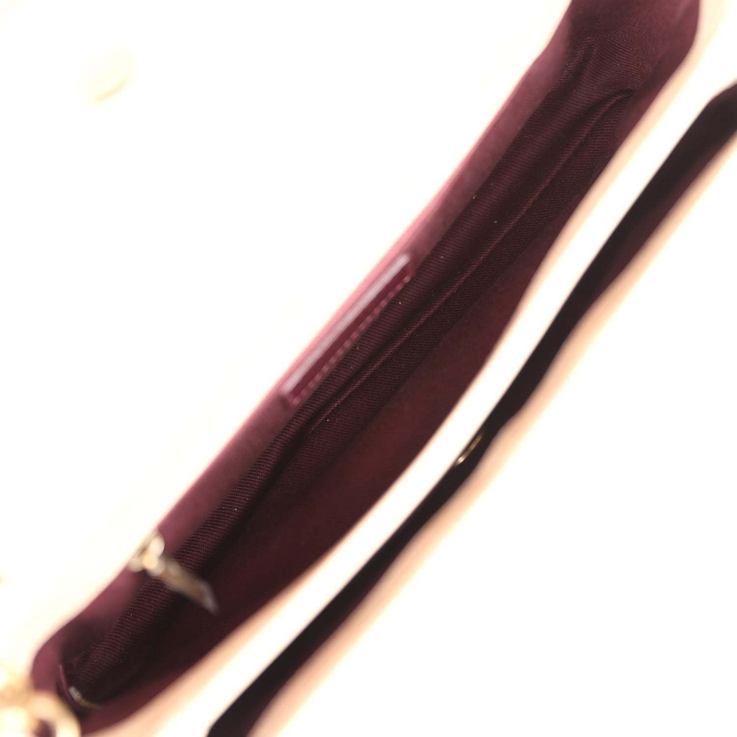 The interior is lined in burgundy fabric with the two main compartments and one interior zipper compartment.