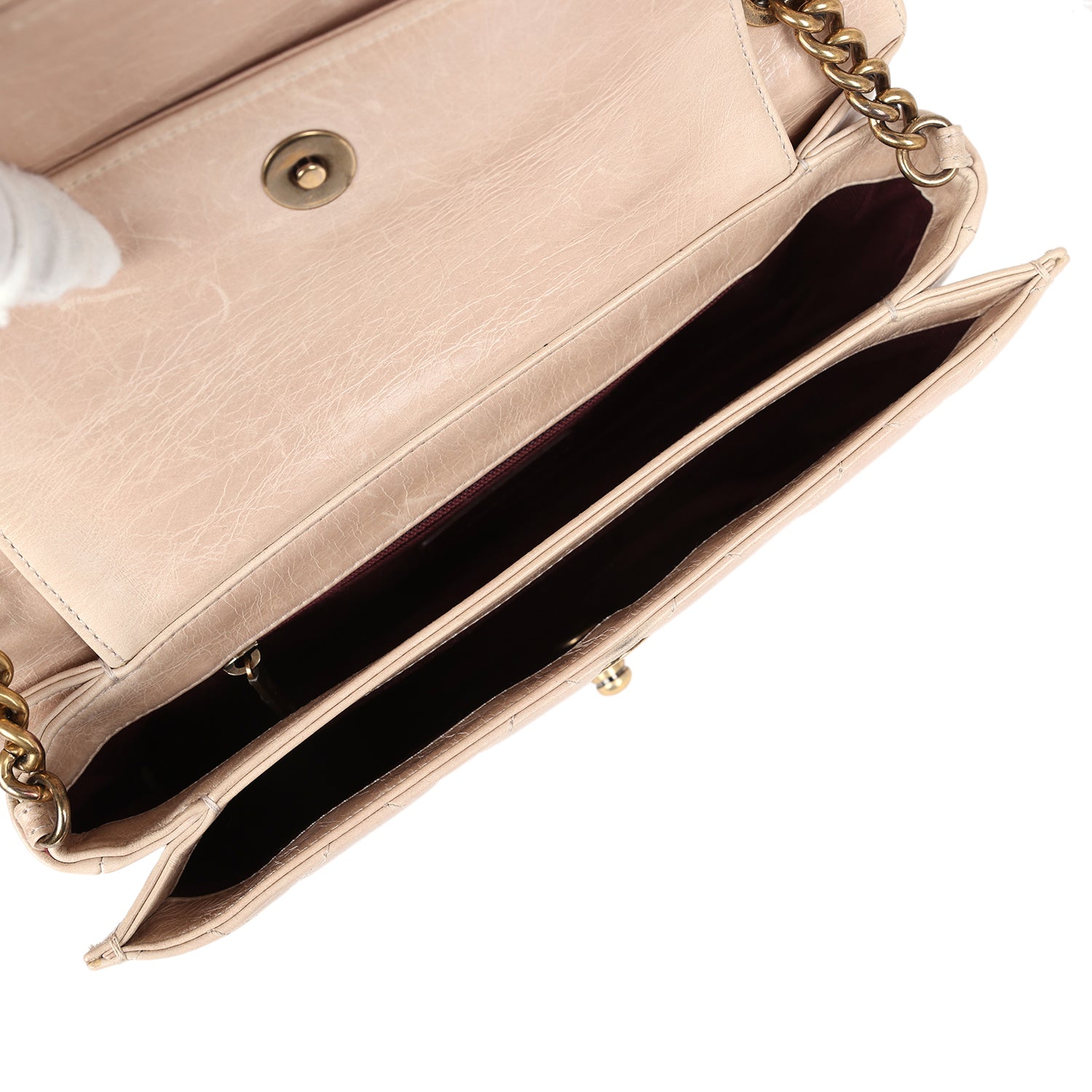 This Perfect Edge flap bag is in beige aged calfskin with antique gold hardware, front flap with CC snap closure, tonal stitching, an interwoven antique gold tone chain link shoulder strap, an antique gold tone chain link top handle, and signature back pocket on exterior.