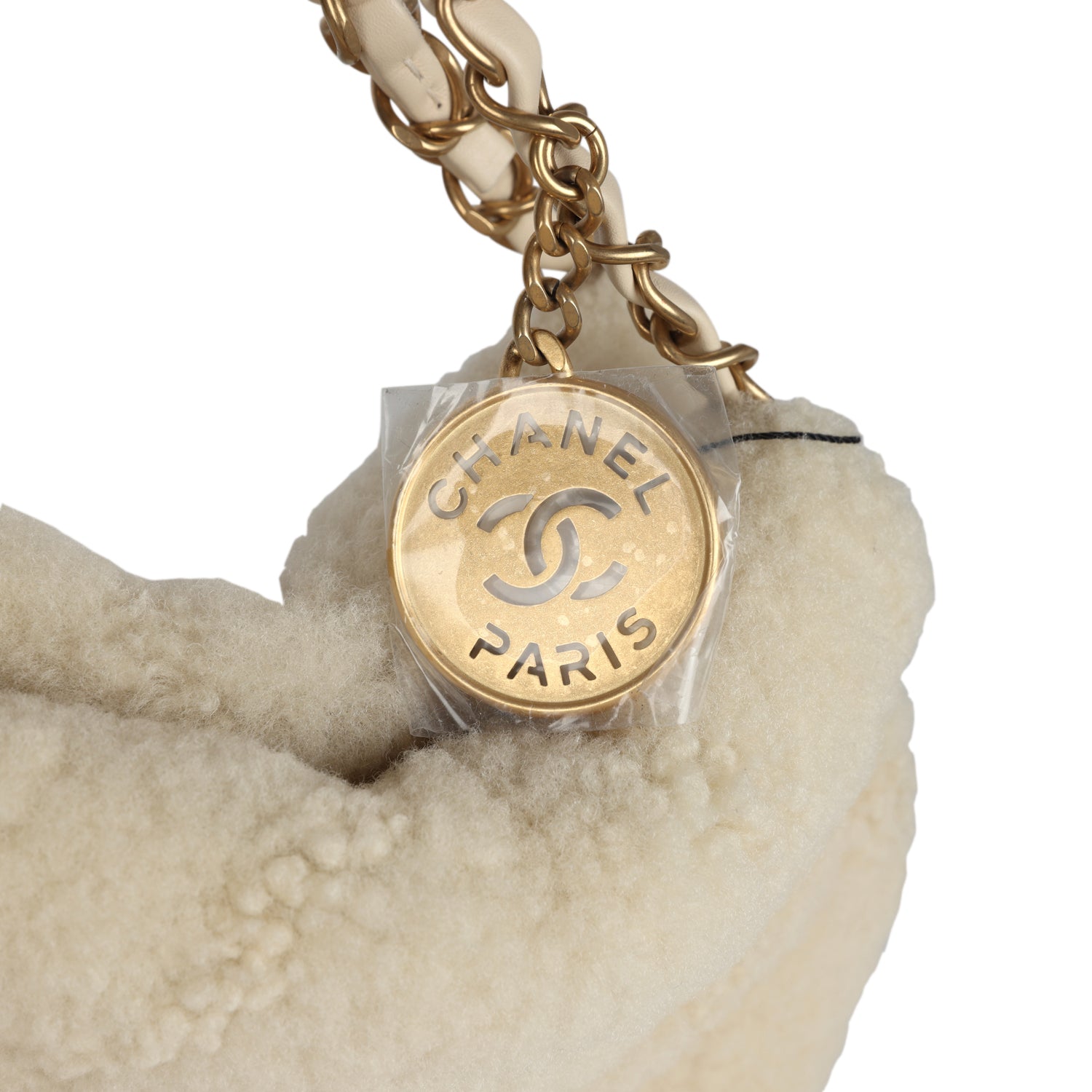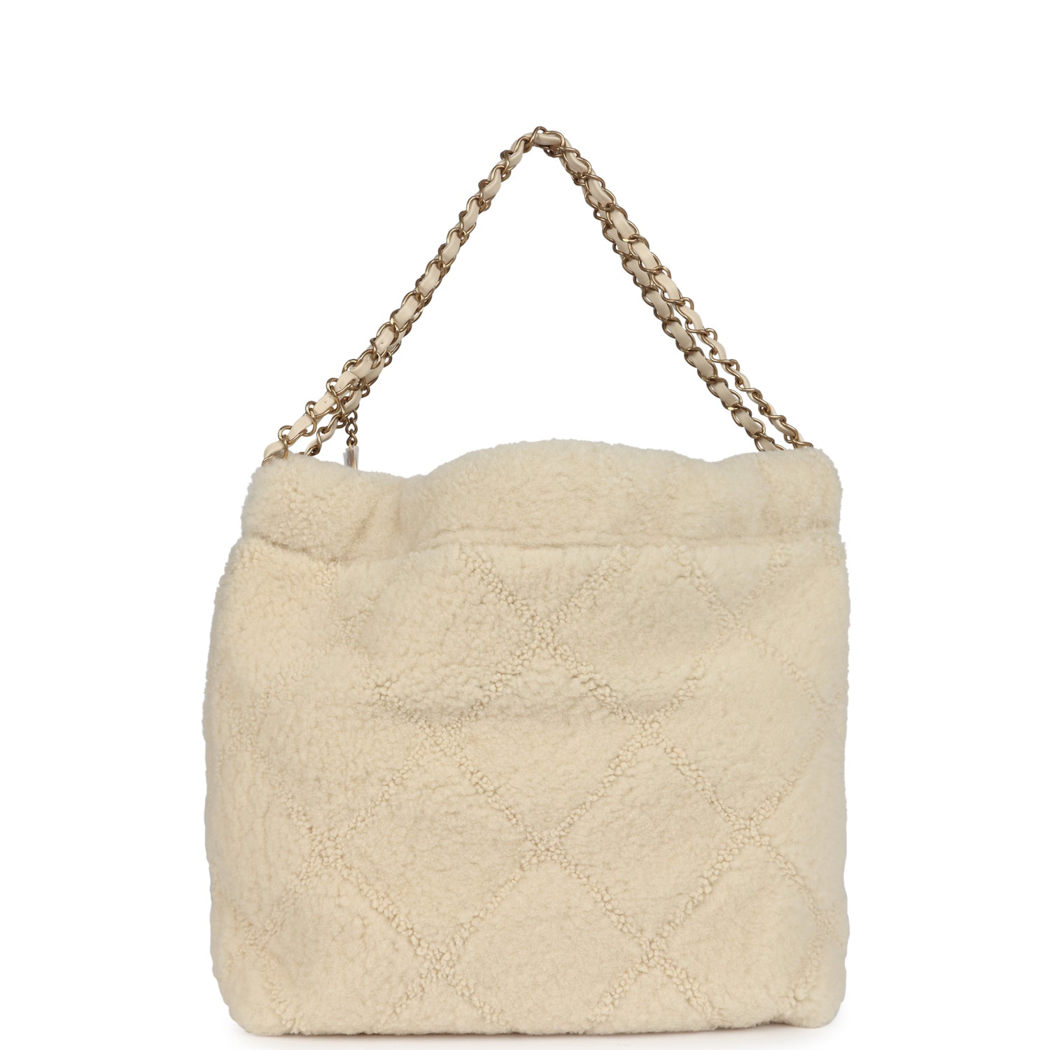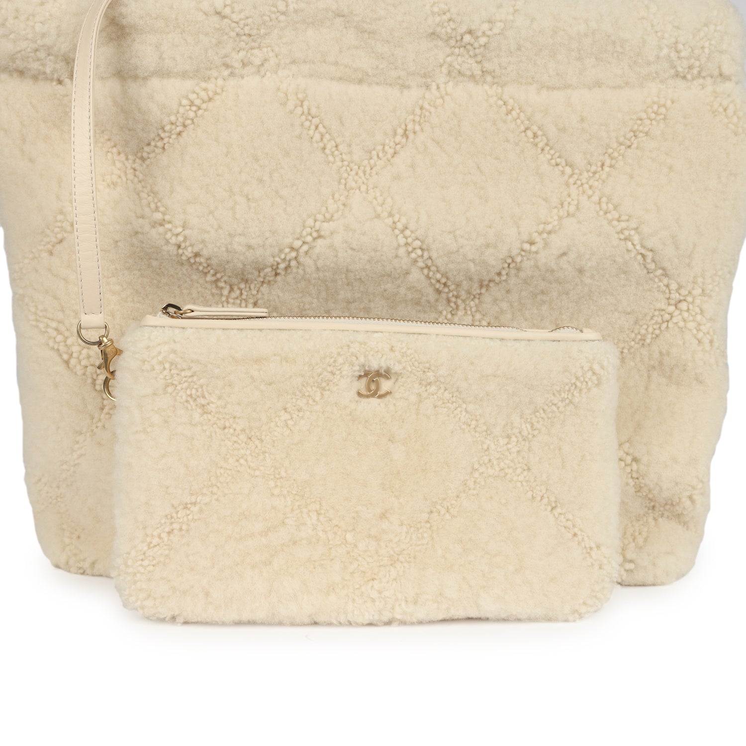 This Chanel Small 22 Hobo Bag is in ecru shearling fabric with brushed gold tone hardware, has the signature diamond quilt, gold tone metal "Chanel" logo on front of bag, Chanel Paris metal hang tag, snap closure, interwoven chain link with brushed gold metal and leather shoulder straps, and a removable shearling pouch.
