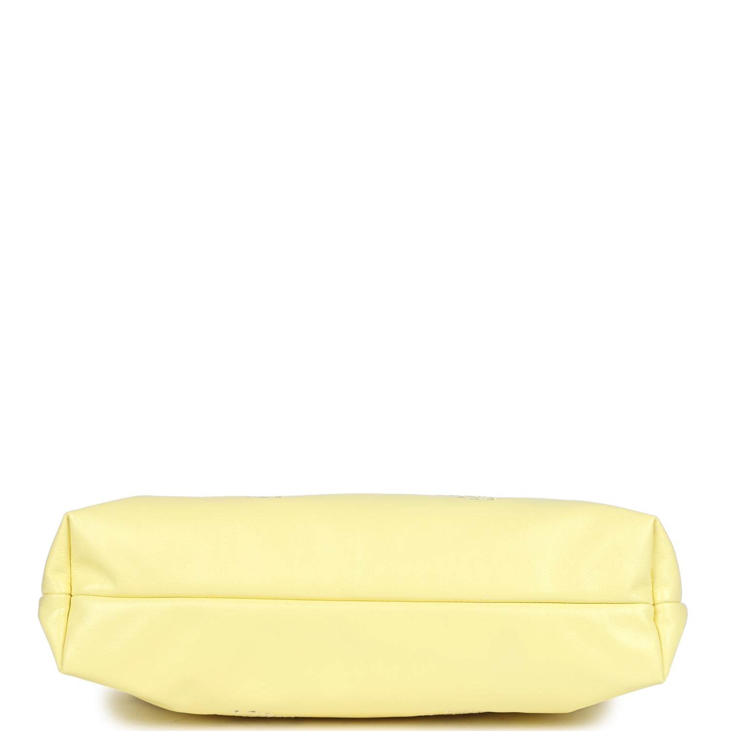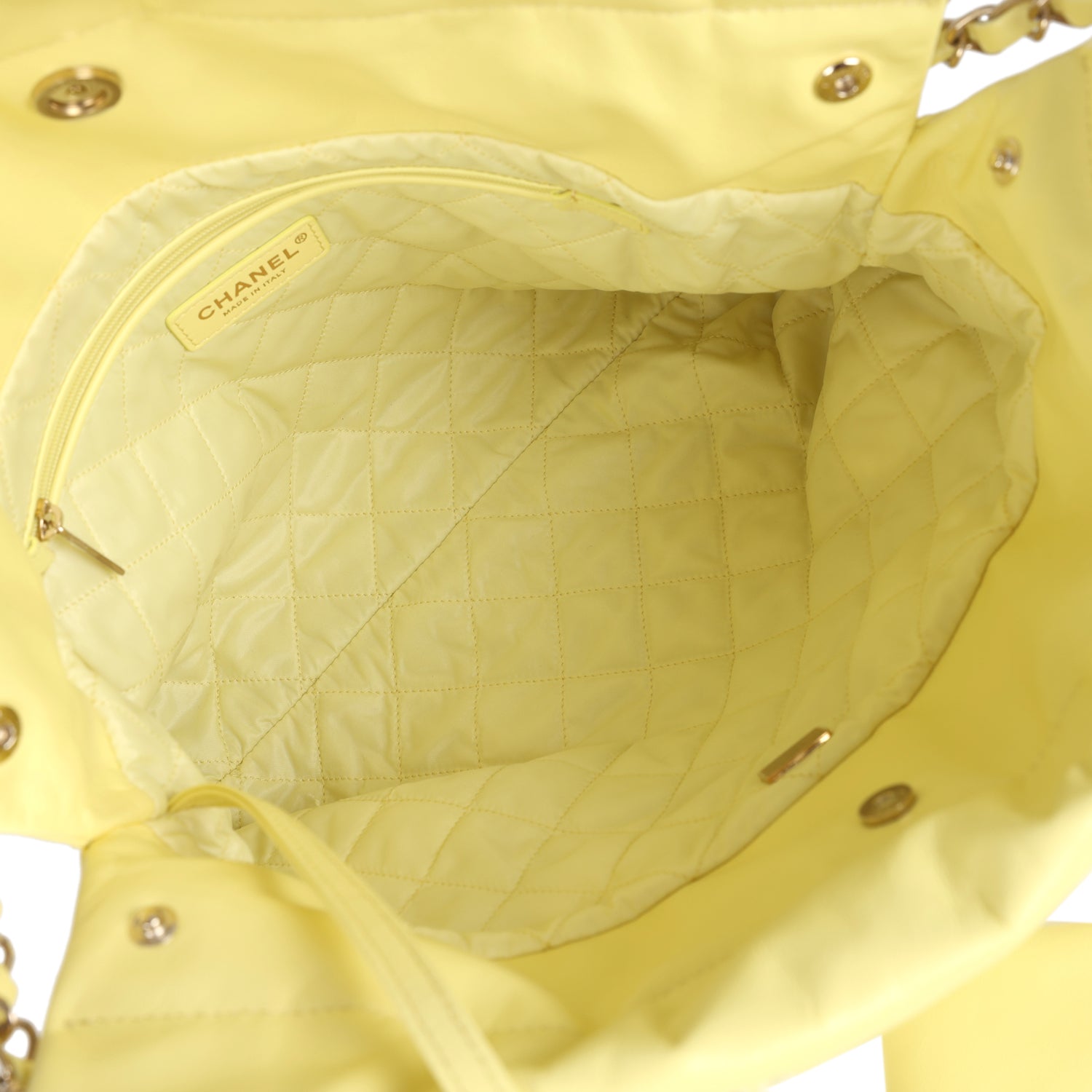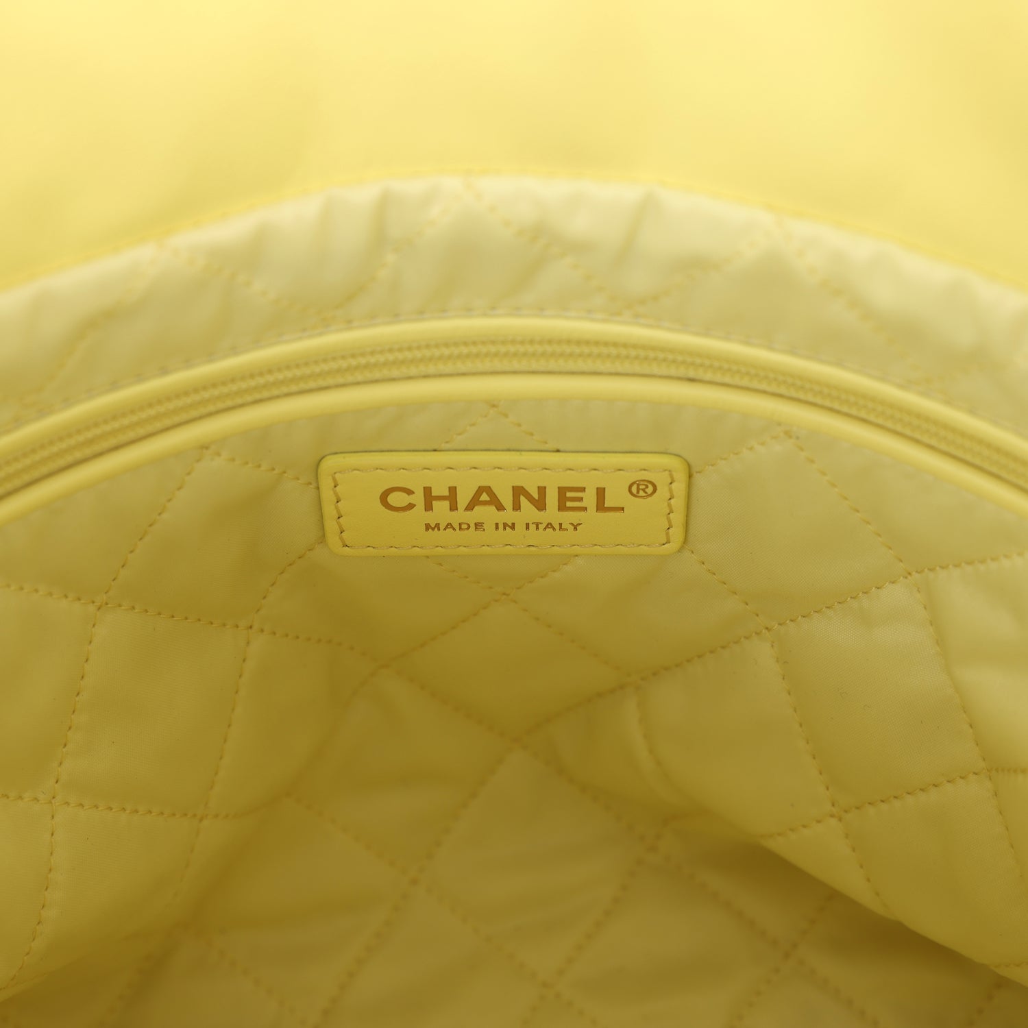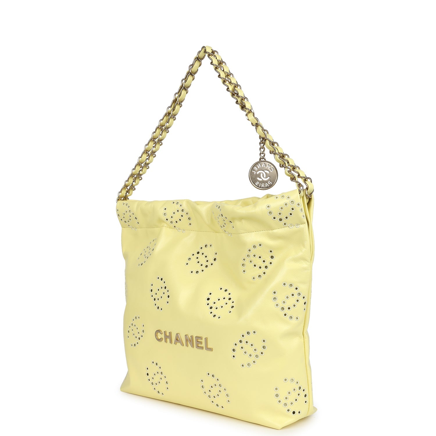 This Chanel Small 22 Hobo Bag is of light yellow shiny calfskin leather with brushed gold tone hardware, has perforated signature CC logos all over, brushed gold tone metal "Chanel" logo on front of bag, Chanel Paris metal hang tag, interwoven chain link with brushed gold metal and yellow leather shoulder straps, and a removable pouch.