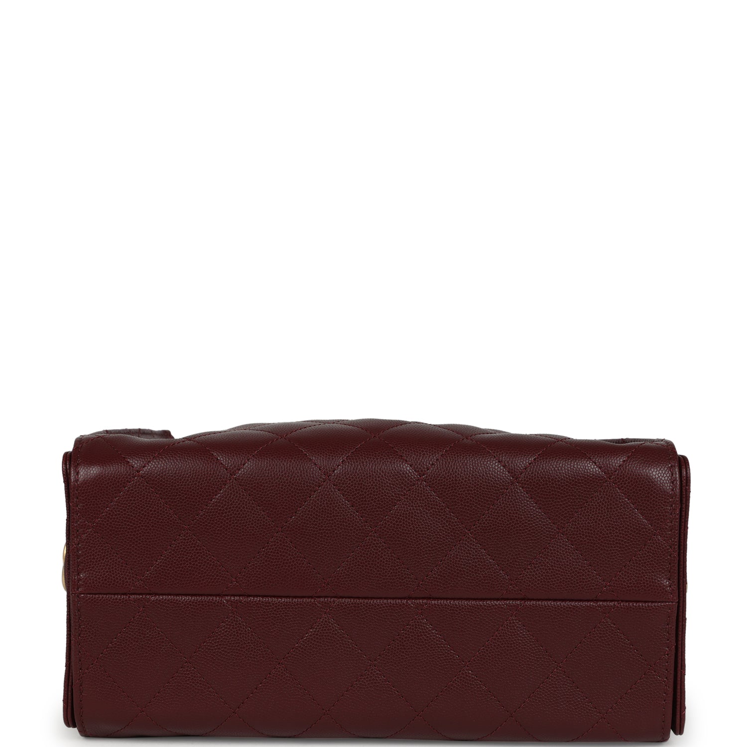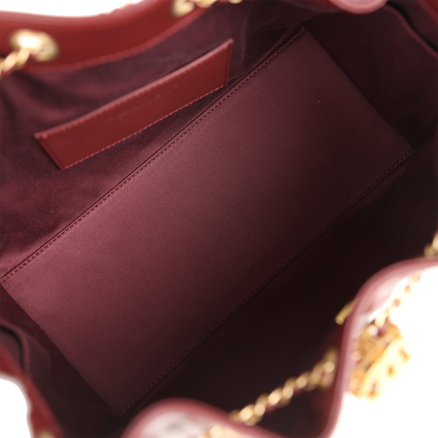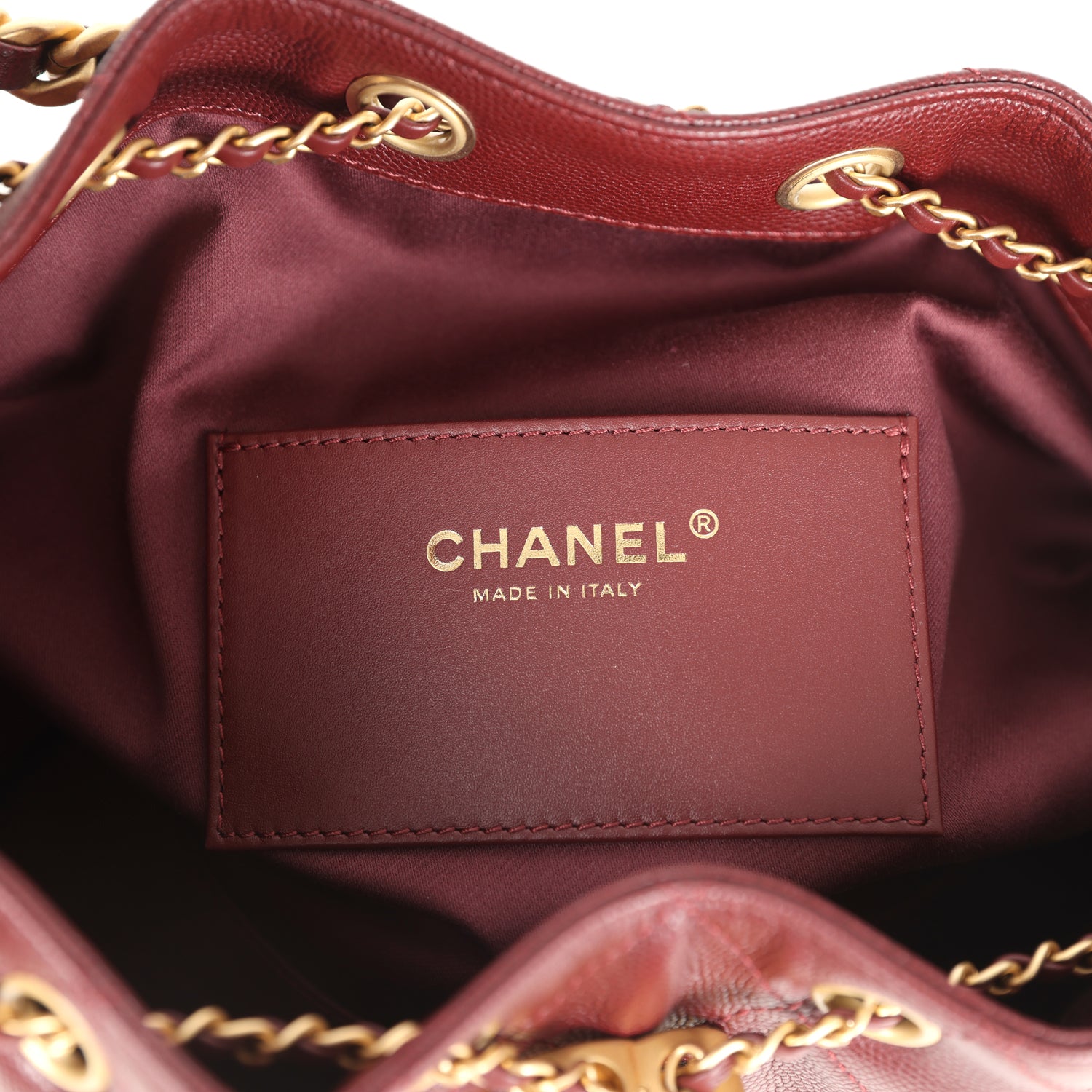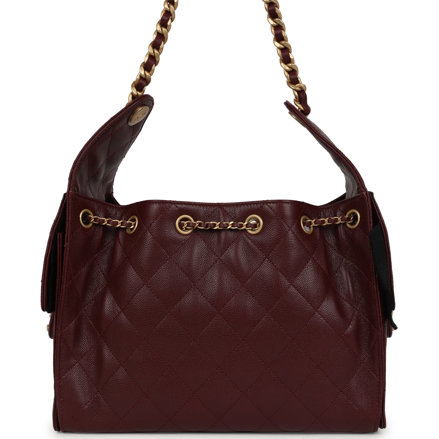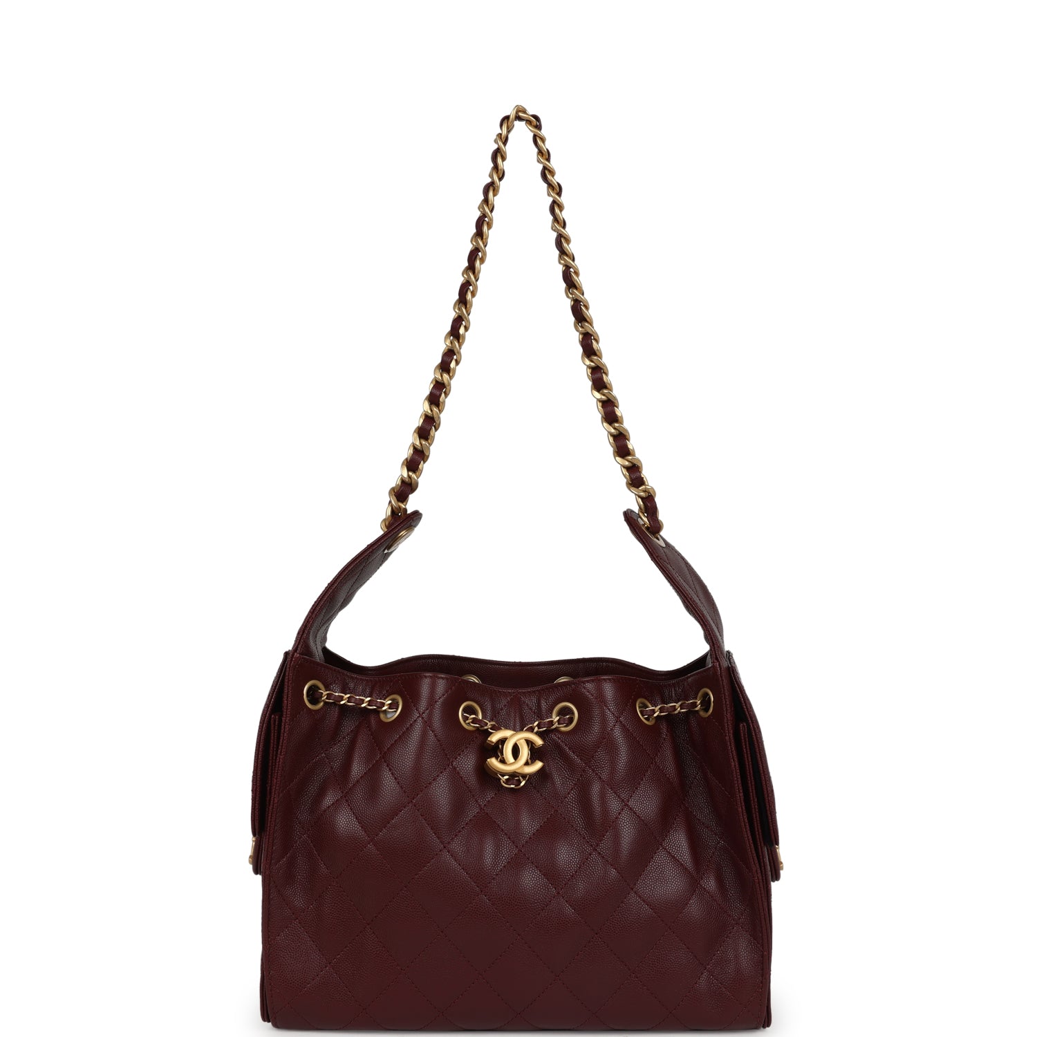 This Chanel?Small 25 Hobo Bag is in burgundy caviar leather with antique gold hardware, features signature diamond quilt, two exterior side pockets, drawstring closure, and a single interwoven antique gold and burgundy leather shoulder strap.