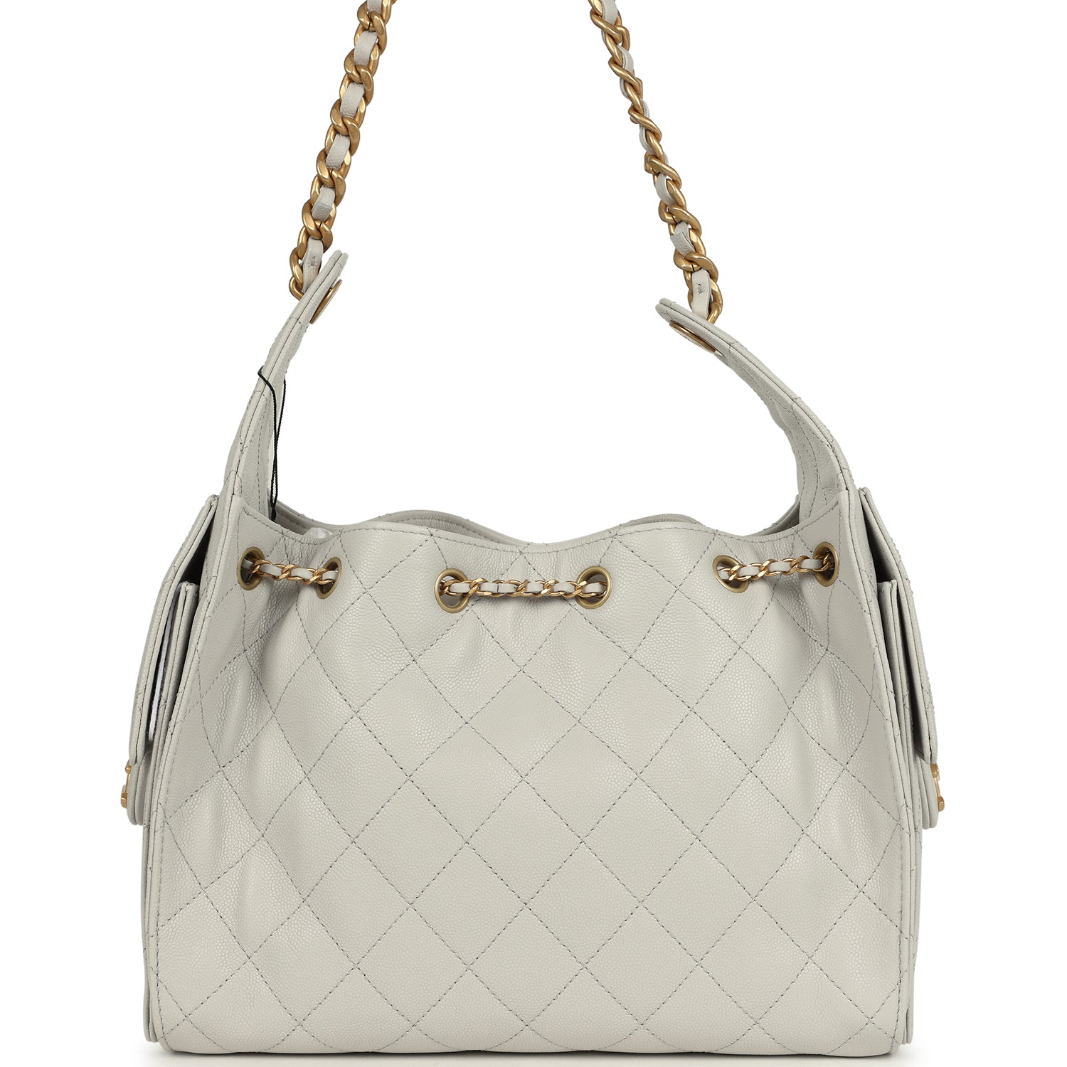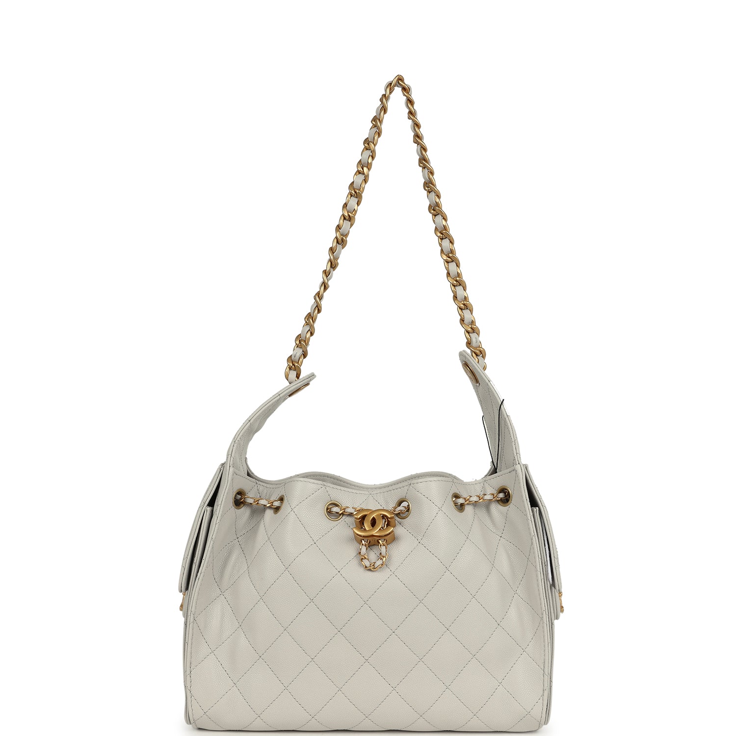 This Chanel?Small 25 Hobo Bag is in light grey caviar leather with antique gold hardware, features signature diamond quilt, two exterior side pockets, drawstring closure, and a single interwoven Antique gold and Light Grey leather shoulder strap.