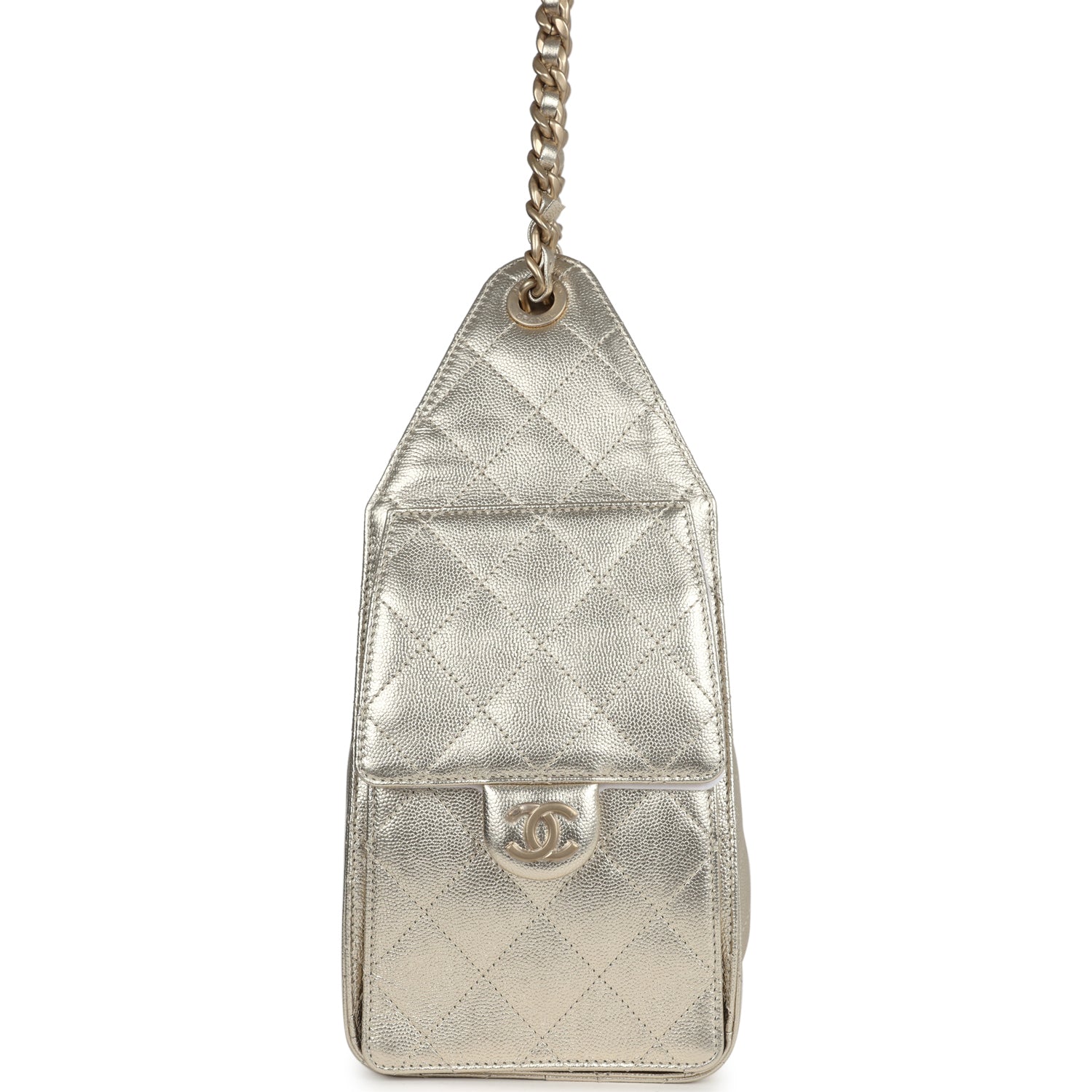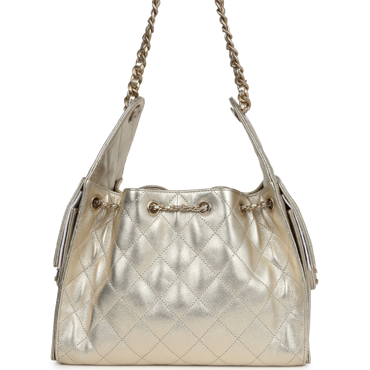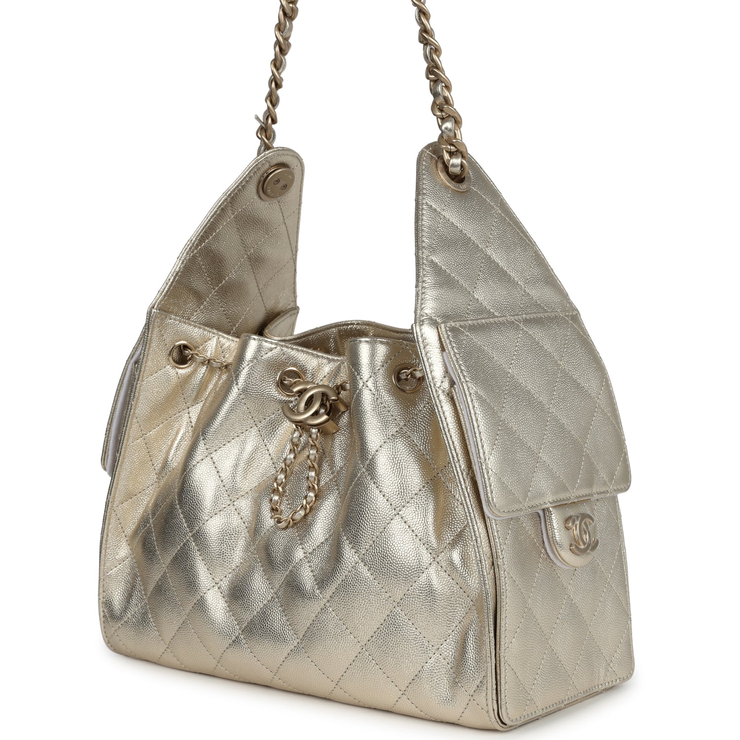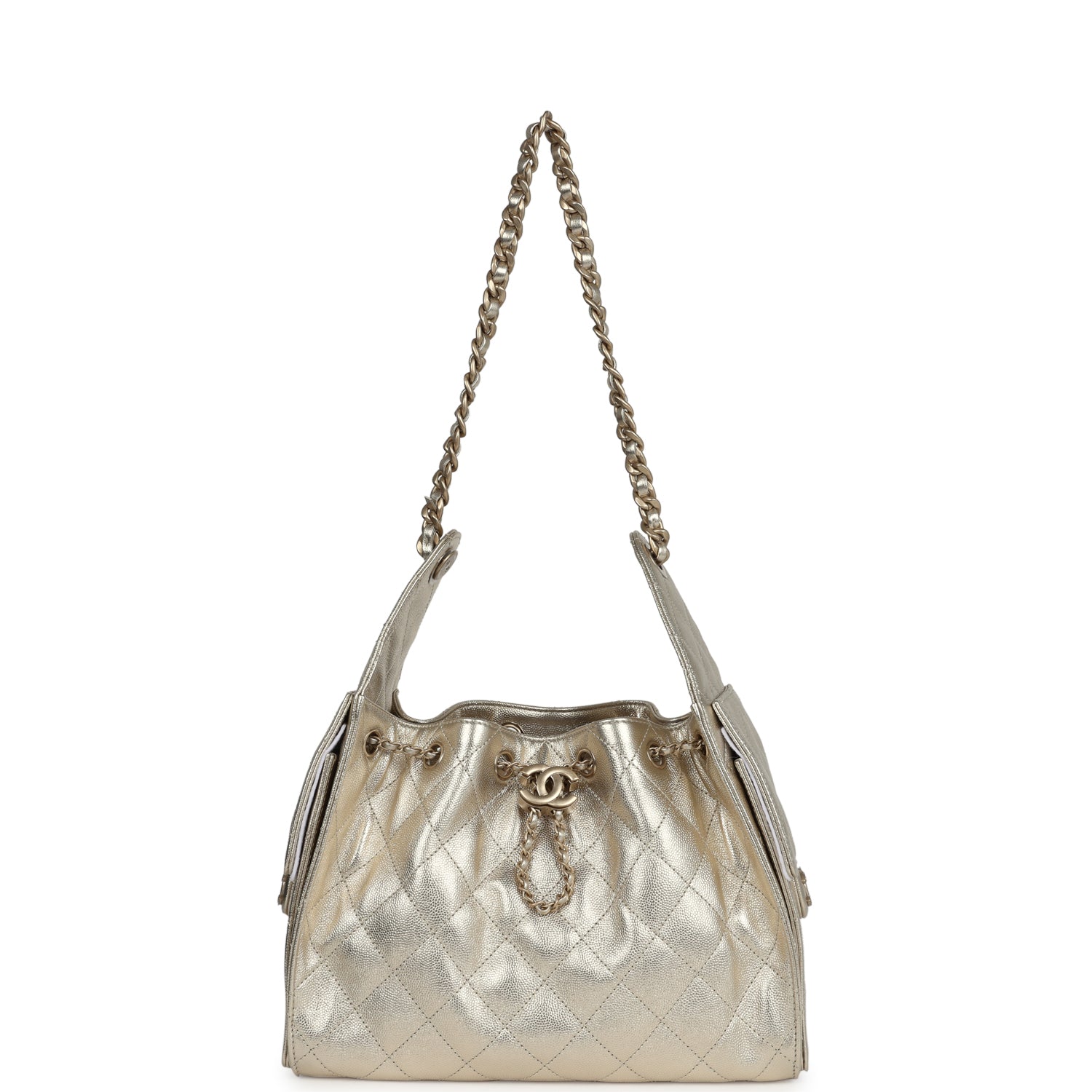This Chanel?Small 25 Hobo Bag is in metallic gold caviar leather with antique gold hardware, features signature diamond quilt, two exterior side pockets, drawstring closure, and a single interwoven antique gold and metallic gold leather shoulder strap.