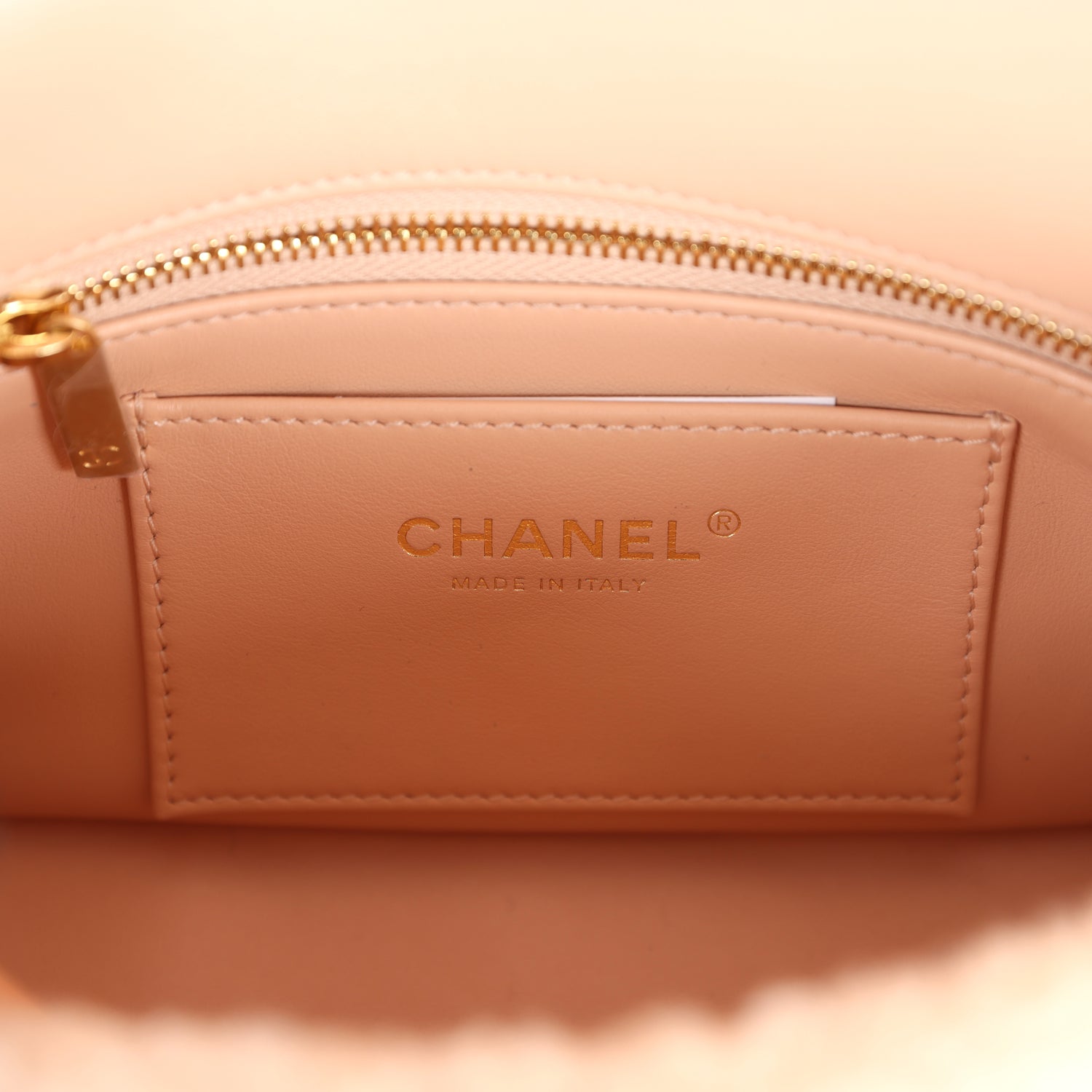 The interior is lined in light pink leather and one zip pocket on the rear wall with logo pull and one small slip pocket.