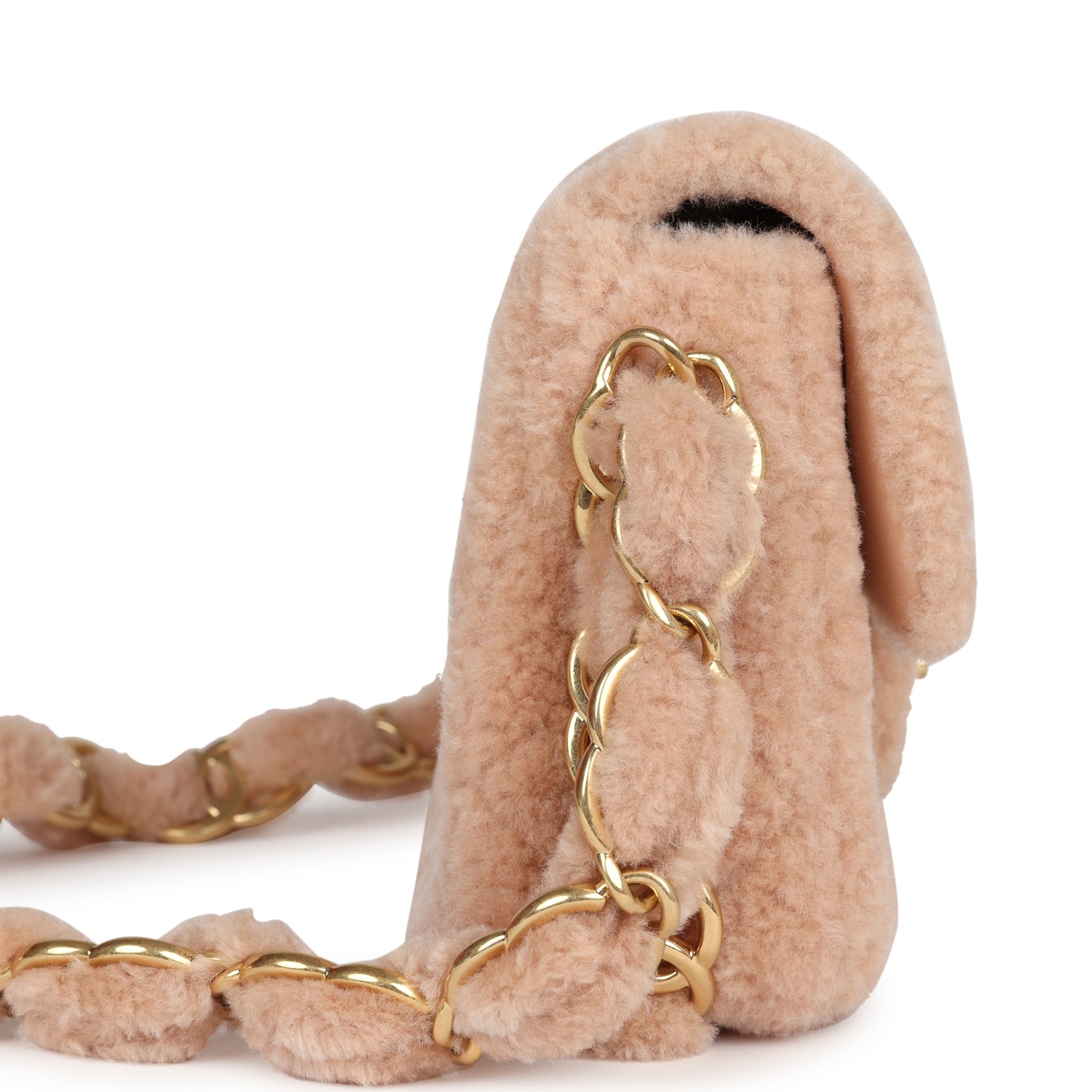This Chanel Small CC Flap Bag is of light pink shearling with brushed gold hardware, featuring signature diamond quilt, brushed gold CC logos interwoven with shearling along the sides, front flap CC turnlock closure and a single interwoven brushed gold and Light Pink shearling shoulder strap.