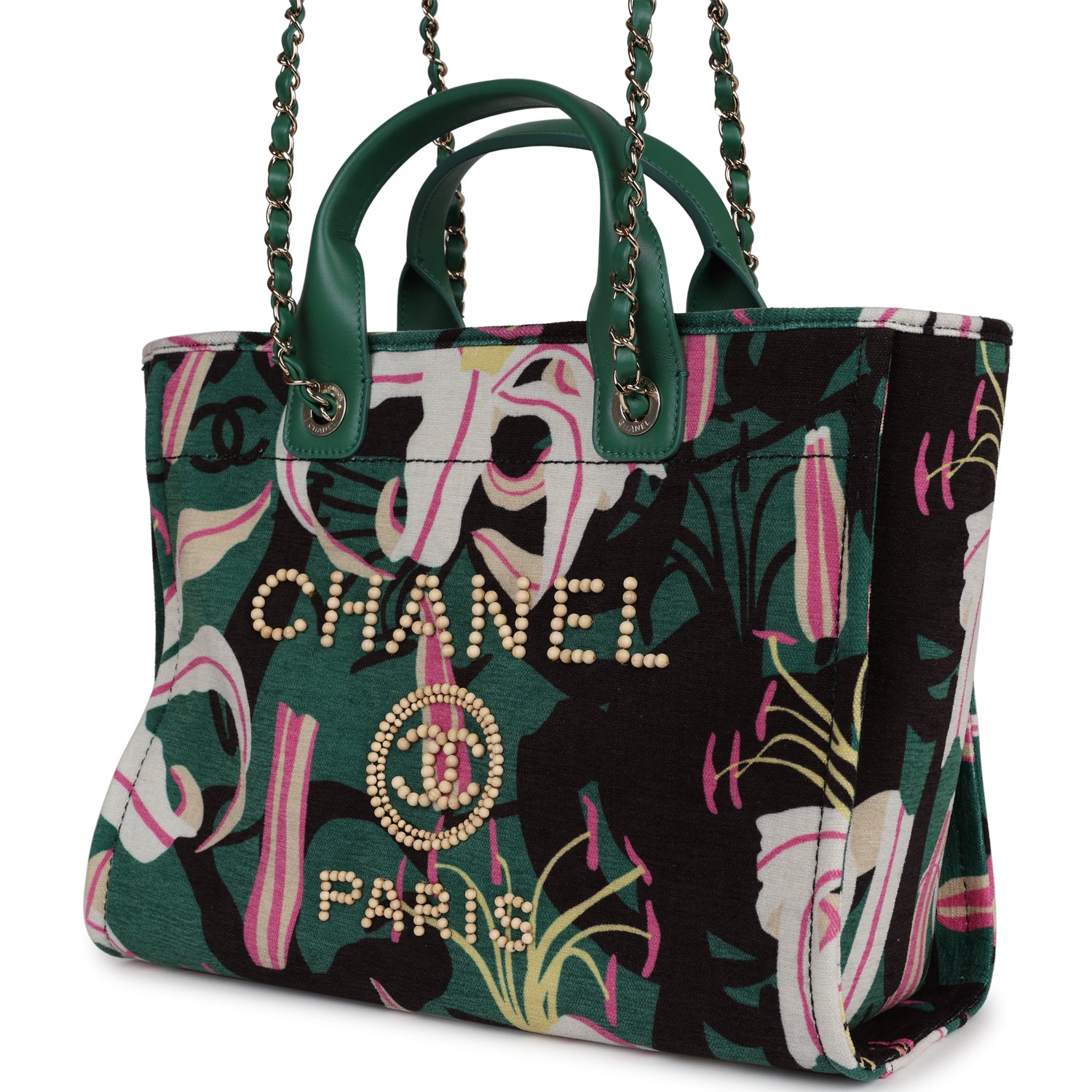 • Chanel Small Deauville Shopping Tote Green and Pink Tropical Floral Velvet Light Gold Hardware
