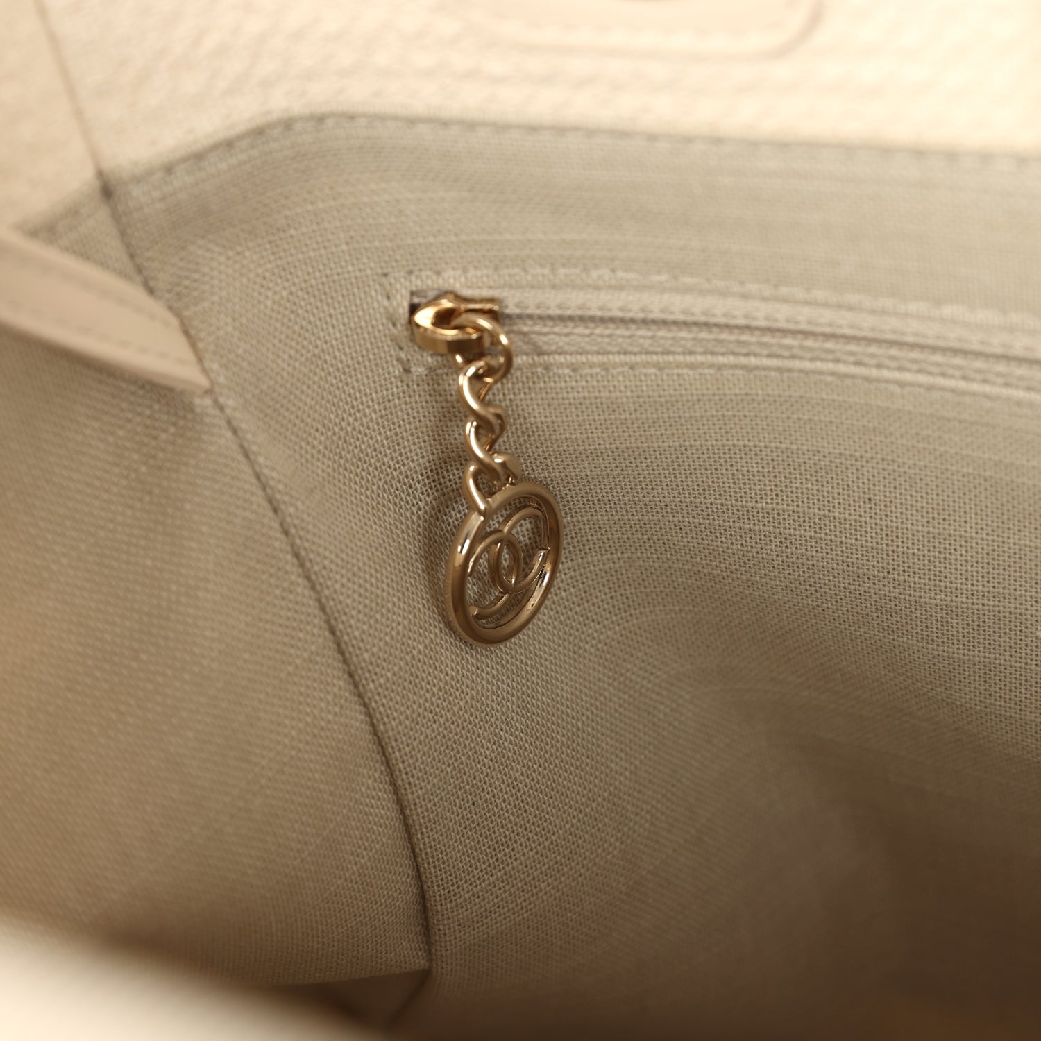 The interior is lined in beige linen fabric and has two open pockets on the front wall and a zipper pocket with a Chanel pull on the rear wall.