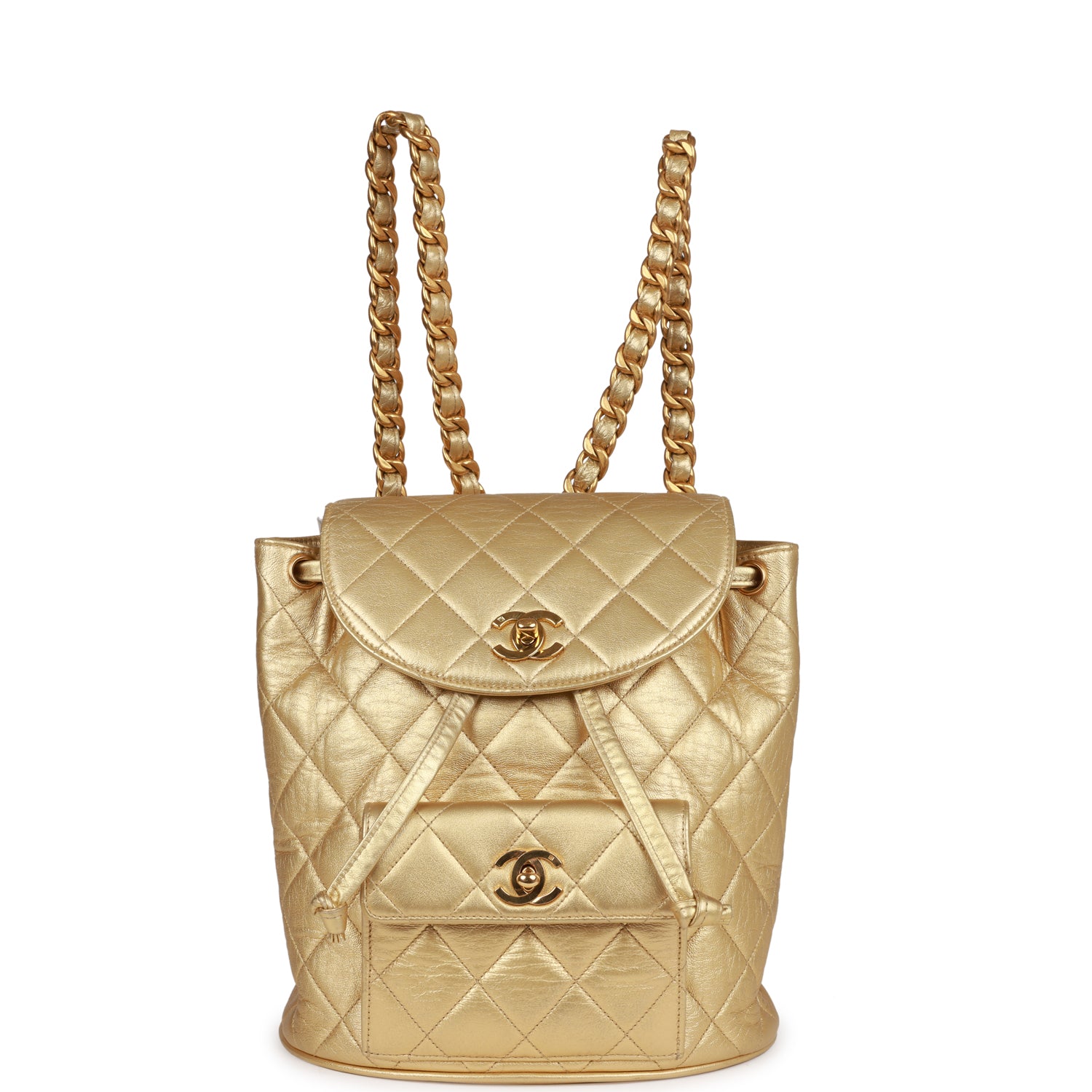 This?Vintage Duma backpack is in?Gold metallic lambskin with gold hardware, signature CC interlocking closure with front flap, an additional drawstring closure, exterior front pocket, two shoulder straps for backpack use, and gold metal and gold leather chain.