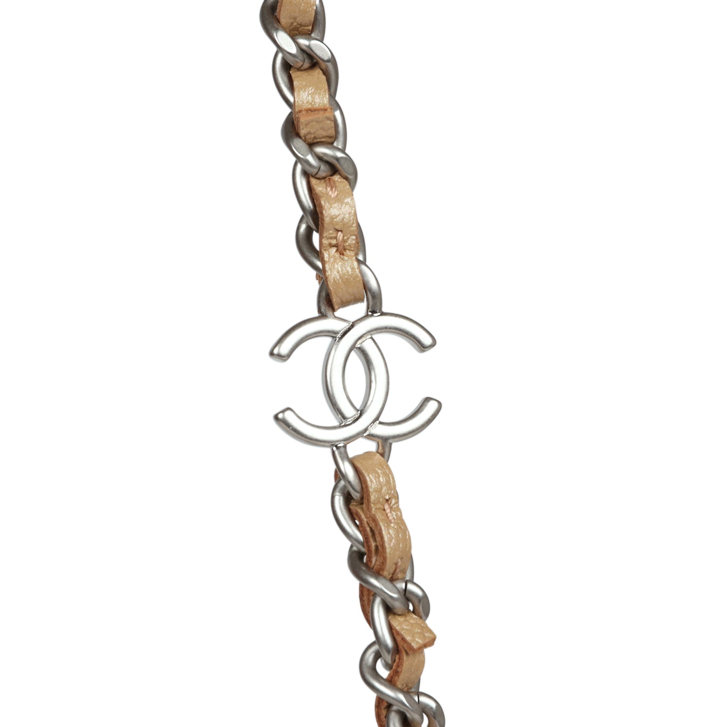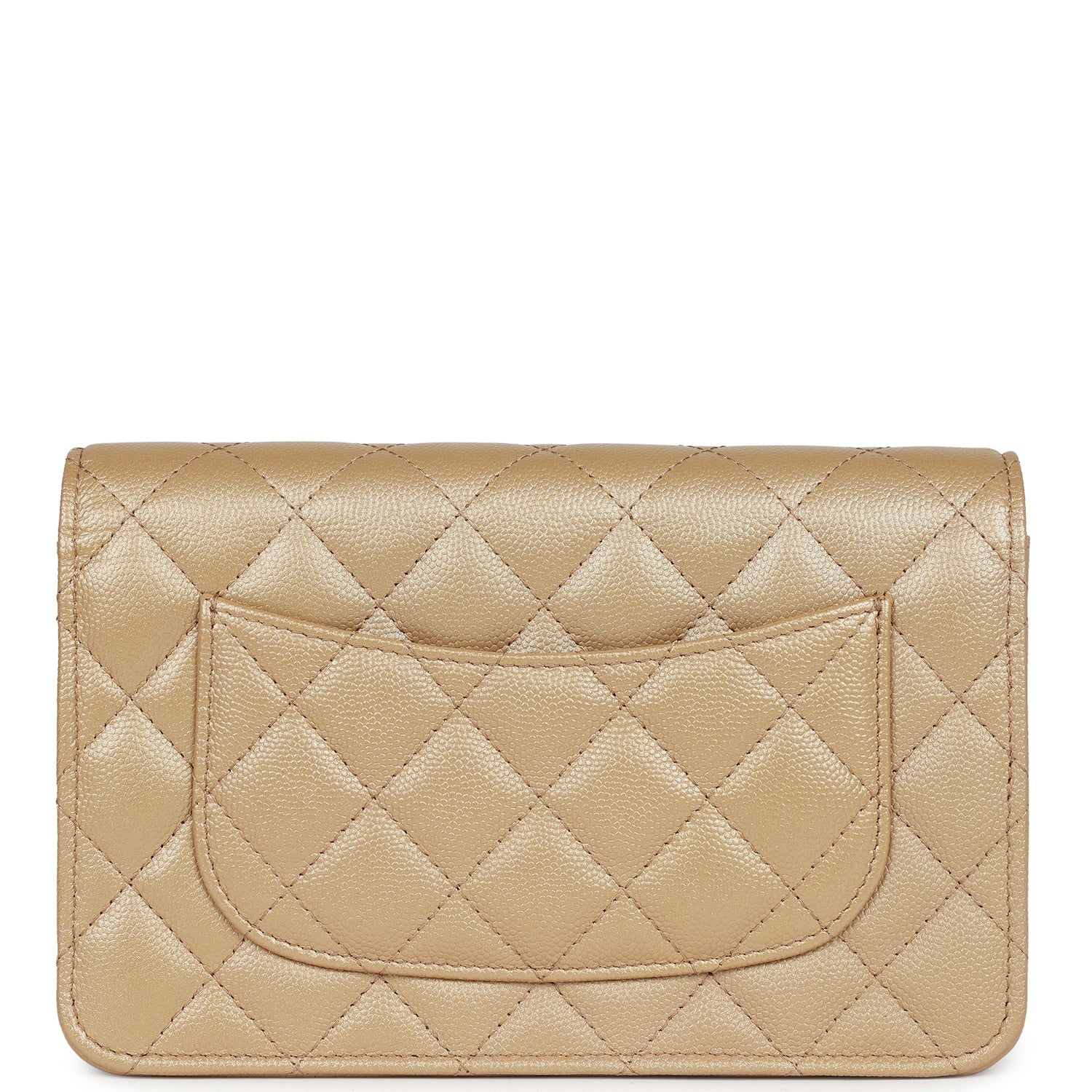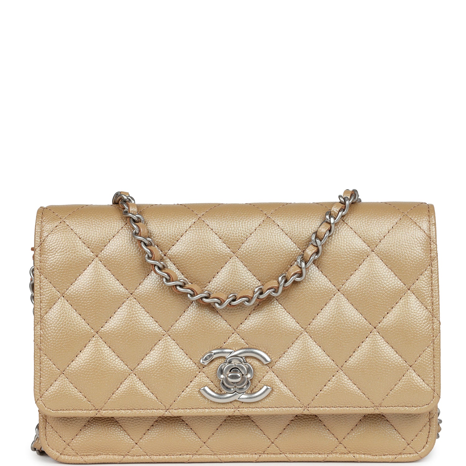 This Wallet on Chain is in Beige?Iridescent Caviar?with silver hardware, signature half moon exterior back pocket, back pocket as well as a tonal chain-link crossbody strap/shoulder strap with a matte silver CC and a camellia flower charm, and front CC gold tone button closure.