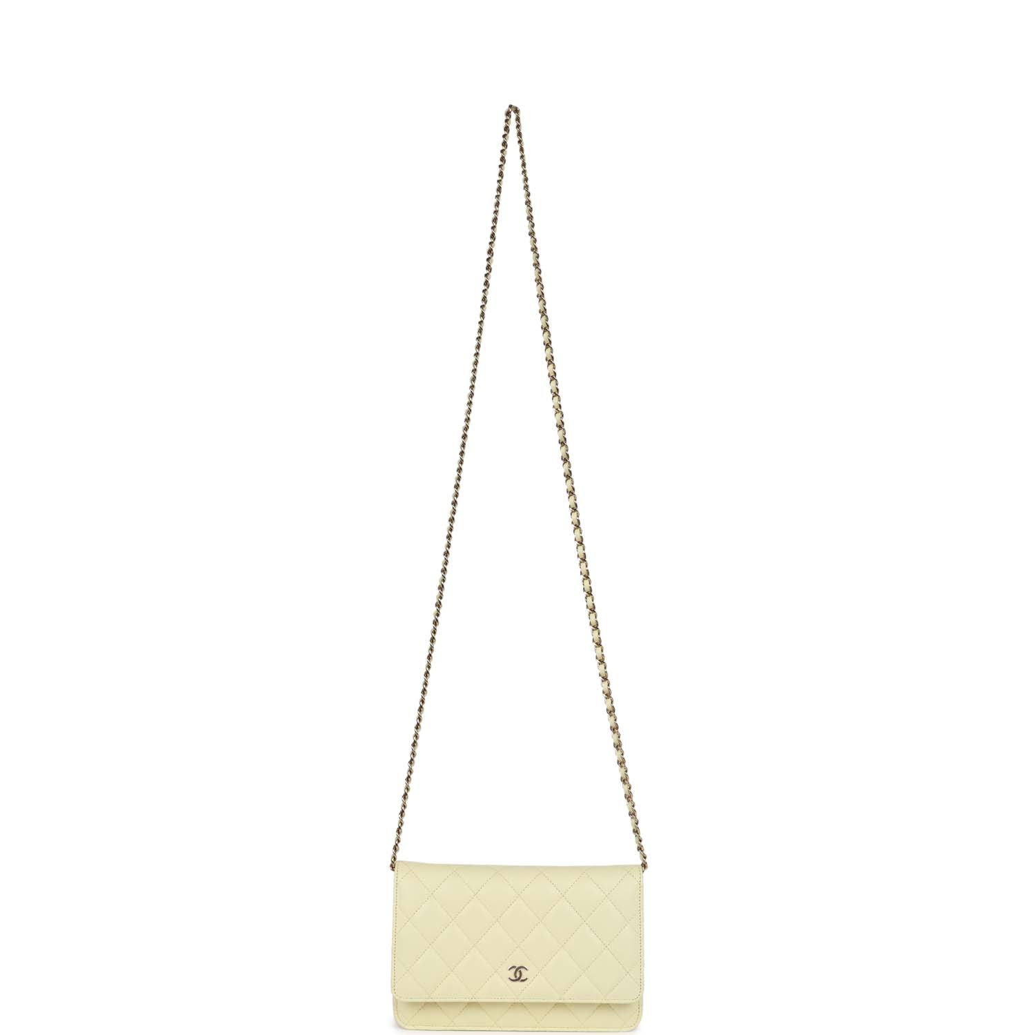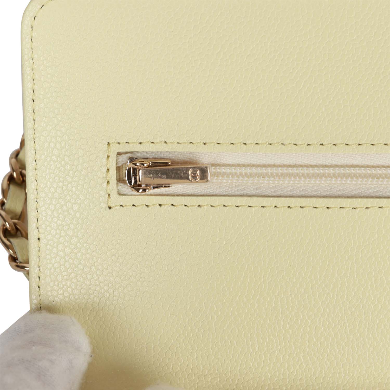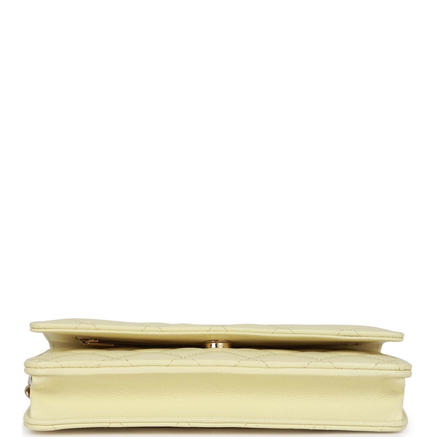 This?Wallet on Chain is in Yellow caviar with?light gold tone hardware and has a front flap with CC emblem and magnetic snap closure, half moon back pocket and long?light gold tone metal?and green leather chain.