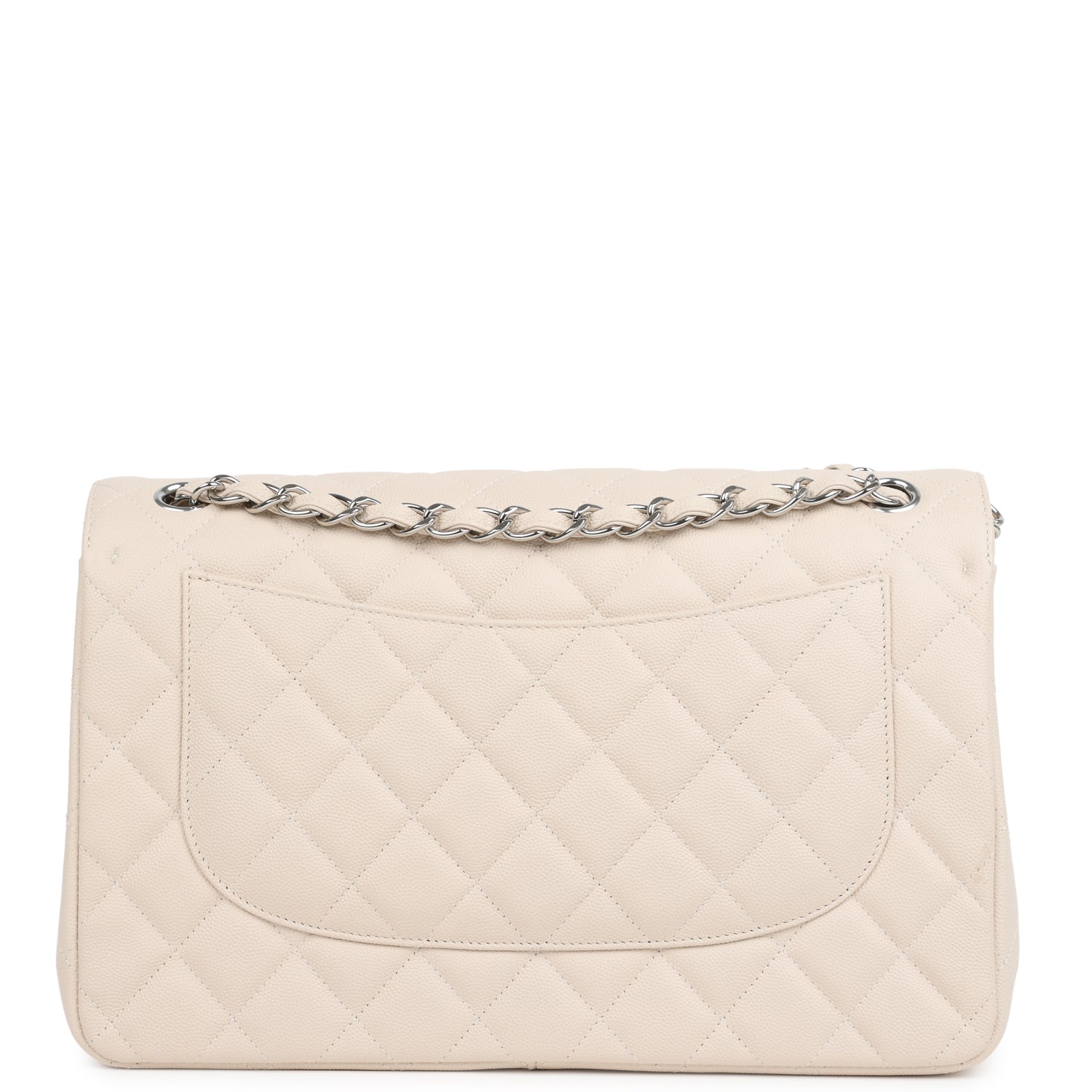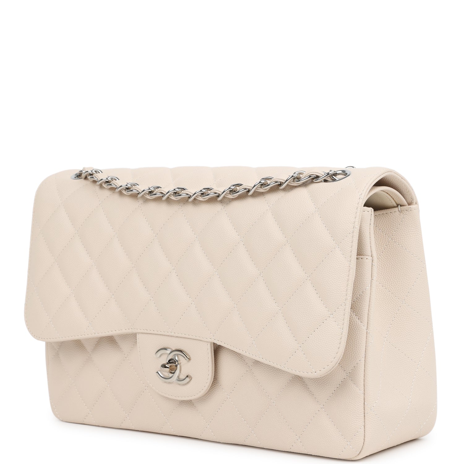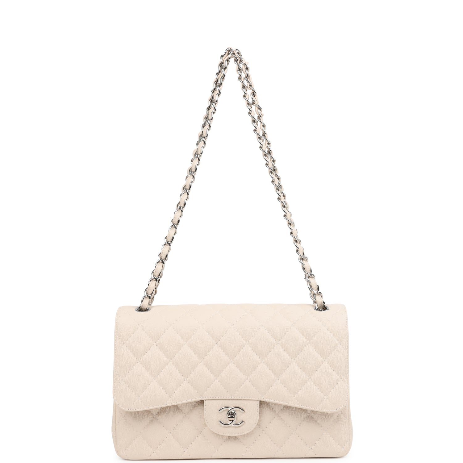 This Jumbo Classic Double Flap bag is in light beige caviar leather with silver tone hardware and features a front flap with signature CC turnlock closure, half moon back pocket, and adjustable interwoven silver tone chainlink and light beige leather shoulder strap.