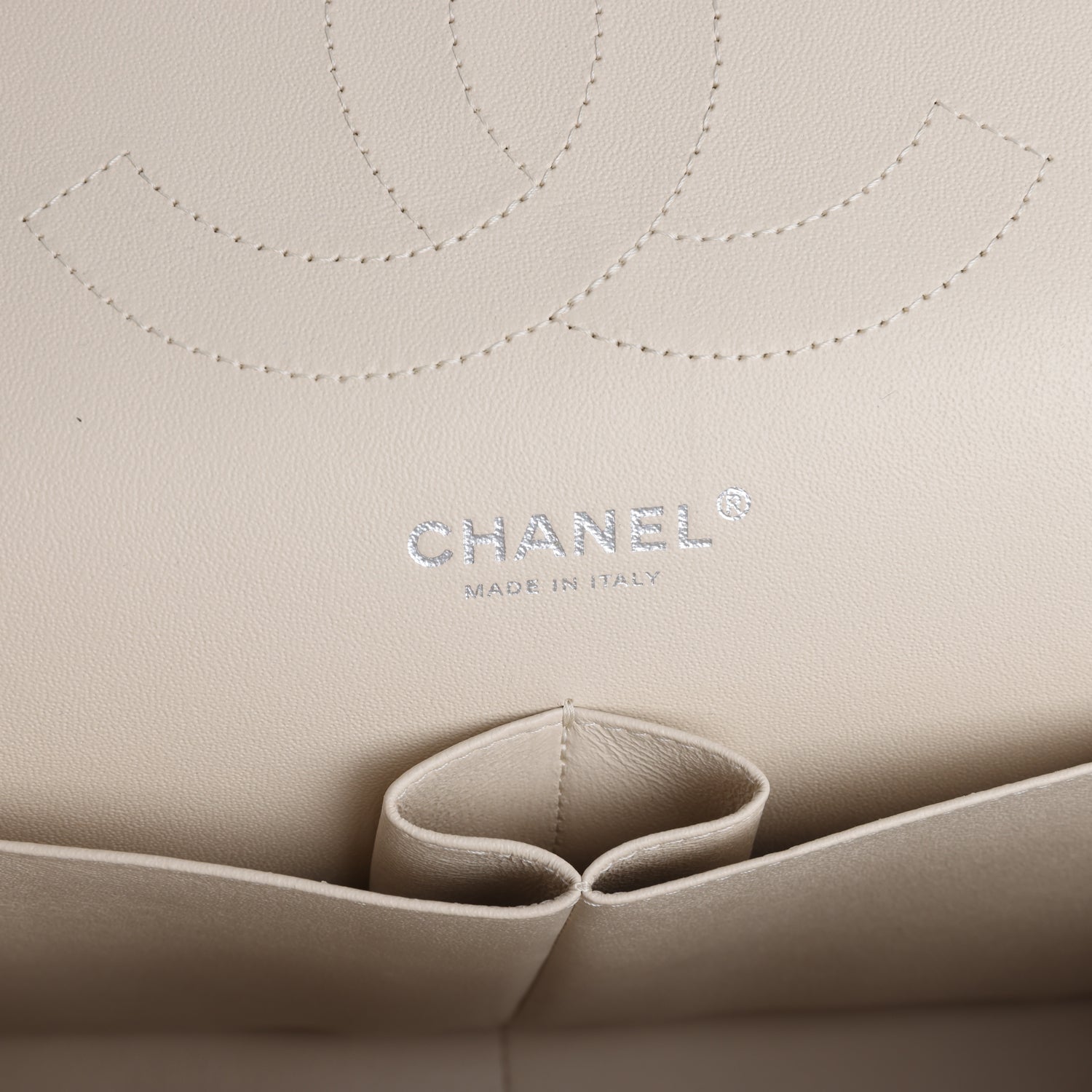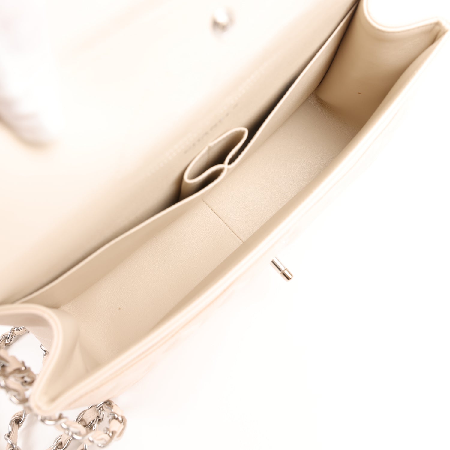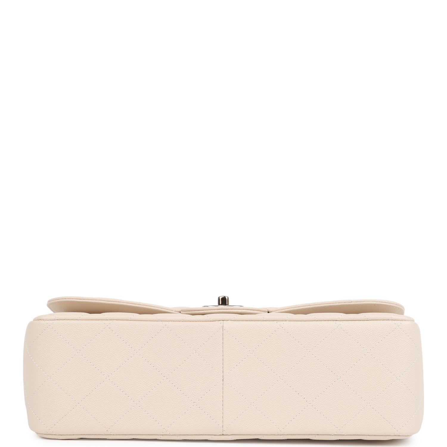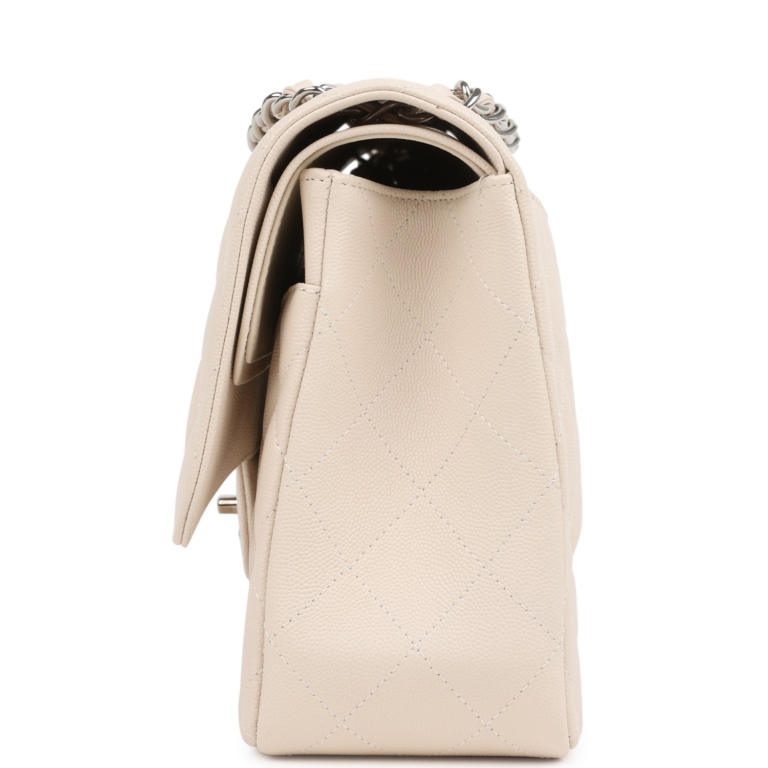 This Jumbo Classic Double Flap bag is in light beige caviar leather with silver tone hardware and features a front flap with signature CC turnlock closure, half moon back pocket, and adjustable interwoven silver tone chainlink and light beige leather shoulder strap.