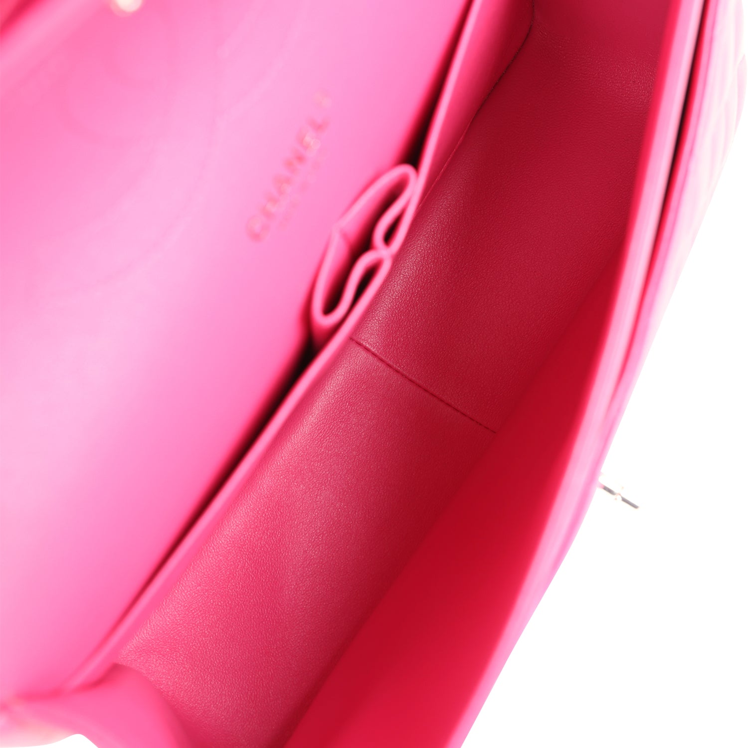 This Chanel Jumbo Classic Double Flap bag is in pink lambskin leather with silver tone hardware and features a front flap with signature CC turnlock closure, half moon back pocket, and adjustable interwoven silver tone chainlink and pink leather shoulder strap.