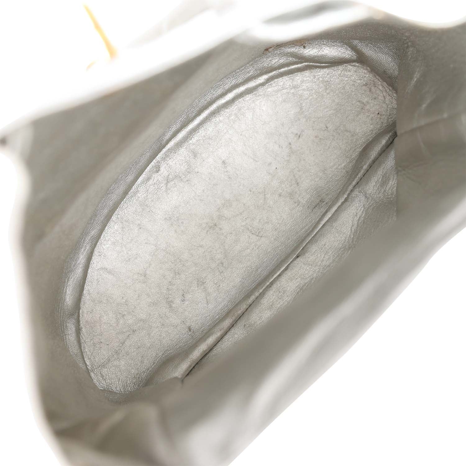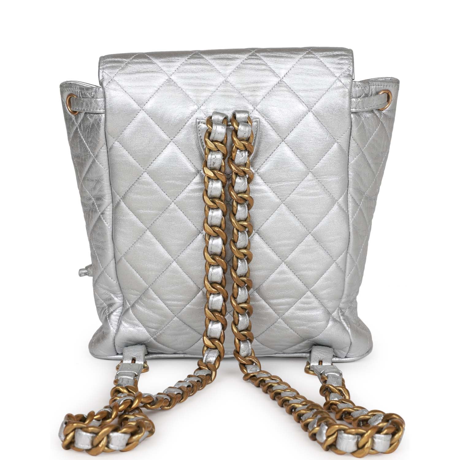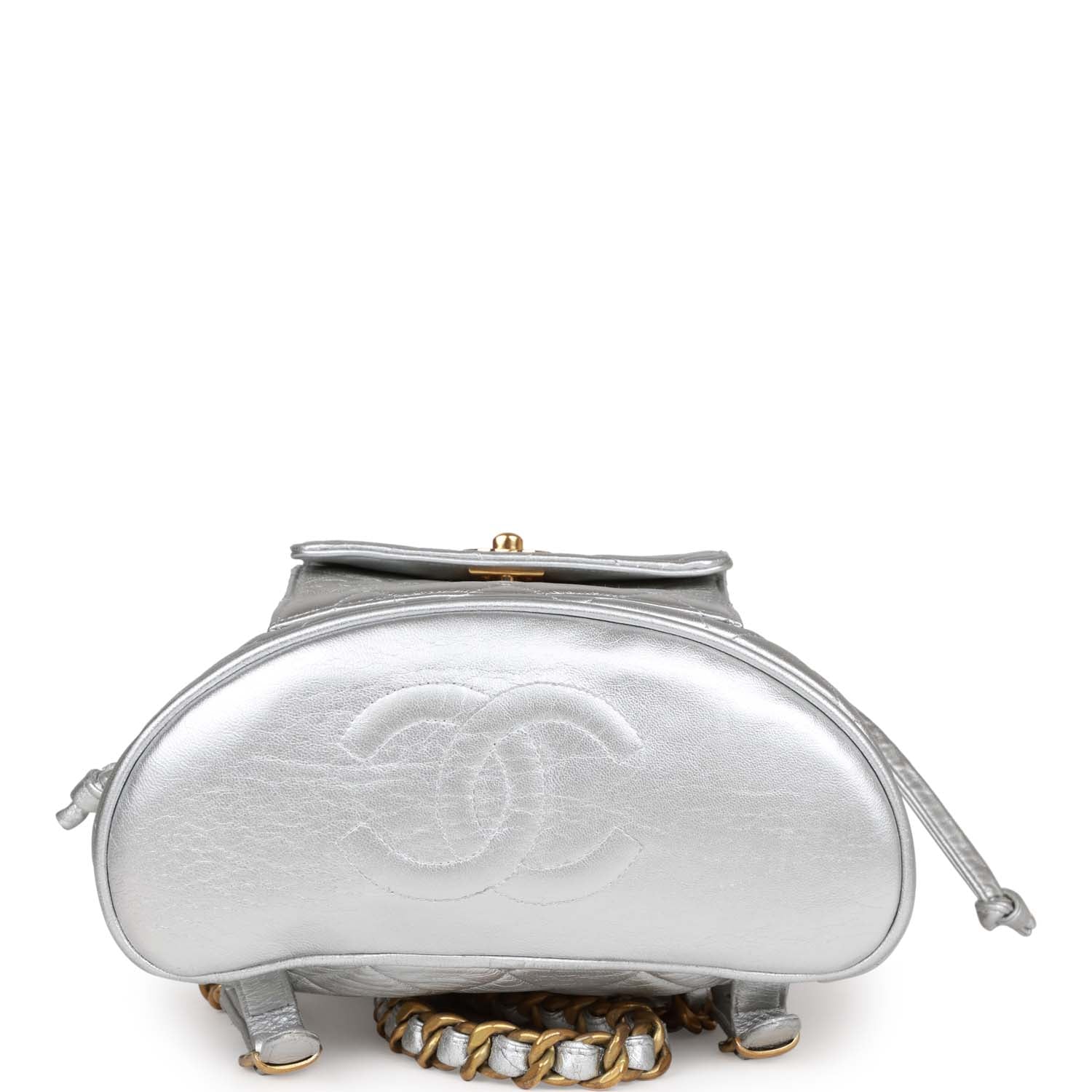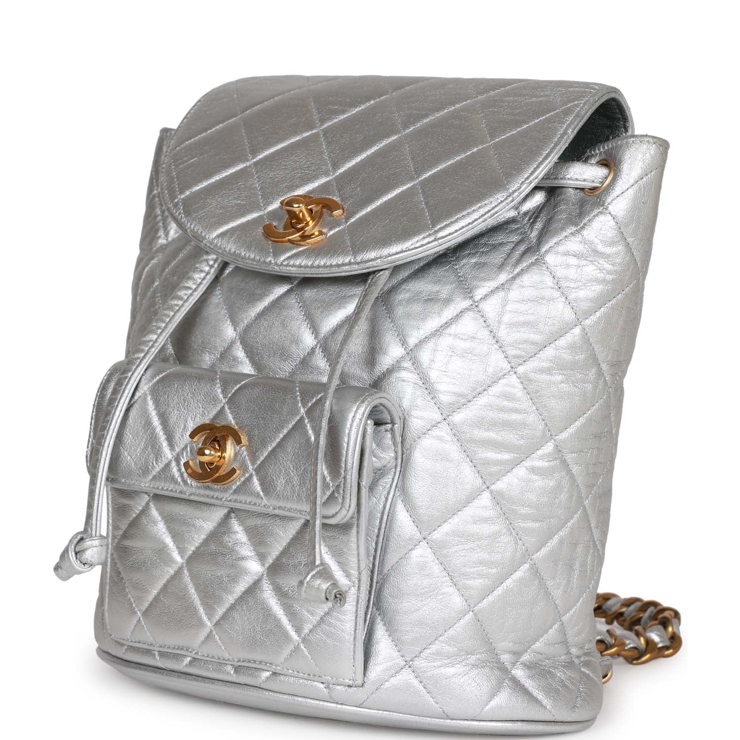 This?Vintage Duma backpack is in?Silver?metallic lambskin with gold hardware, signature CC interlocking closure with front flap, an additional drawstring closure, exterior front pocket, two shoulder straps for backpack use, and gold metal and?silver leather chain.