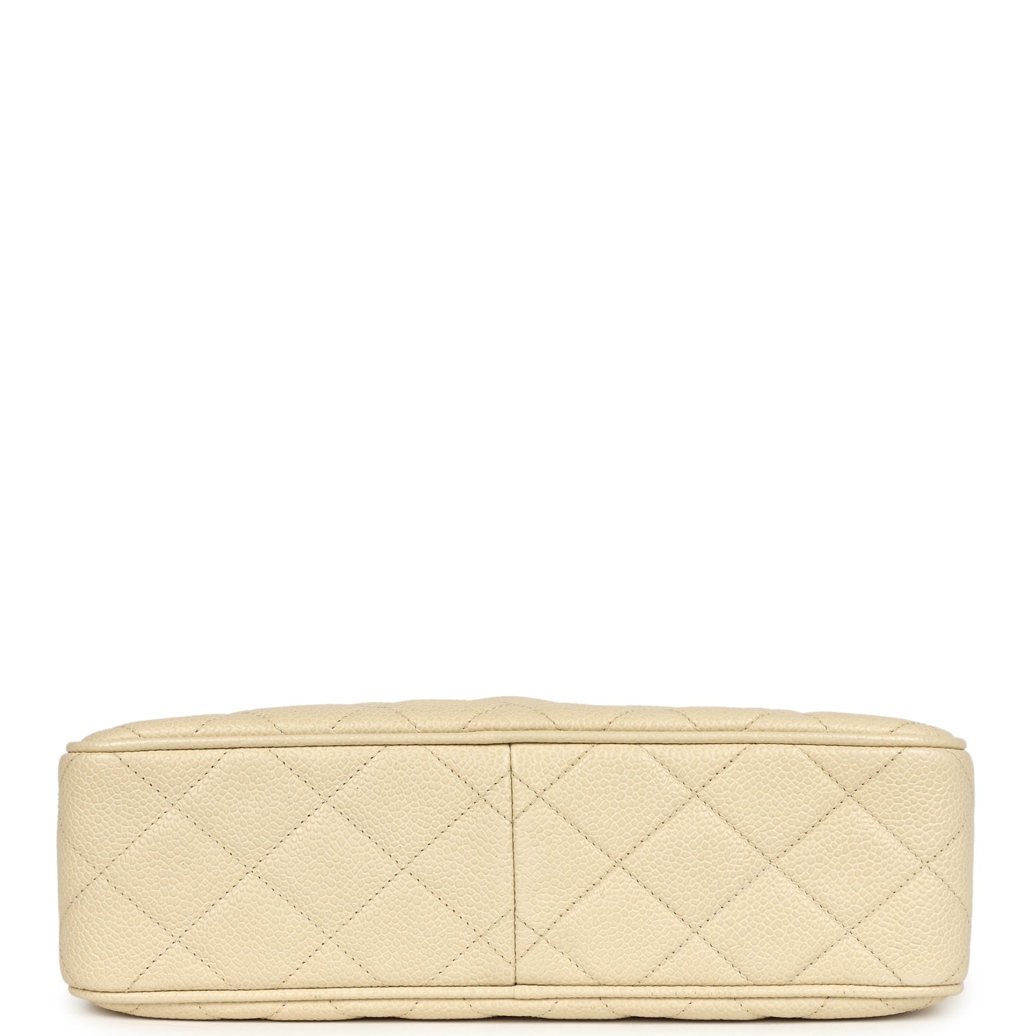 This vintage Chanel Medium Camera Bag is of light beige caviar leather with gold hardware, featuring signature diamond quilt with signature CC logo on the front, a zipper closure with quilted CC Ball zipper pull, and a single interwoven light beige leather and gold tone chain link shoulder/crossbody strap.