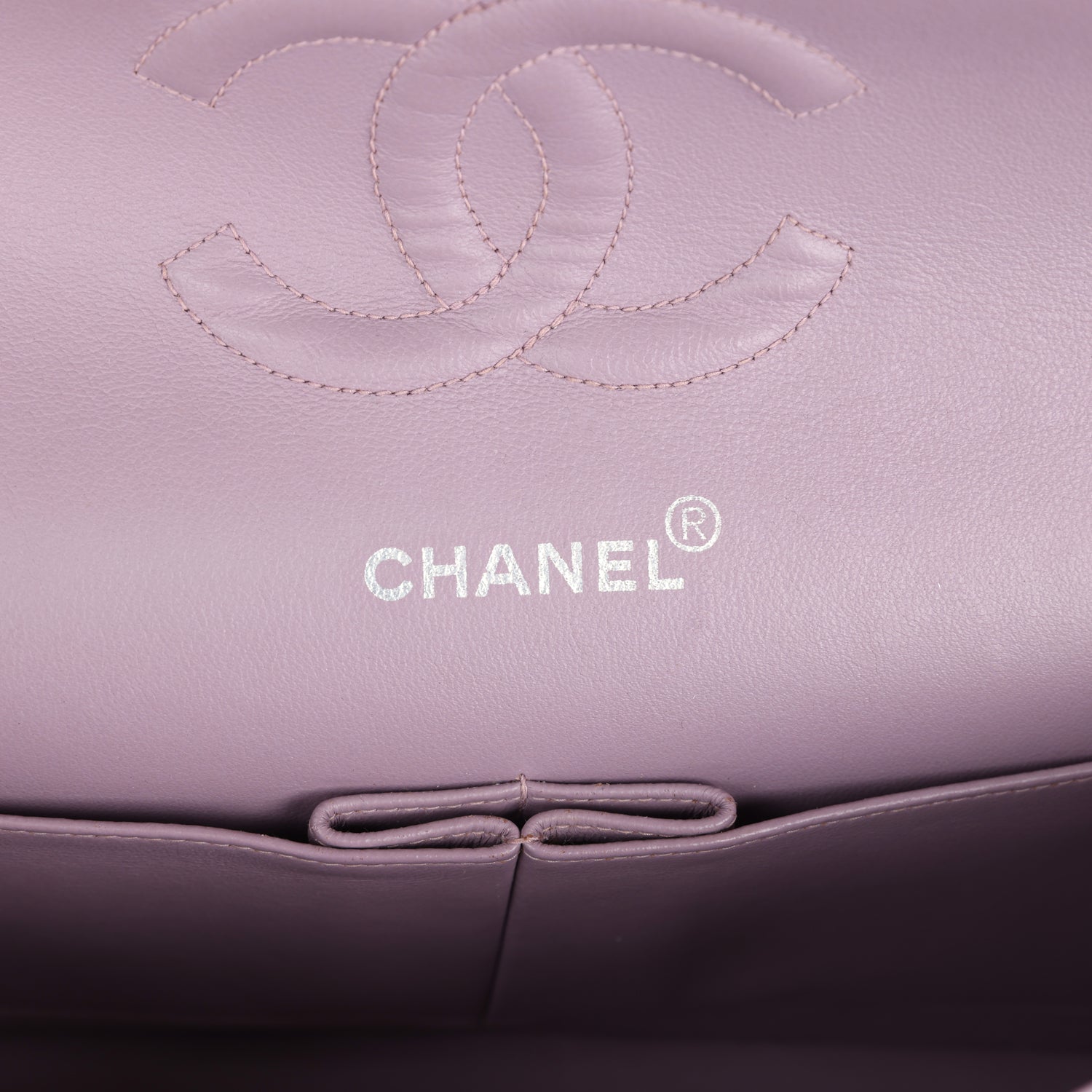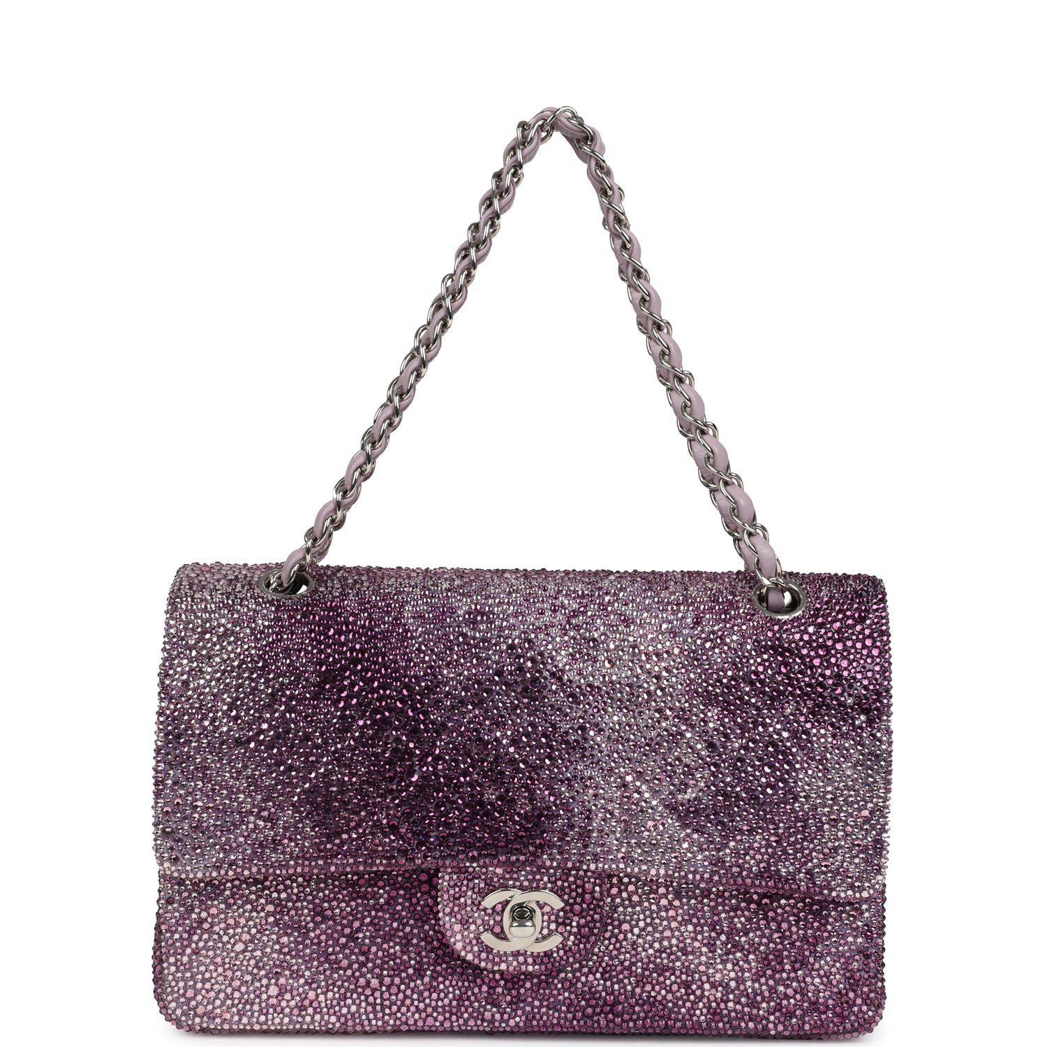 This vintage bedazzled Medium Classic Double Flap bag is in lilac lambskin leather with silver tone hardware and features a front flap with signature CC turnlock closure, half moon back pocket, and adjustable interwoven silver tone chain link and Lilac leather shoulder strap. This customized classic flap with a gradient pattern has been hand-painted and hand crafted with the finest shades of purple Swarovski crystals.