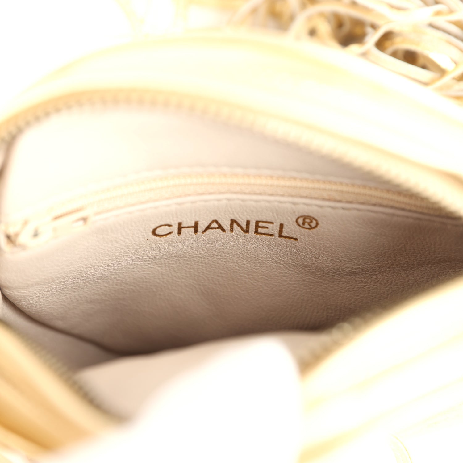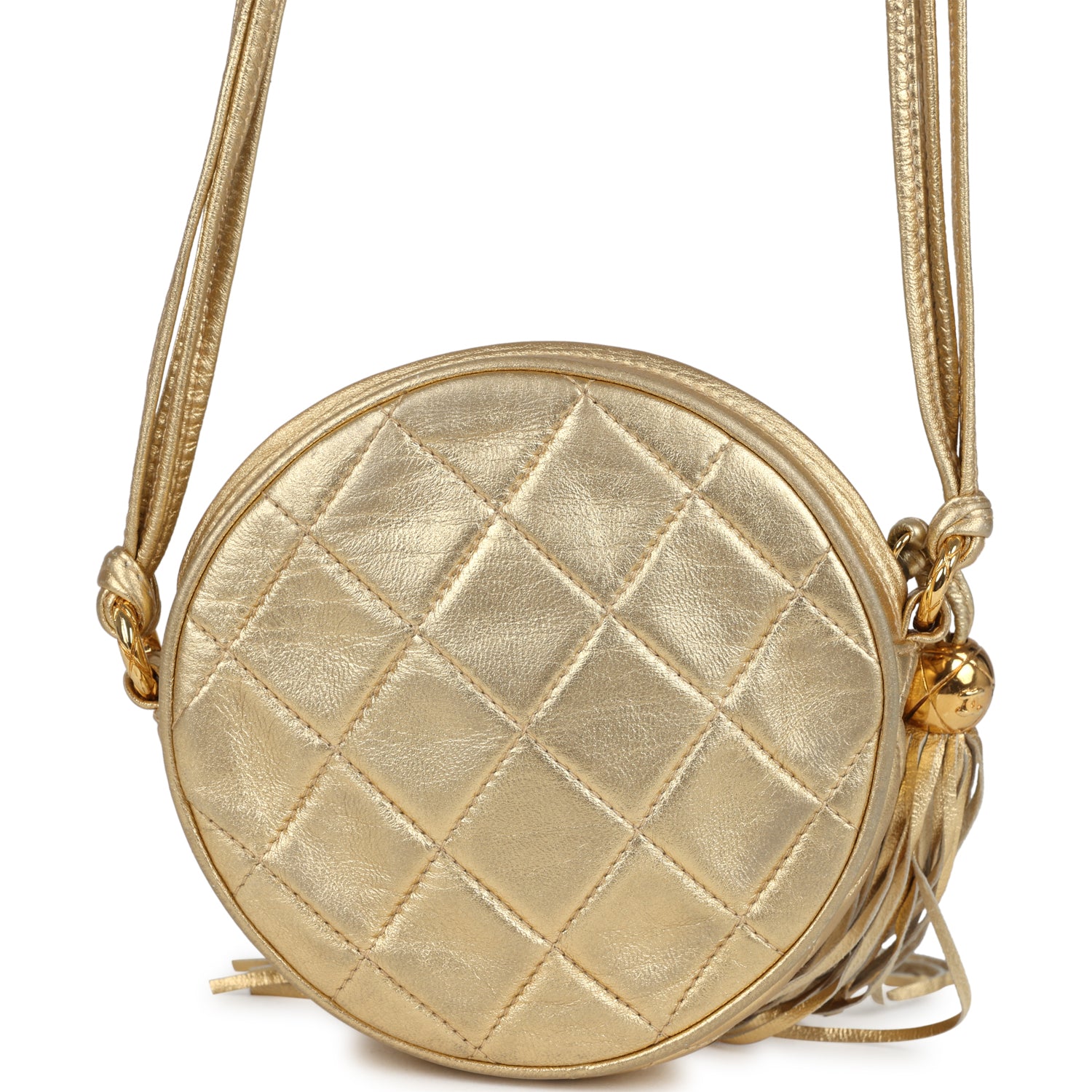 This vintage Chanel Mini CC Round Crossbody Bag is of gold lambskin with gold tone hardware, featuring signature diamond quilt, a quilted CC logo on the front, top zipper closure with tassel zipper pull, and a shoulder strap made of four separate leather straps joined together.