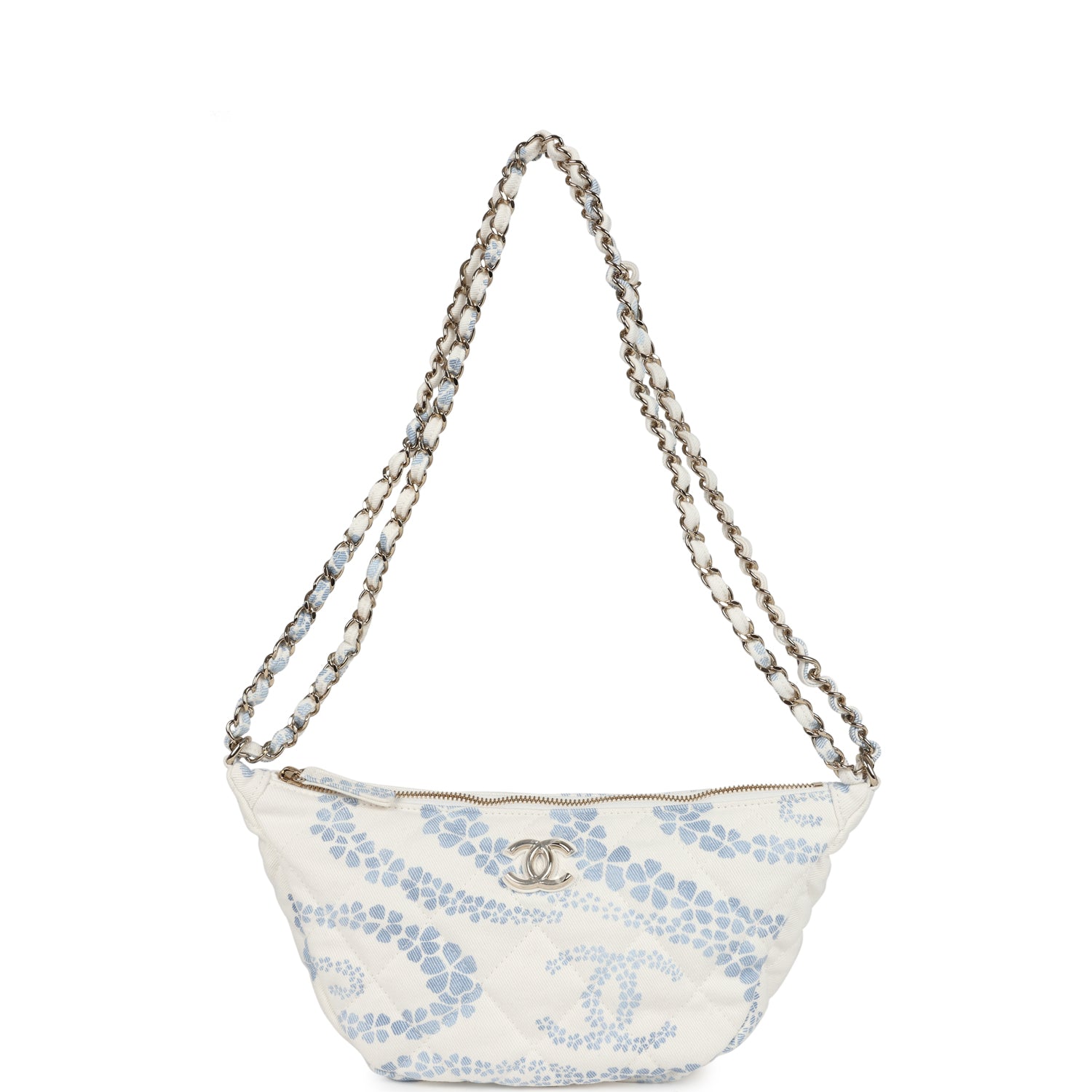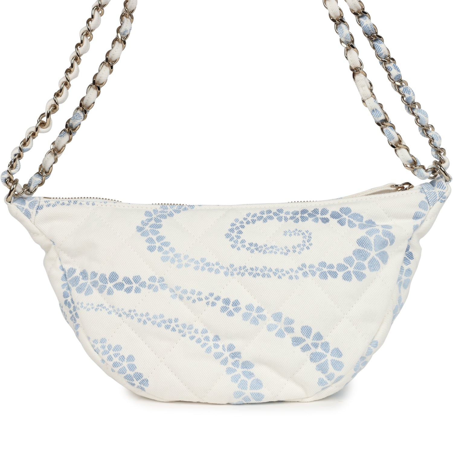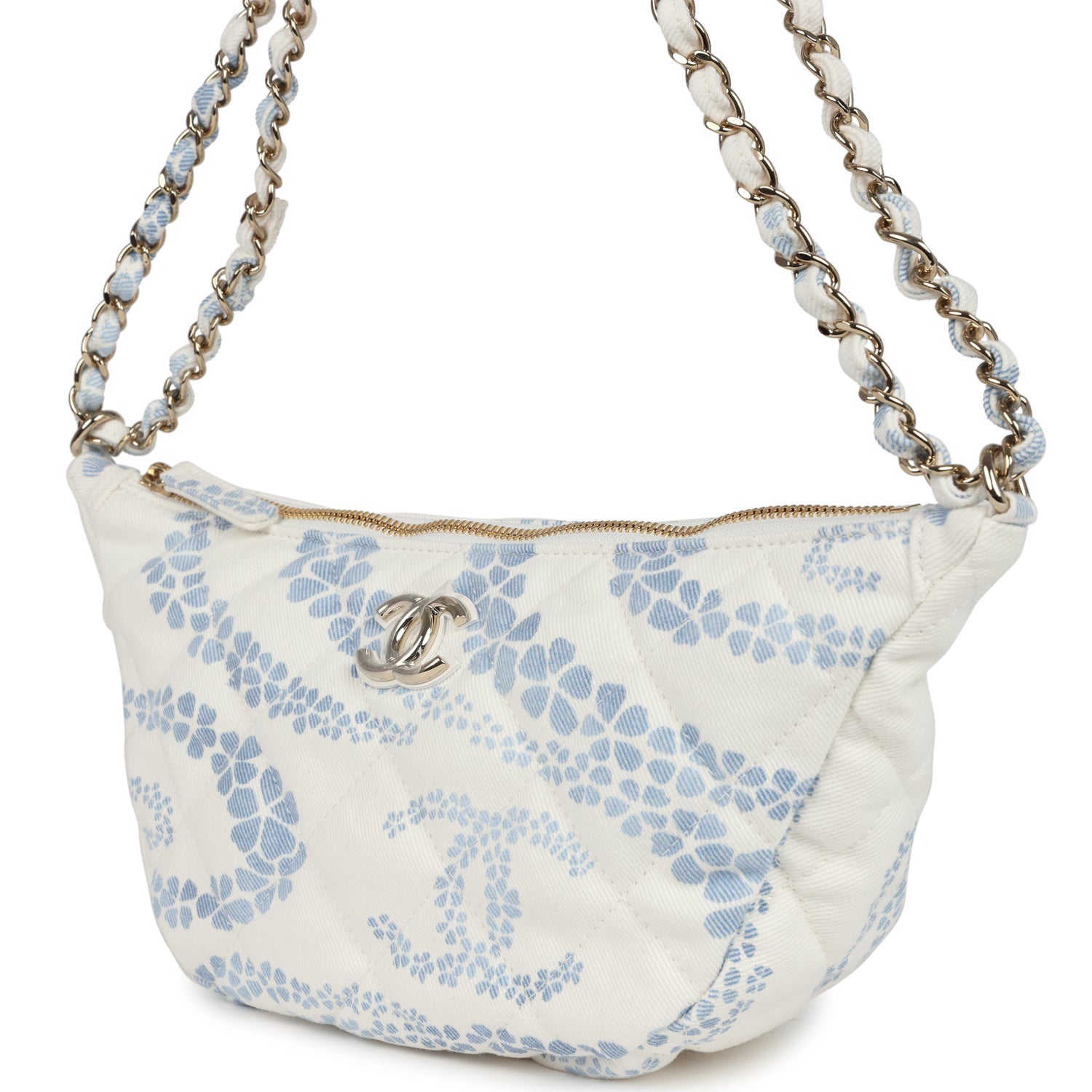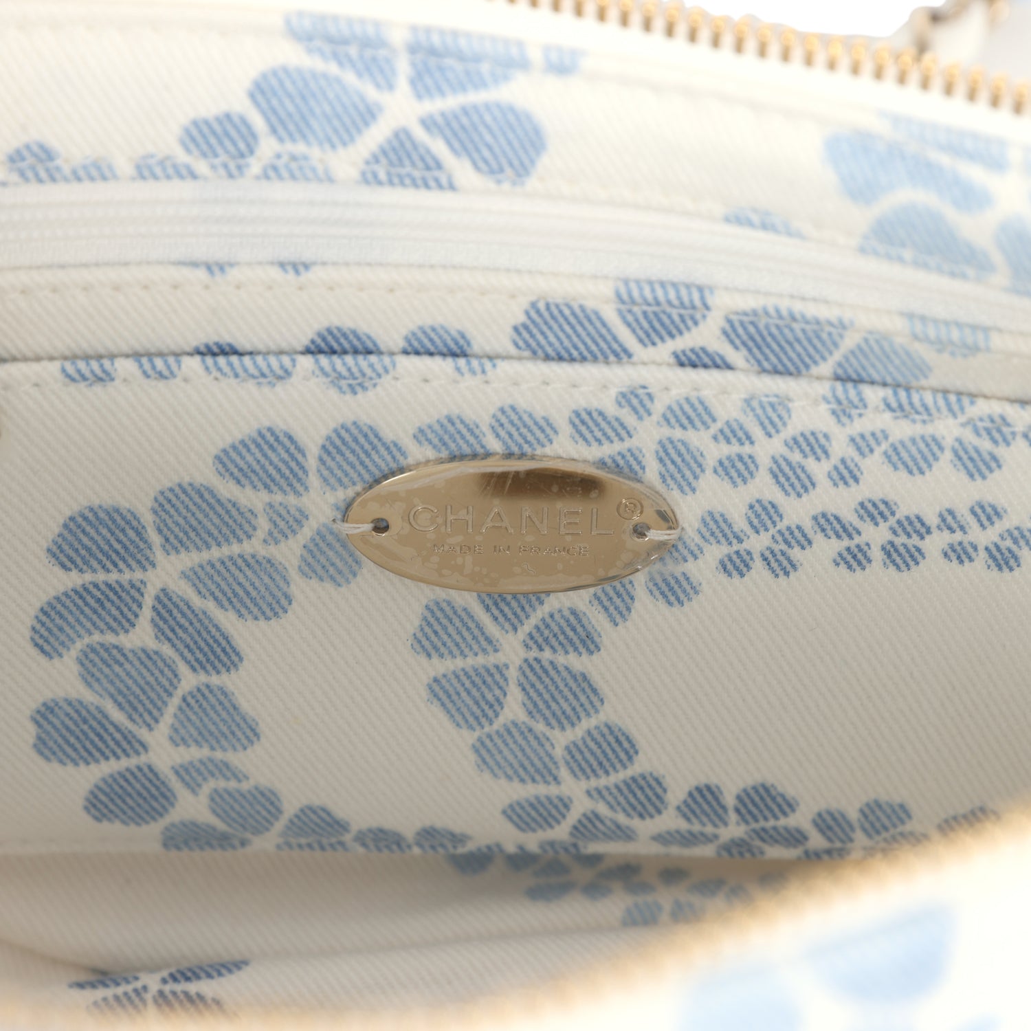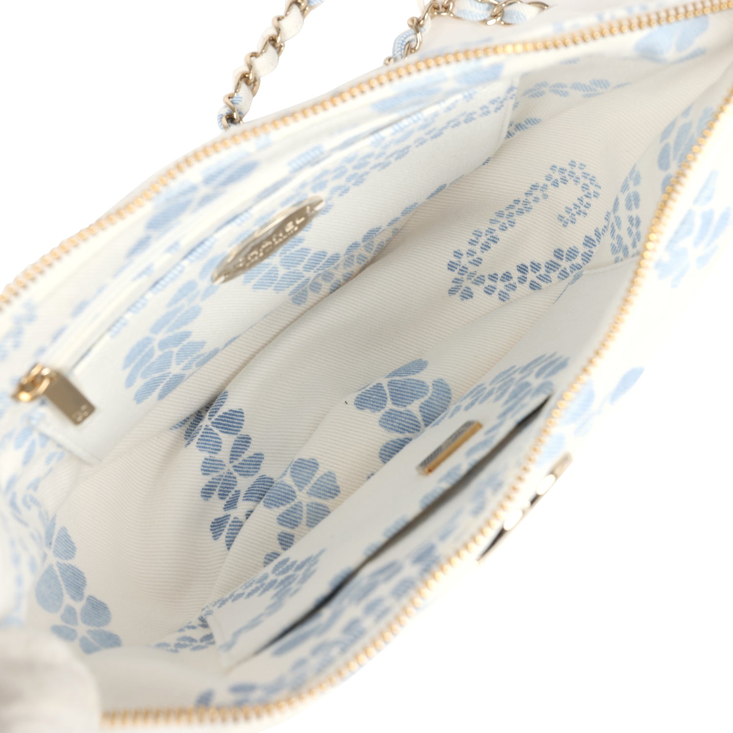 This Chanel Large Coco Beach Hobo Bag is in white and blue printed denim with light gold tone hardware, featuring quilted white denim with light blue CC and floral design printed all over, signature CC logo on the front, zipper closure, and a single Interwoven light gold tone chainlink and printed denim shoulder/crossbody strap.