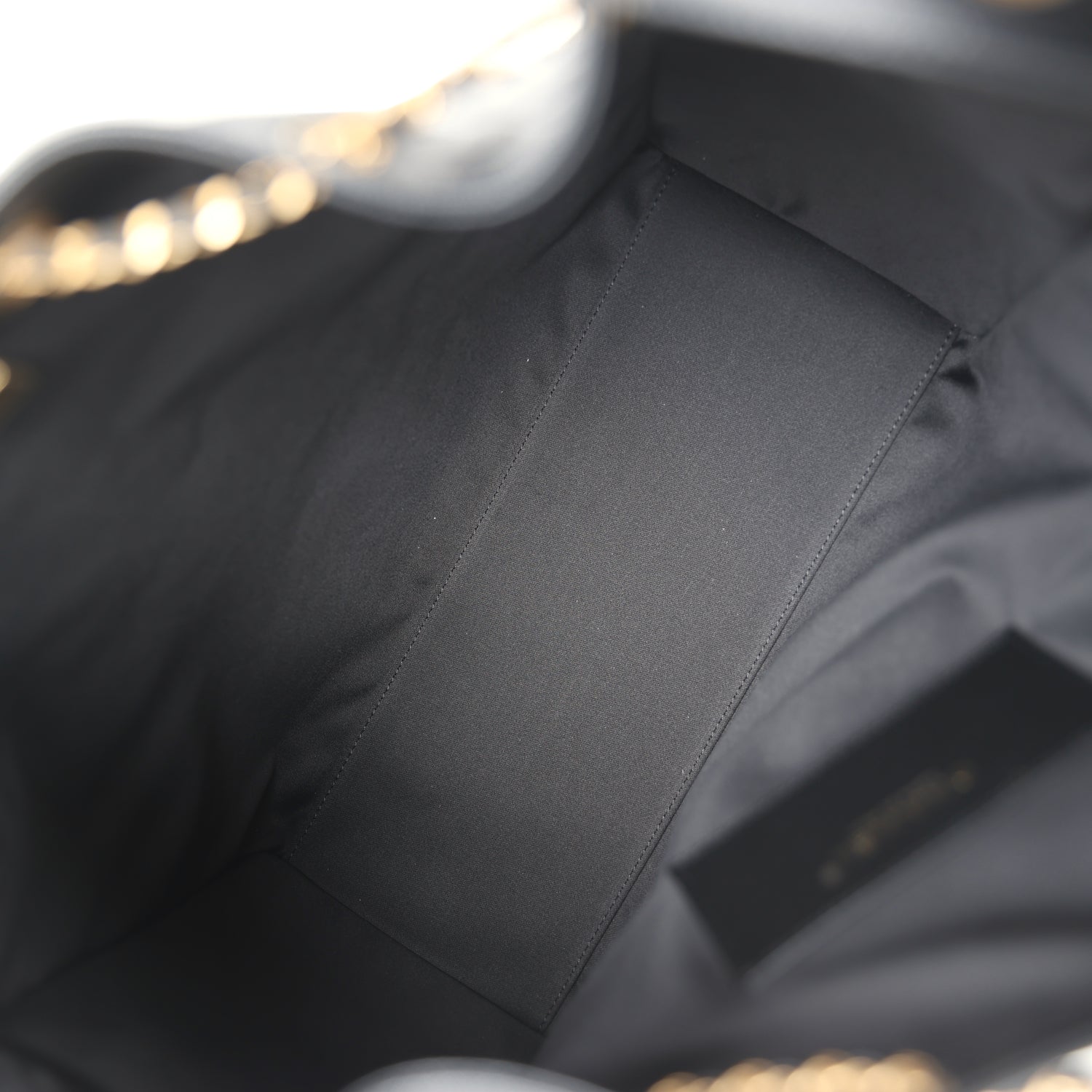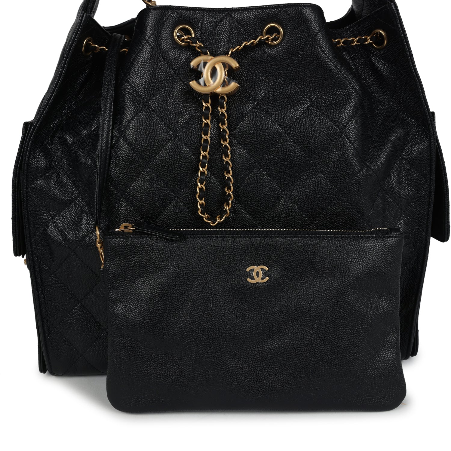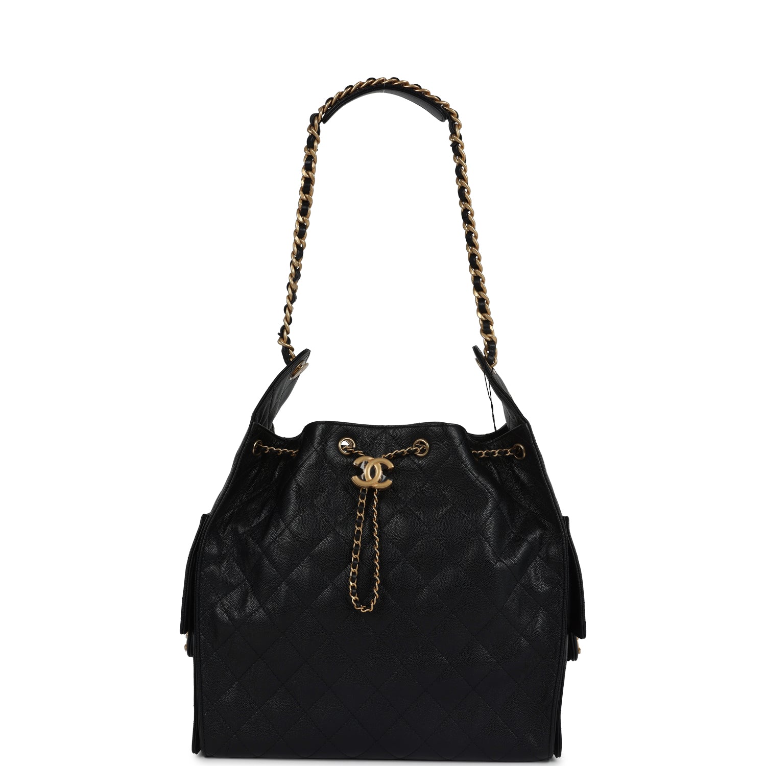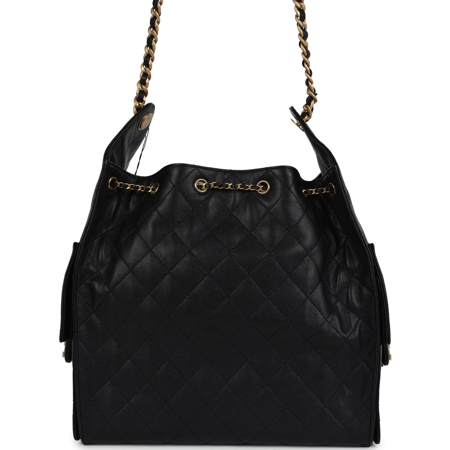 This Chanel Medium 25 Hobo Bag is in black caviar leather with antique gold hardware, features signature diamond quilt, two exterior side pockets, drawstring closure, a removable pouch, and a single interwoven antique gold and Black leather shoulder strap.