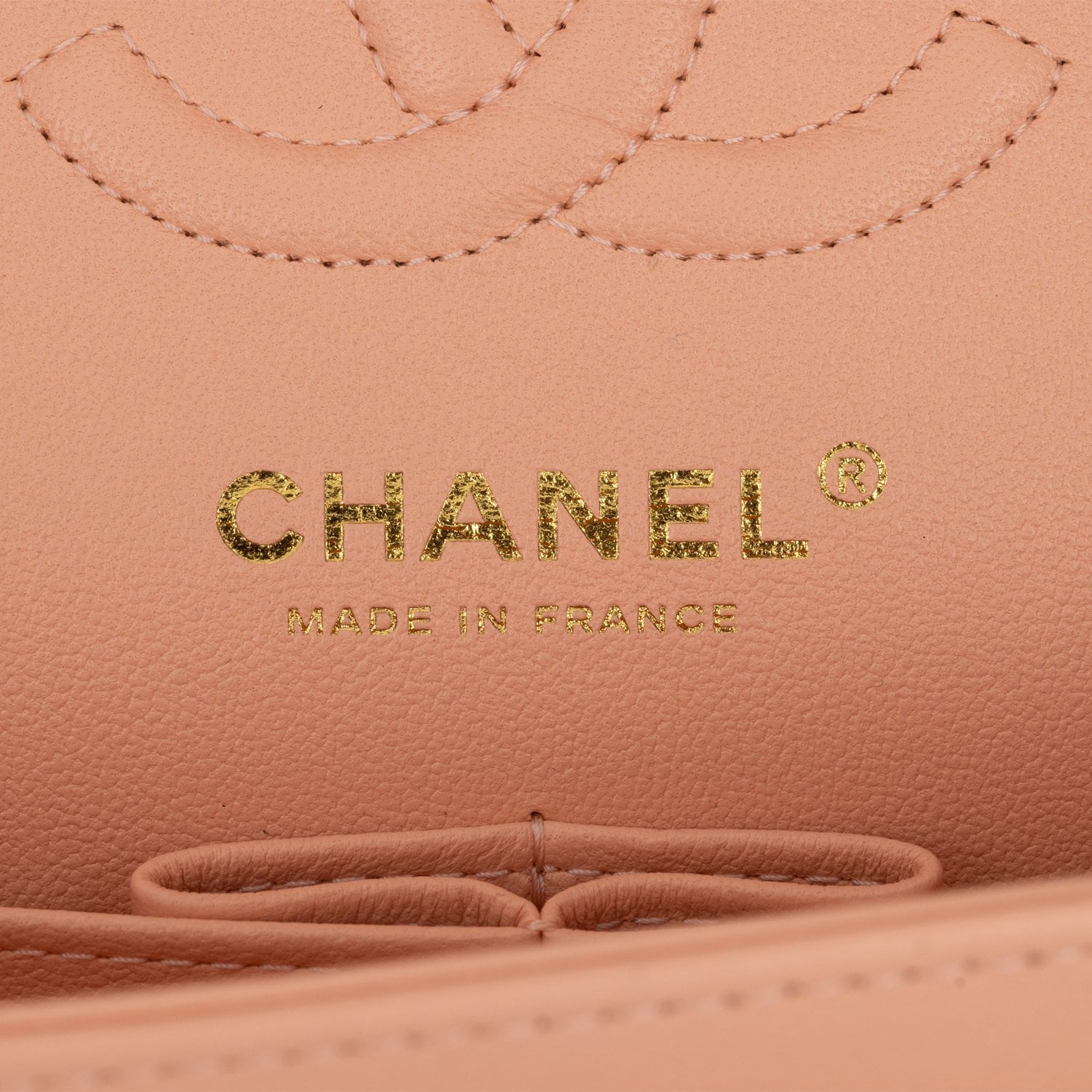 This Small Classic Double Flap bag is in?peach?lambskin leather with light gold tone hardware and features a front flap with signature CC turnlock closure, half moon back pocket, and adjustable interwoven light gold tone chain link and?peach leather shoulder strap.