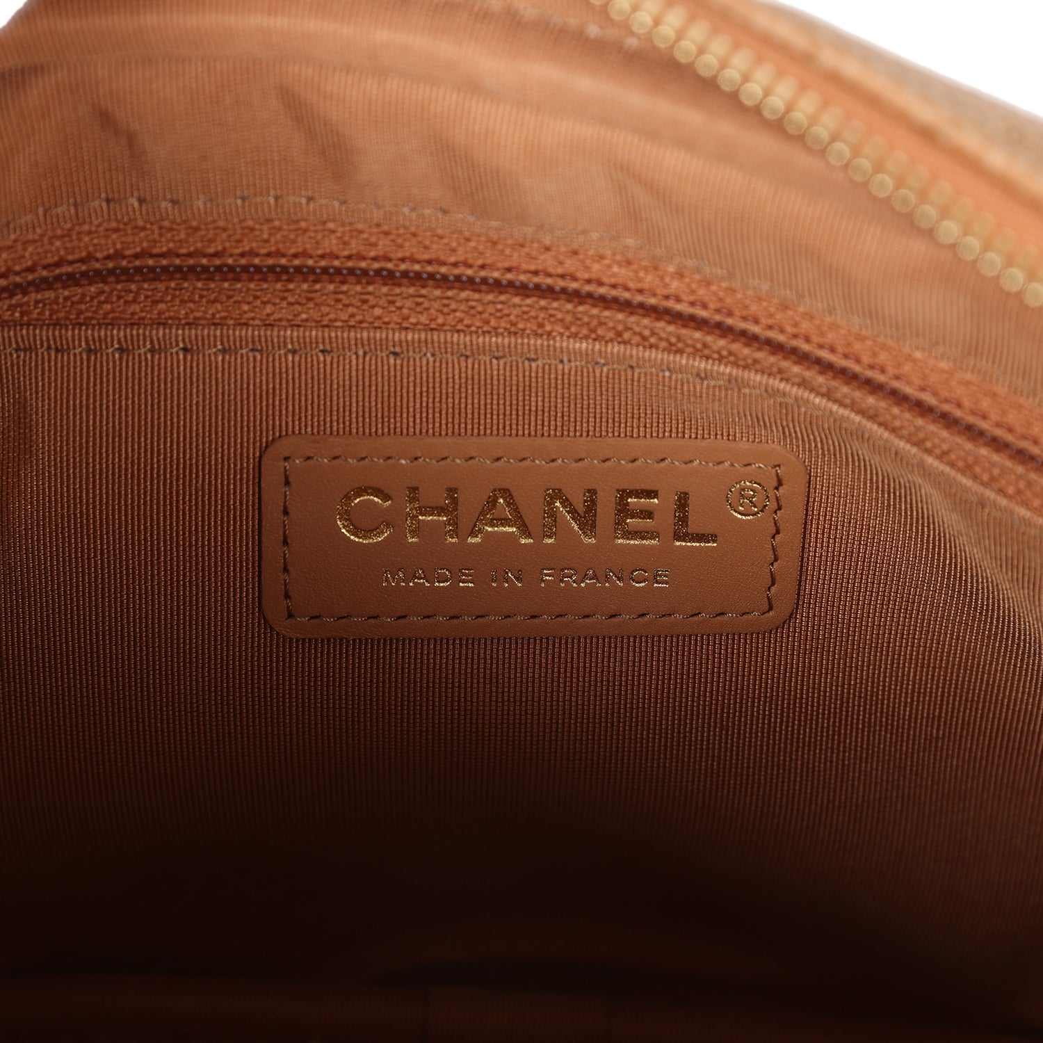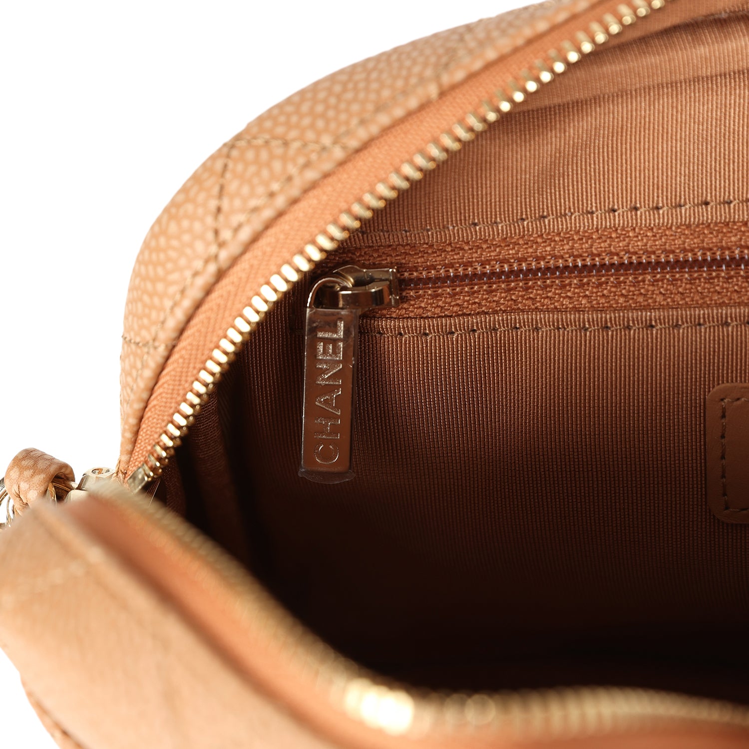 This Chanel camera case bag is of Dark Beige Matte caviar leather with Gold hardware, features tonal stitching, flat quilt, front pocket on front of camera bag with CC logo at the top center, zipper closure with zip tassel pull, has a long Gold tone crossbody/shoulder strap with interwoven Dark Beige leather.?