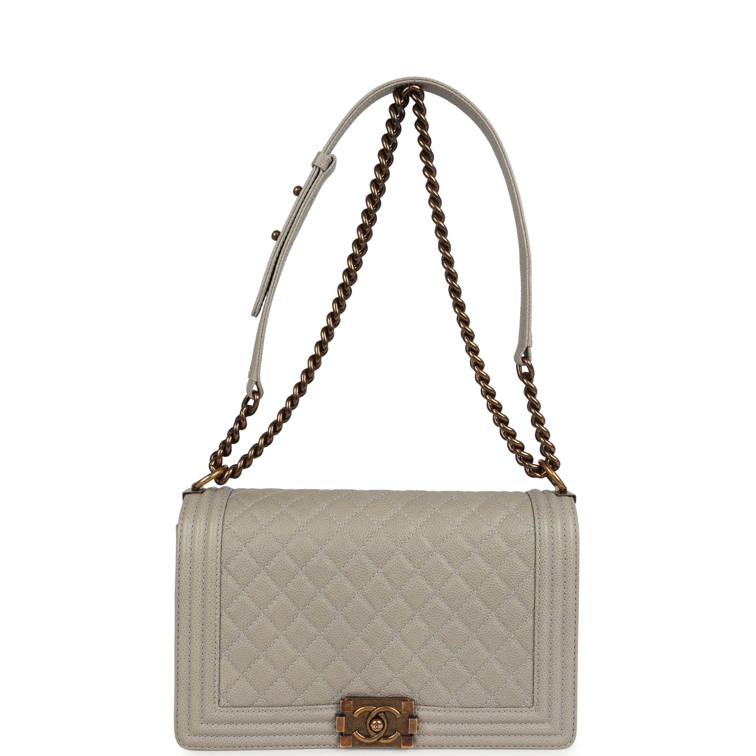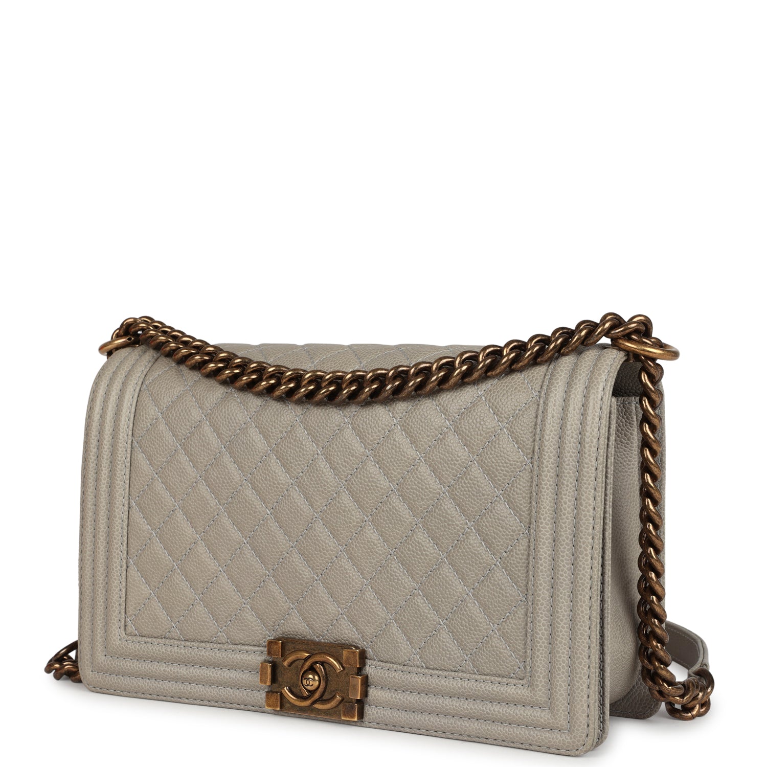 This Chanel New Medium Boy Bag is in grey caviar leather with antique gold hardware, featuring signature diamond quilt leather, front flap with Le Boy CC push closure, caviar leather trim, and Antique gold chainlink and leather shoulder strap.