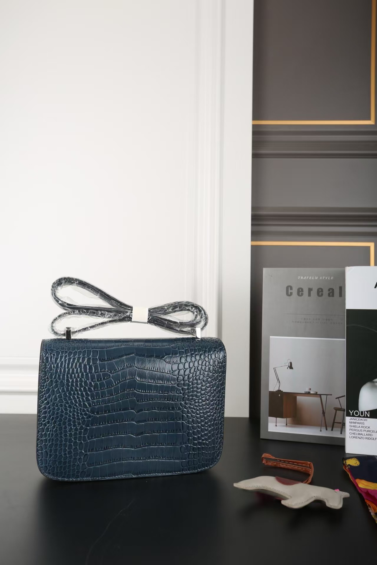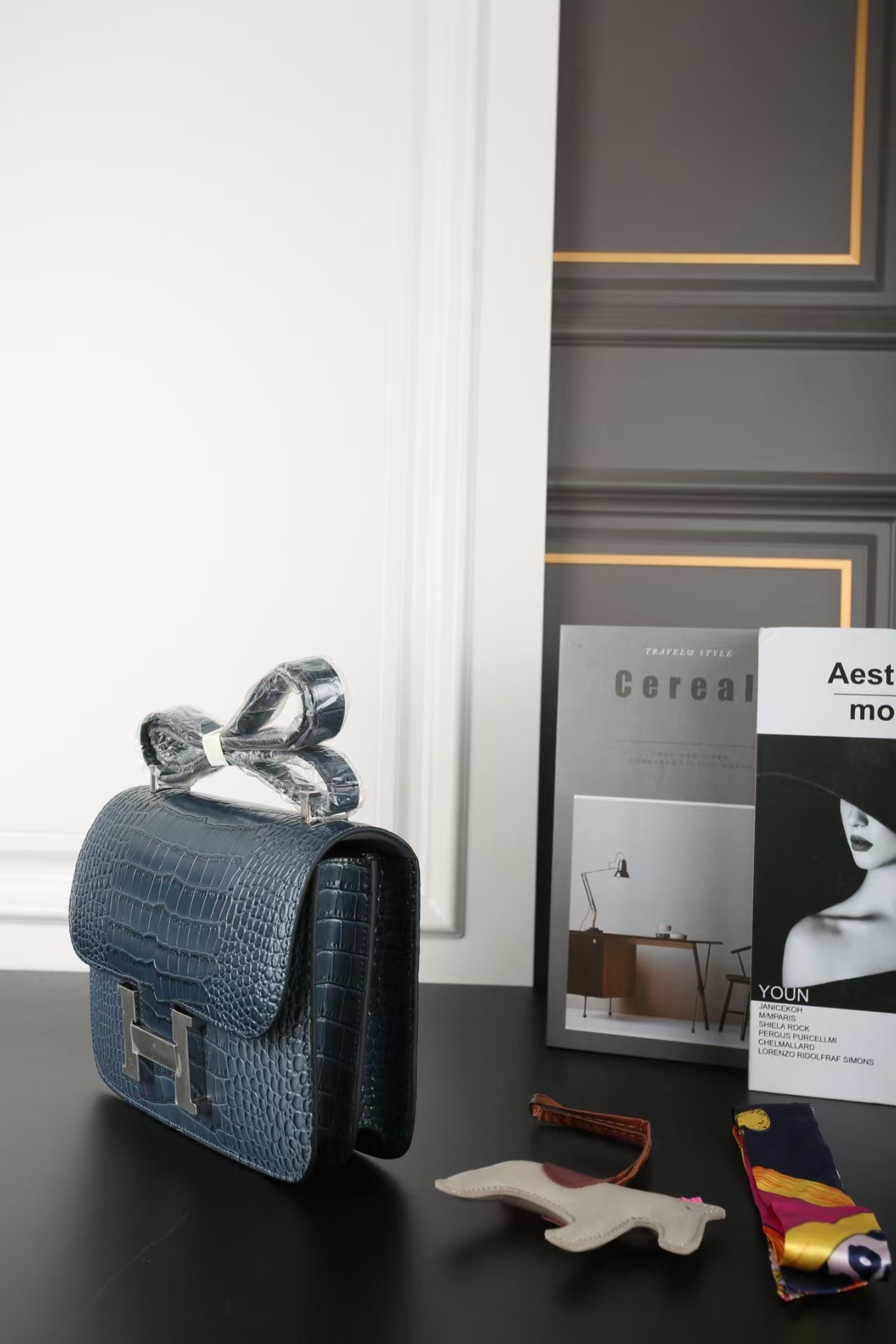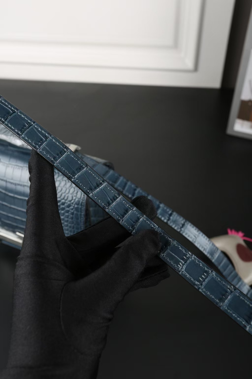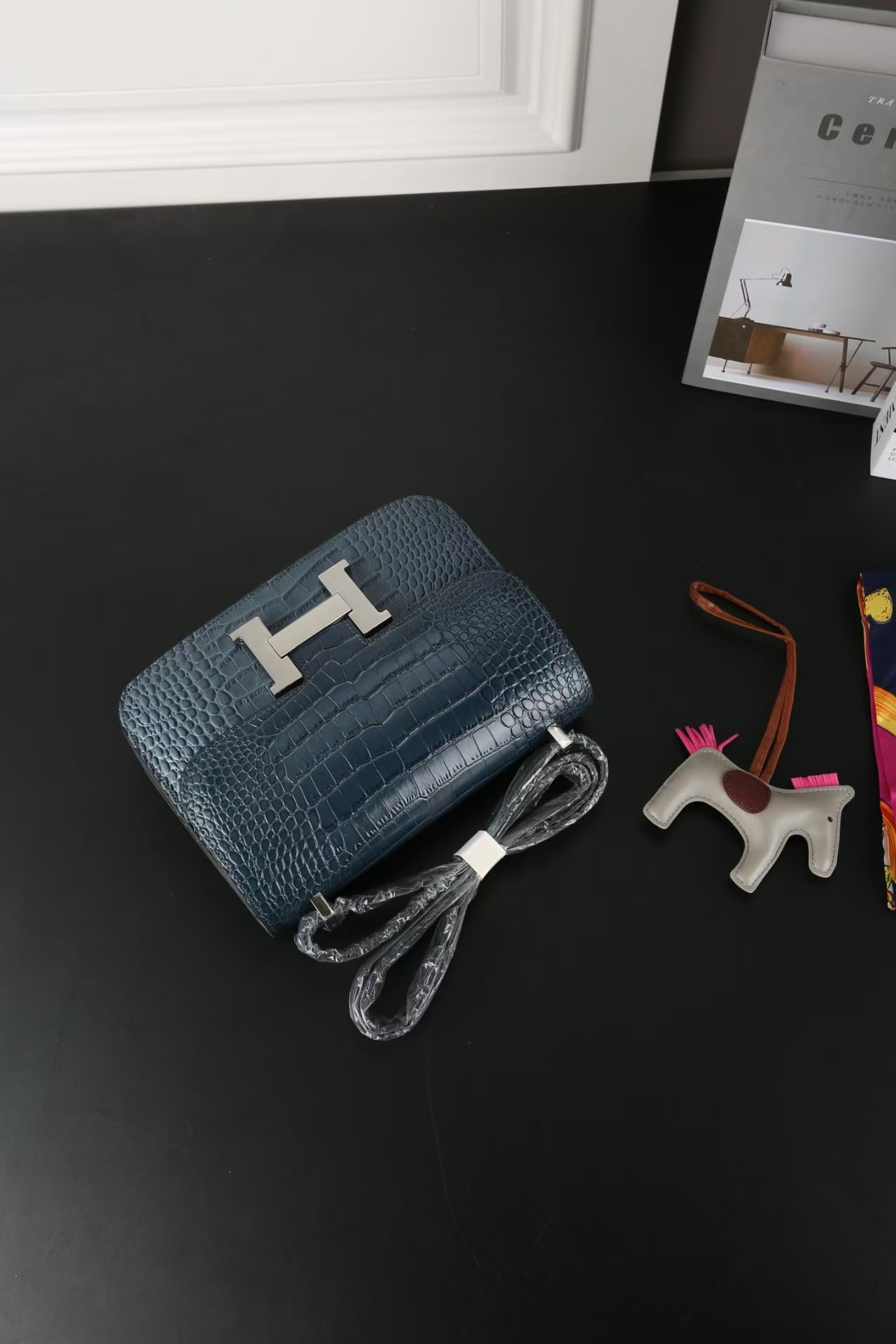 This Constance 1-24 is in Bleu Saphir Matte Alligator Mississippiensis leather with Marquette and palladium hardware and has tonal stitching, a metal "H" snap lock closure and adjustable shoulder strap.