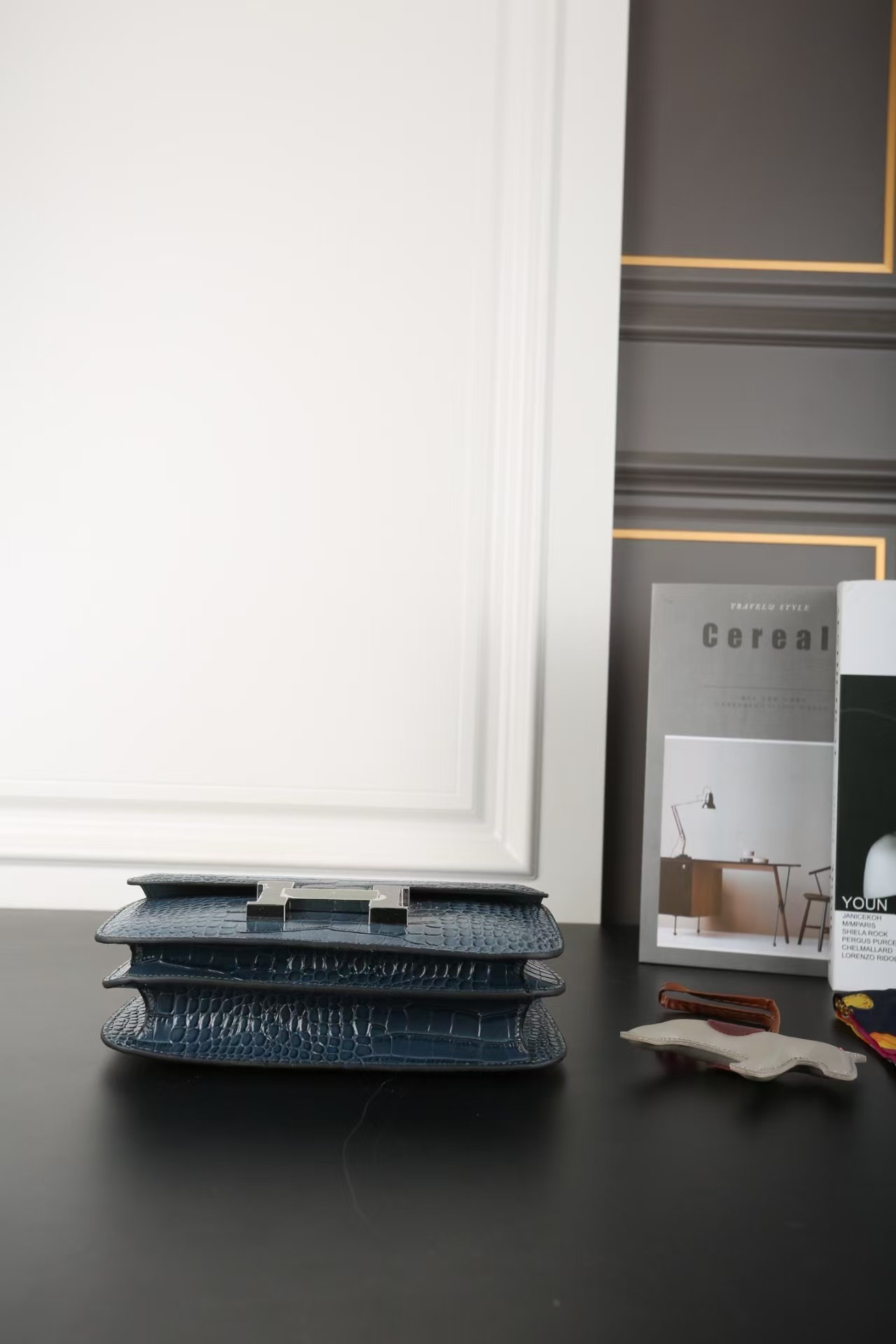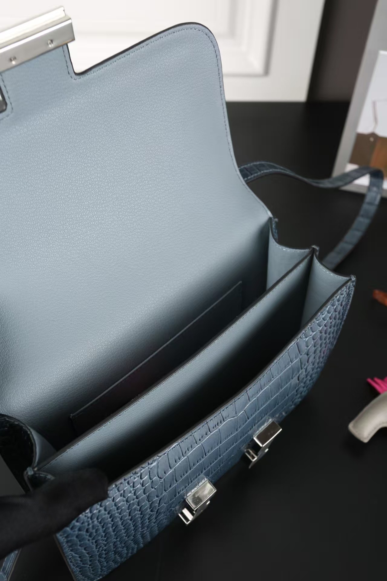 The interior is lined with Bleu Saphir lambskin and has two open pockets on the front wall, one with a removable mirror, and a back zip pocket.