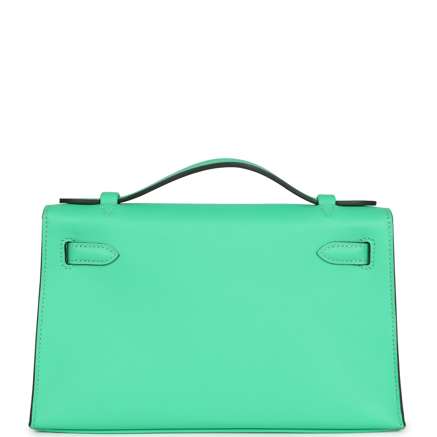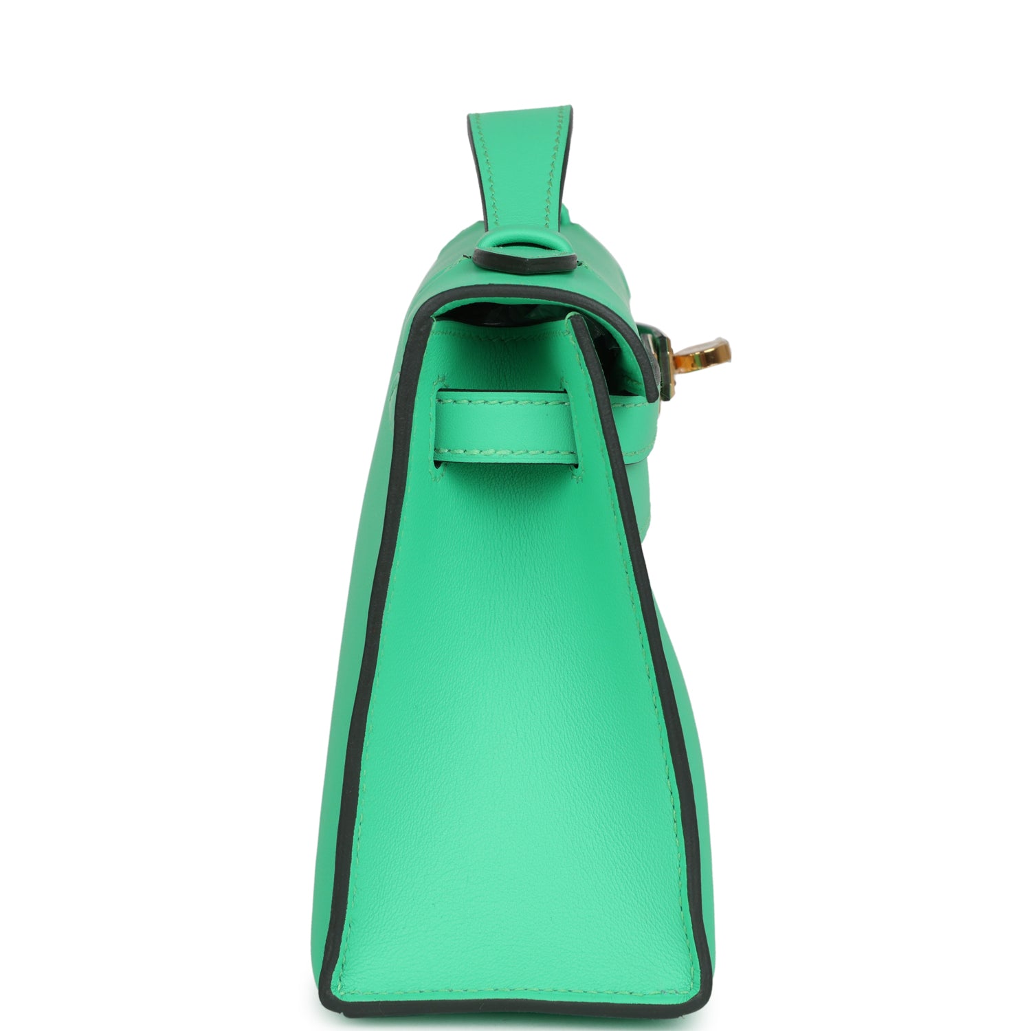 This Kelly Pochette is in Vert Comics swift leather with gold hardware and has tonal stitching, front flap, two straps with center toggle closure and a top flat handle.