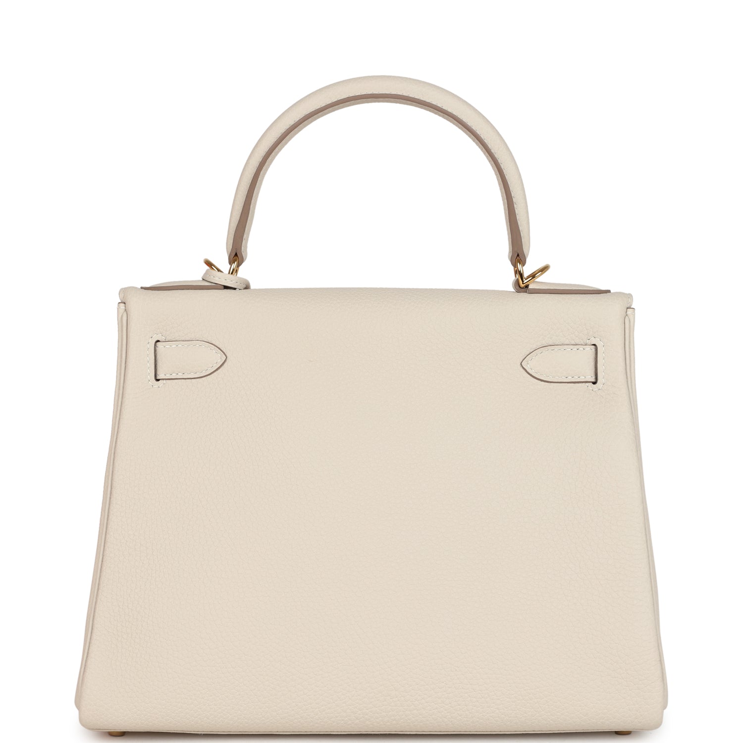 This Kelly, in the Retourne?style, is in?Craie togo leather with gold hardware and has tonal?stitching,front flap, two straps with center toggle closure, clochette with lock and two keys, single rolled handle and removable shoulder strap.