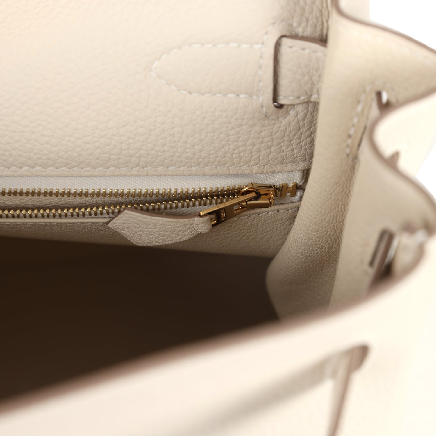 The interior is lined in?Craie chevre and has one zip pocket with Hermes engraved pull and two open pockets on the opposite side.