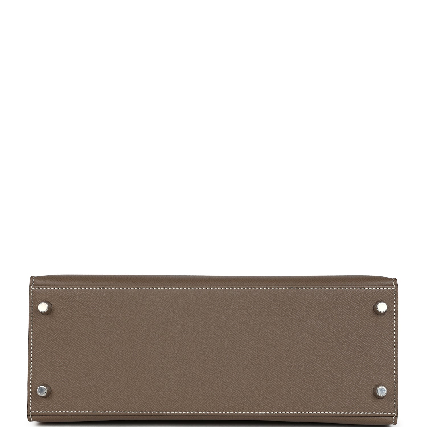 This Kelly, in the Sellier style, is in Etoupe epsom leather with palladium hardware and has contrast stitching, front flap, two straps with center toggle closure, clochette with lock and two keys, single rolled handle and removable shoulder strap.