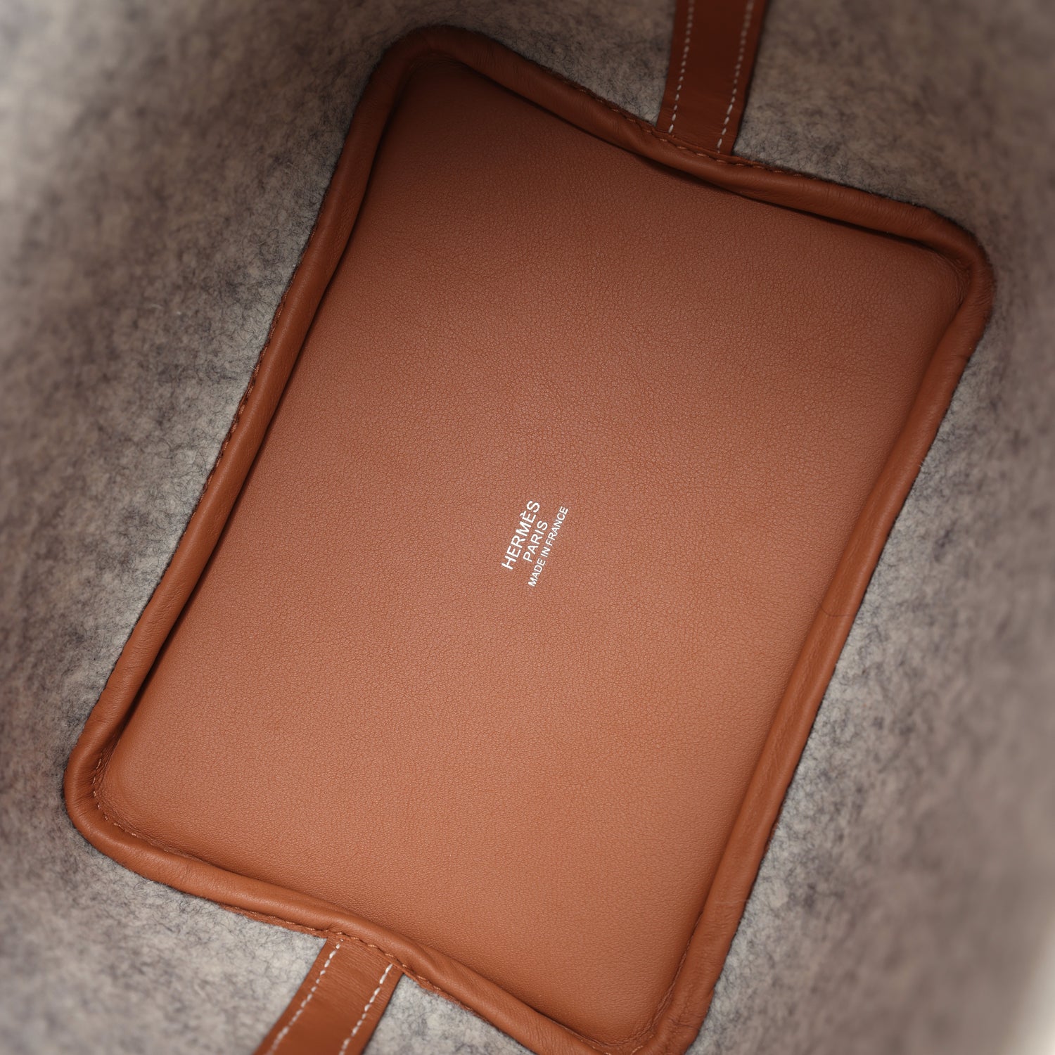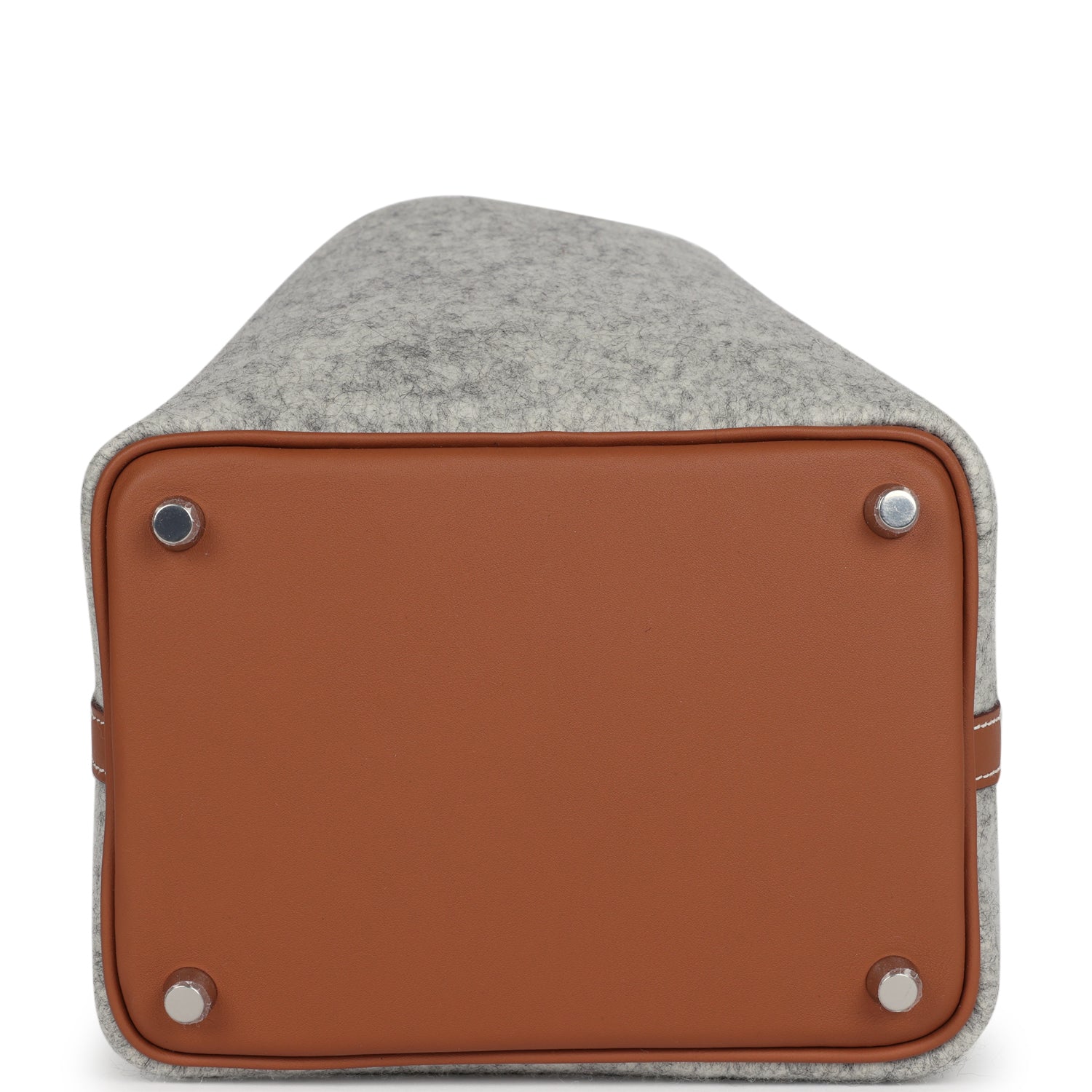 This Picotin Lock is in Gris Clair Feutre felt and Gold swift leather with palladium hardware and has contrast stitching with two top handles, lock and two keys.