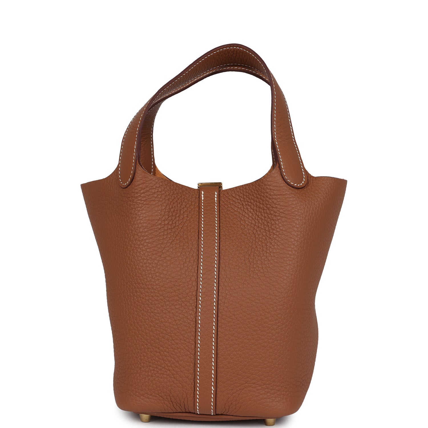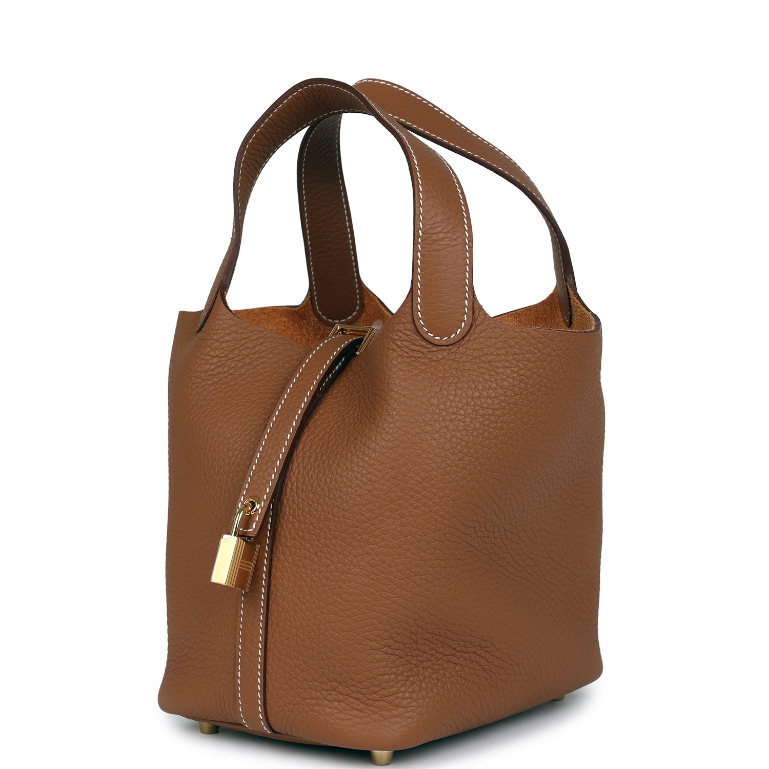 This Picotin Lock is in Gold clemence leather with gold hardware and has contrast stitching with two top handles.